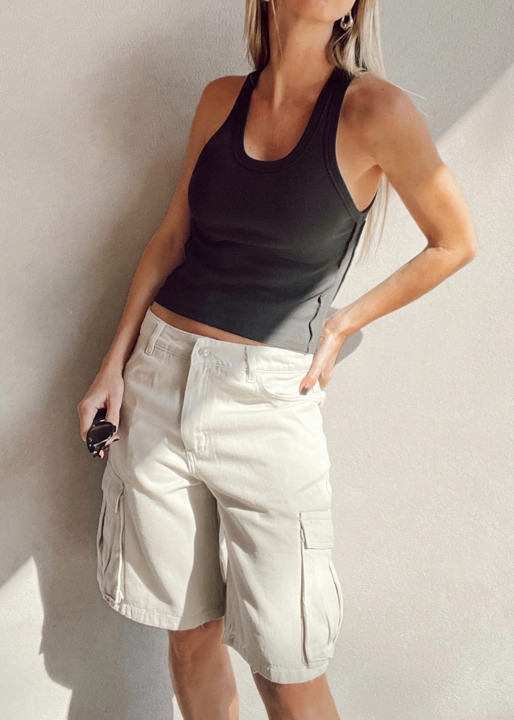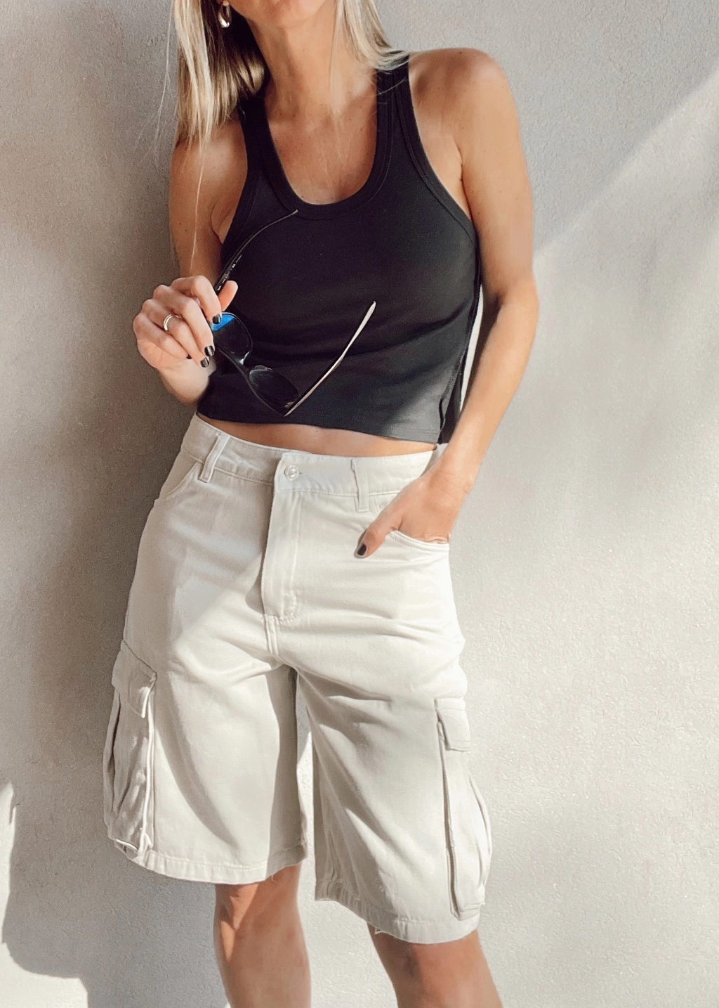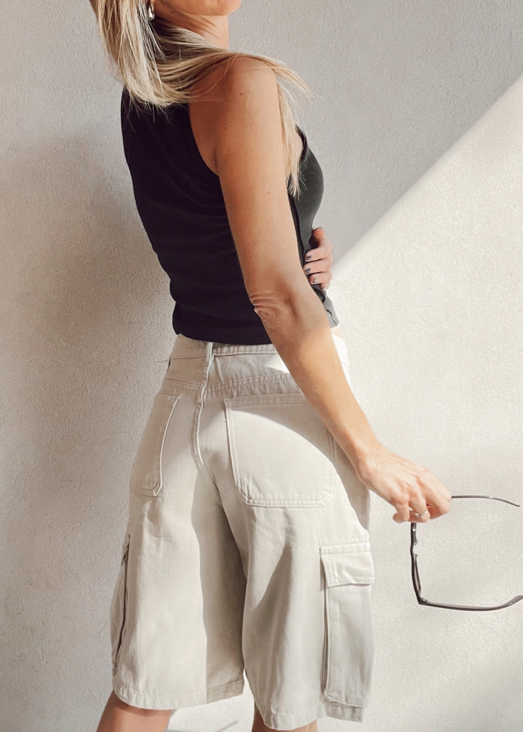 Bermuda cargo con bolsillos a los laterales con tapa, y bolsillos traseros. Posee presillas y botón metálico.