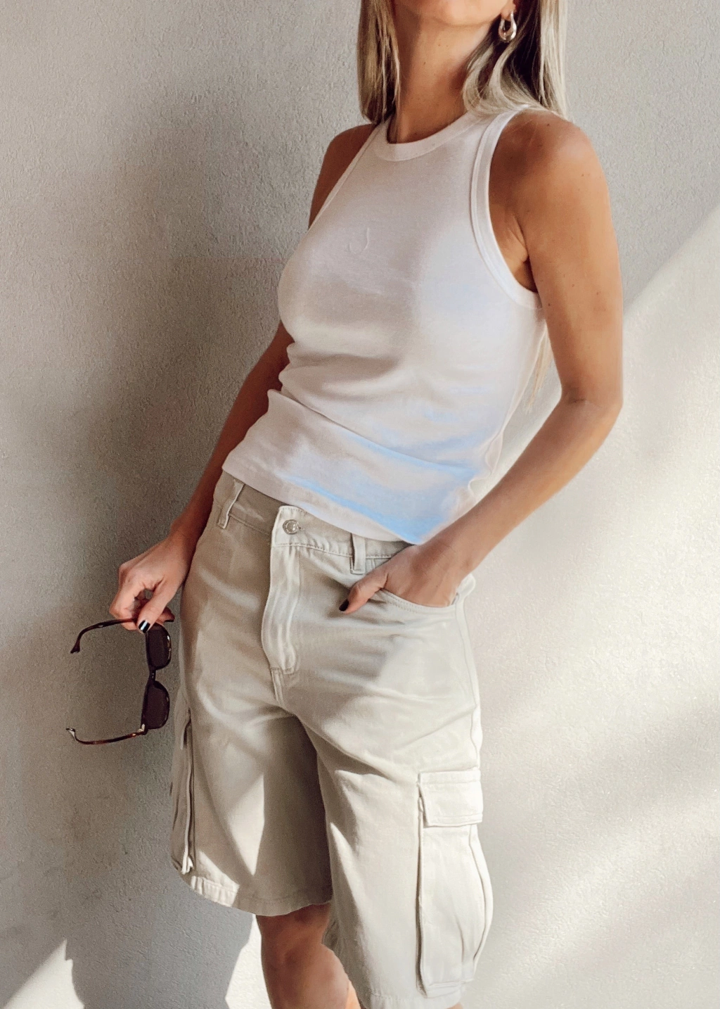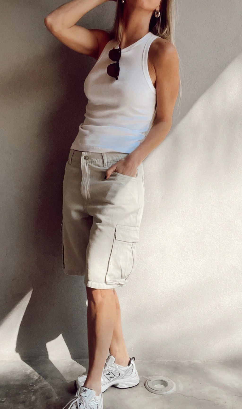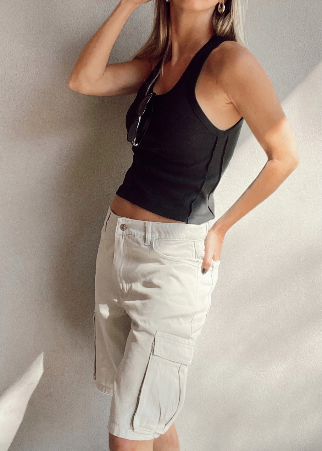 Bermuda cargo con bolsillos a los laterales con tapa, y bolsillos traseros. Posee presillas y botón metálico.