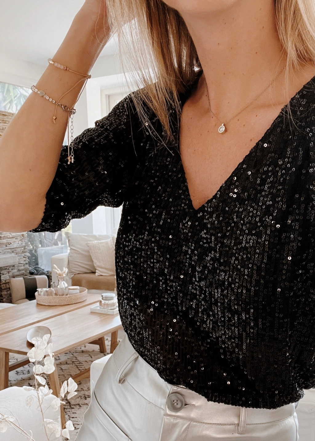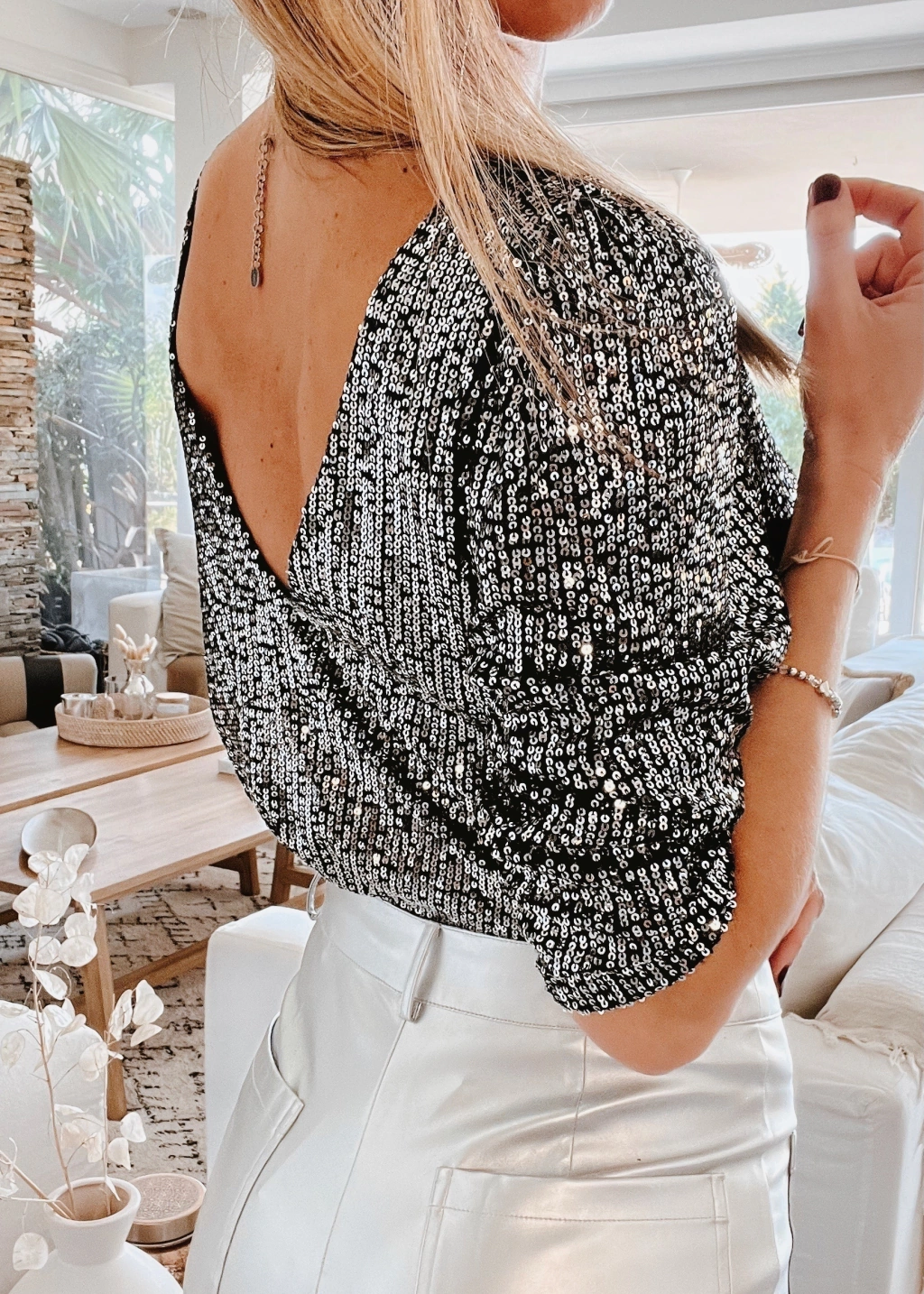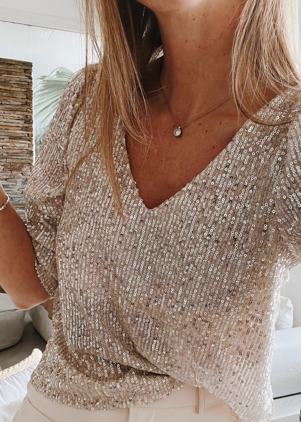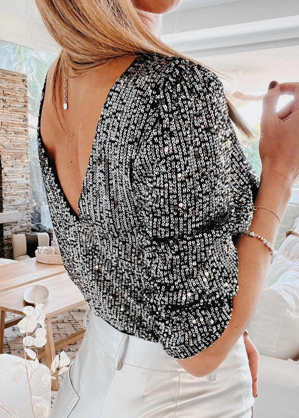 Blusa escote v y espalda tambien en V profundo, manga 3/4 de lentejuelas.