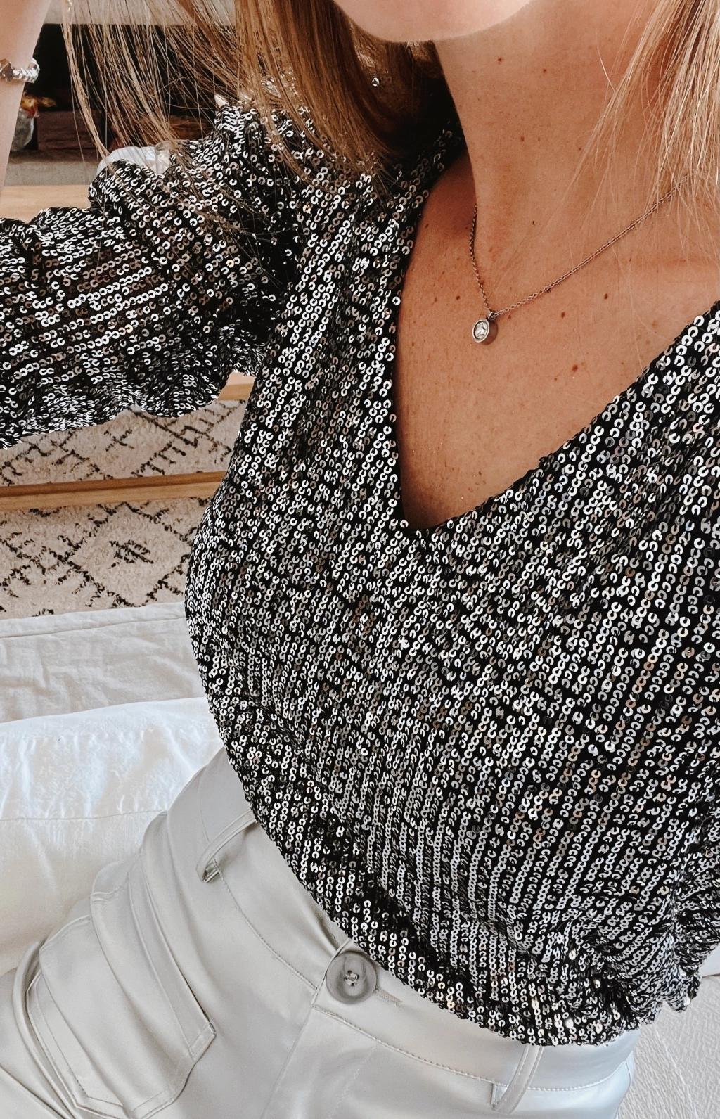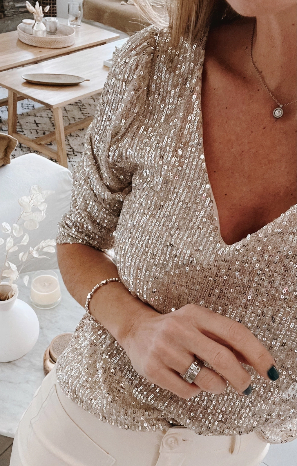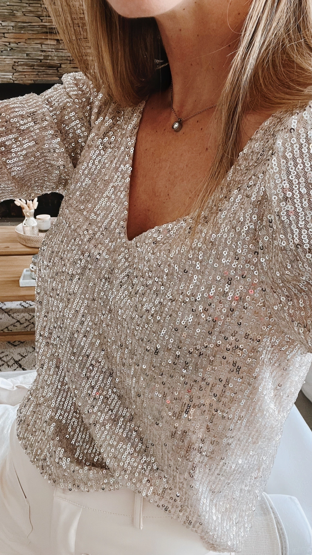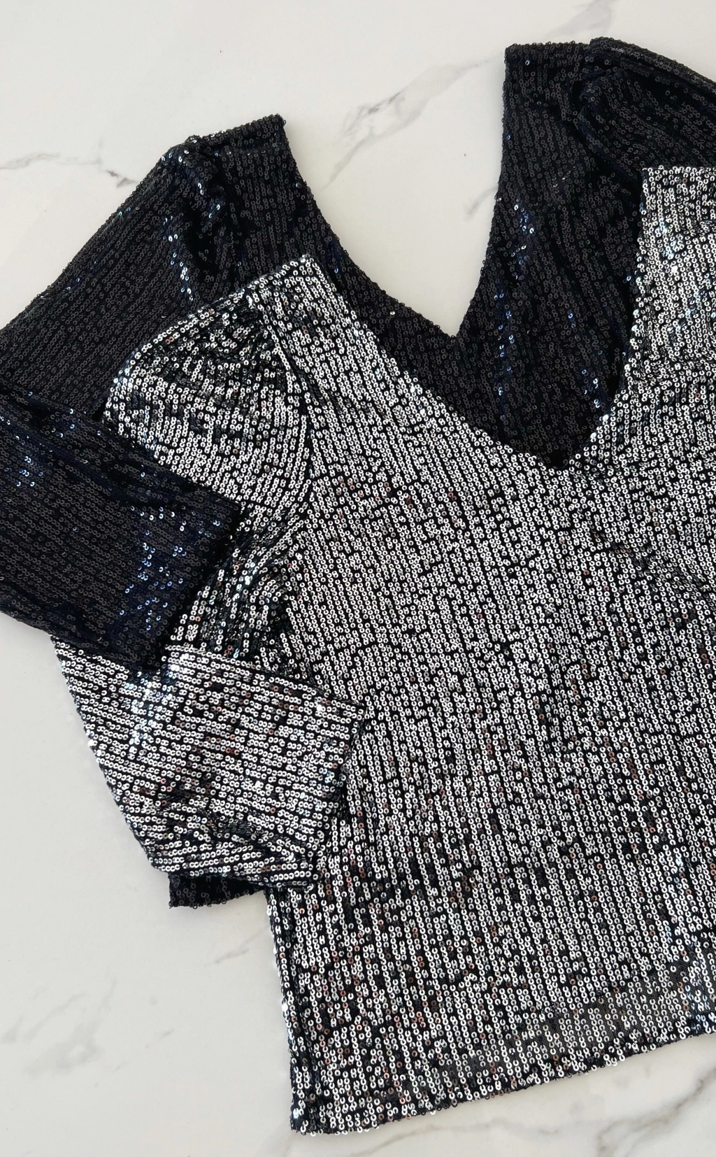 Blusa escote v y espalda tambien en V profundo, manga 3/4 de lentejuelas.