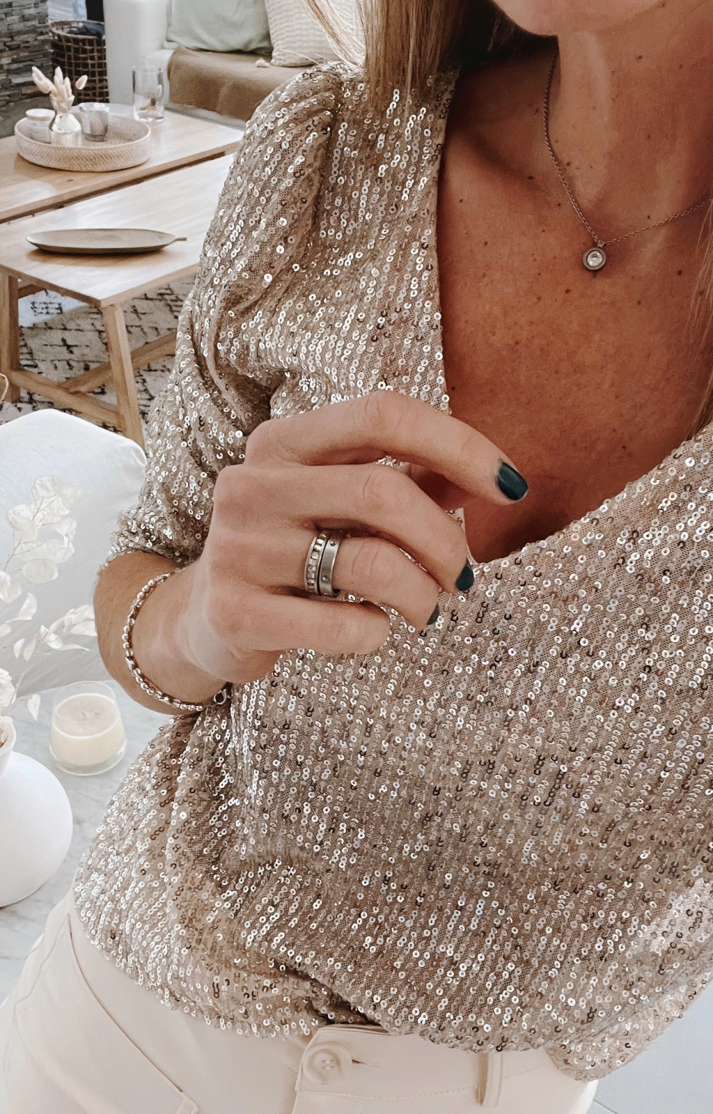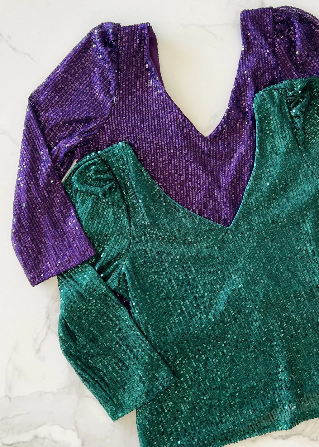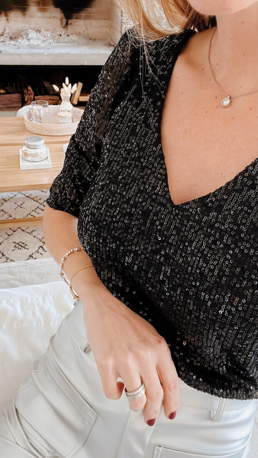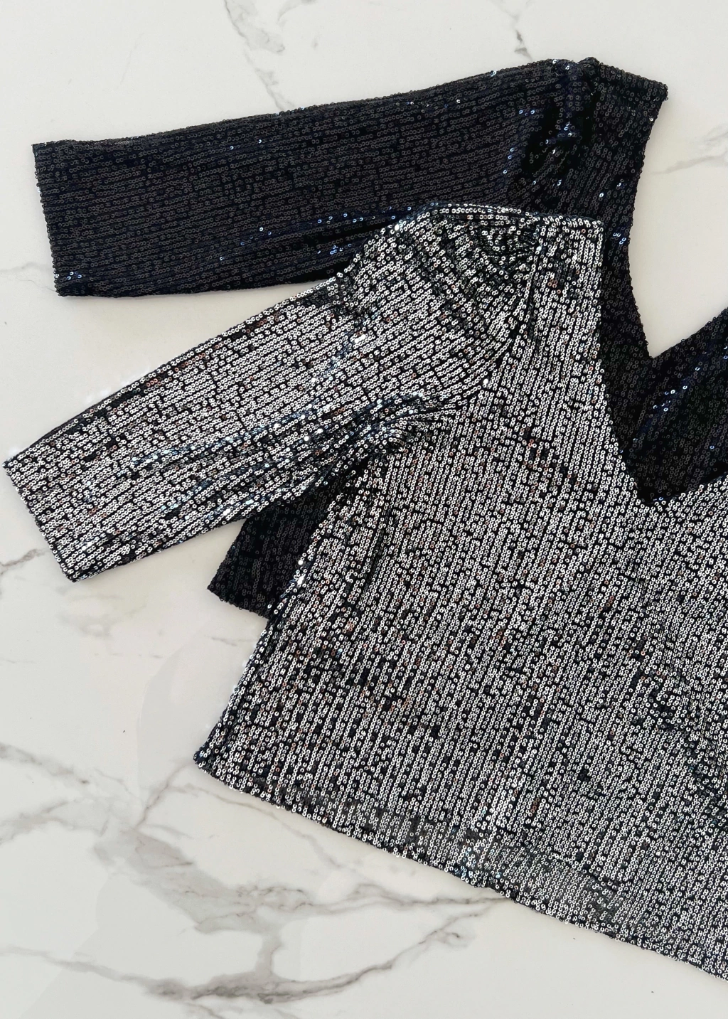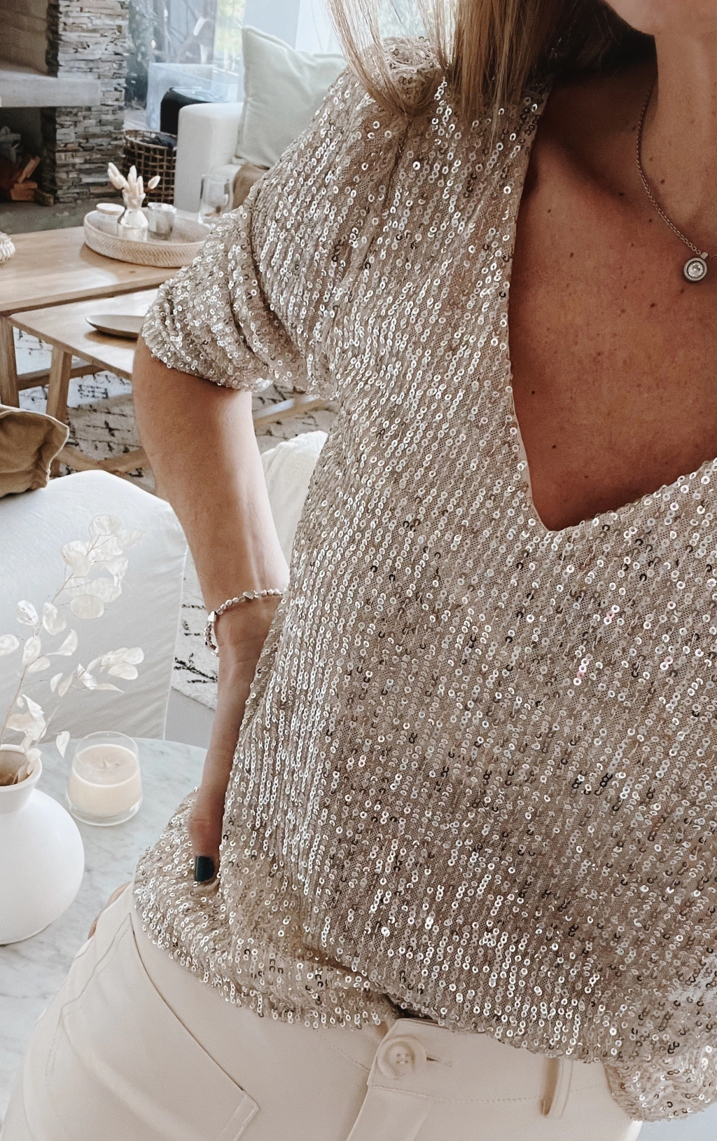 Blusa escote v y espalda tambien en V profundo, manga 3/4 de lentejuelas.