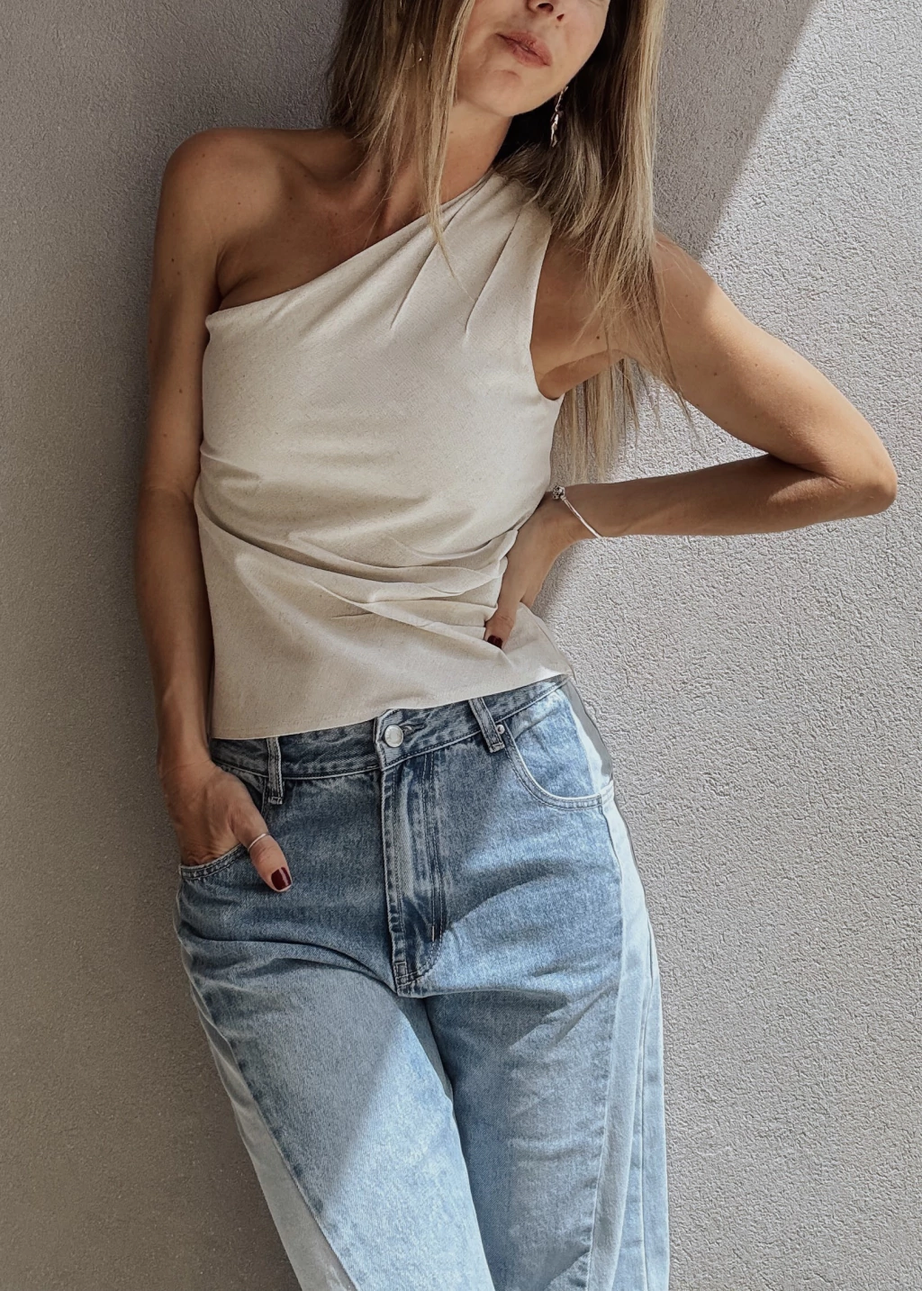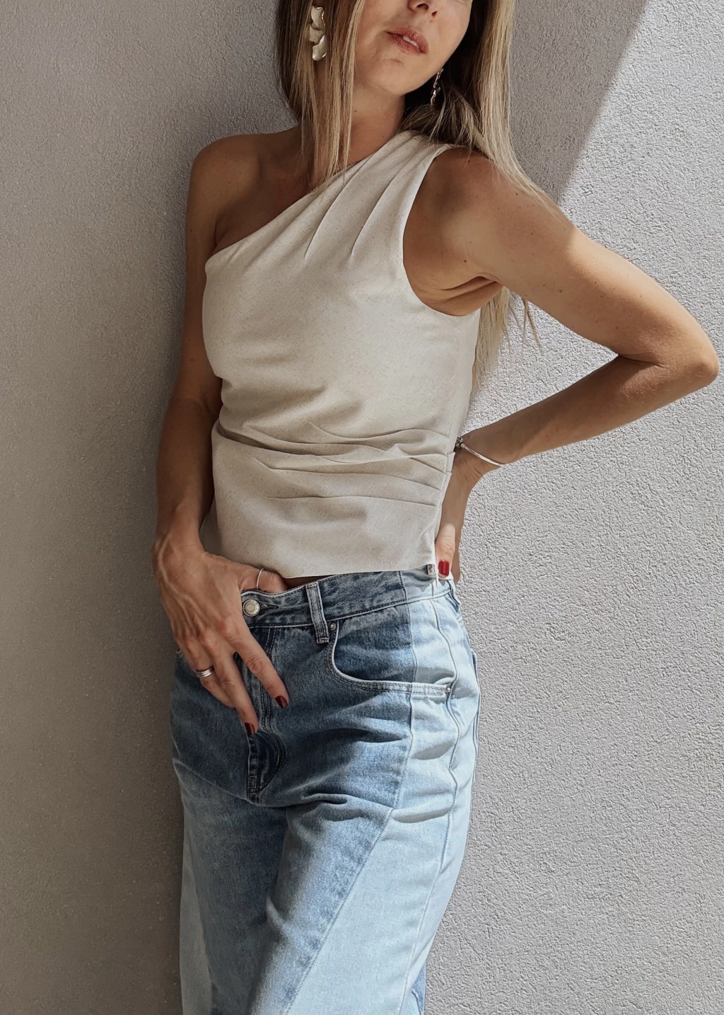 Blusa con torzada en un hombro, lateral drapeado con cierre invisible, al tono y terminación en pico. Posee forro en la zona del busto.