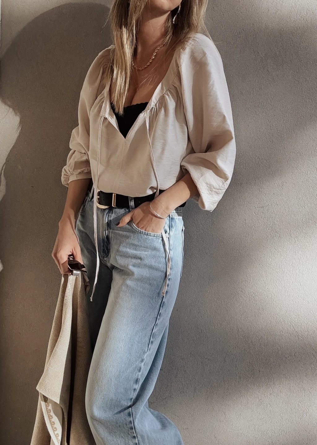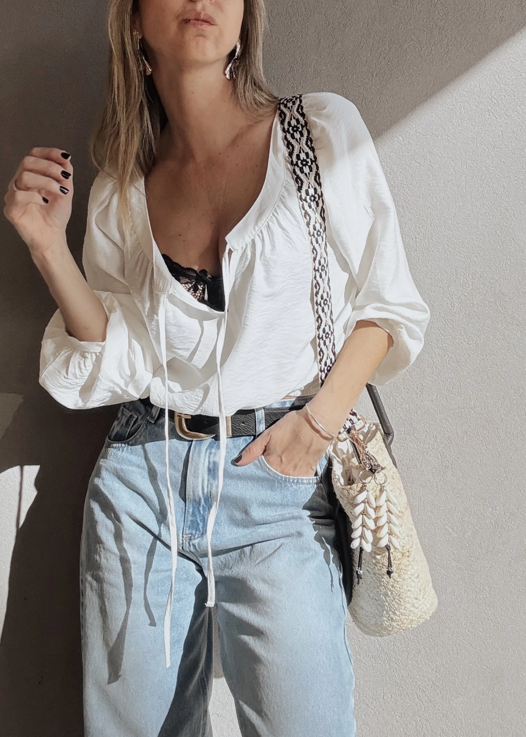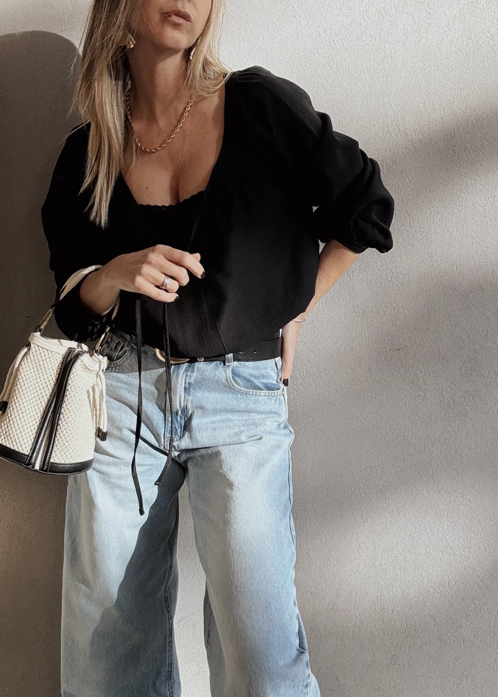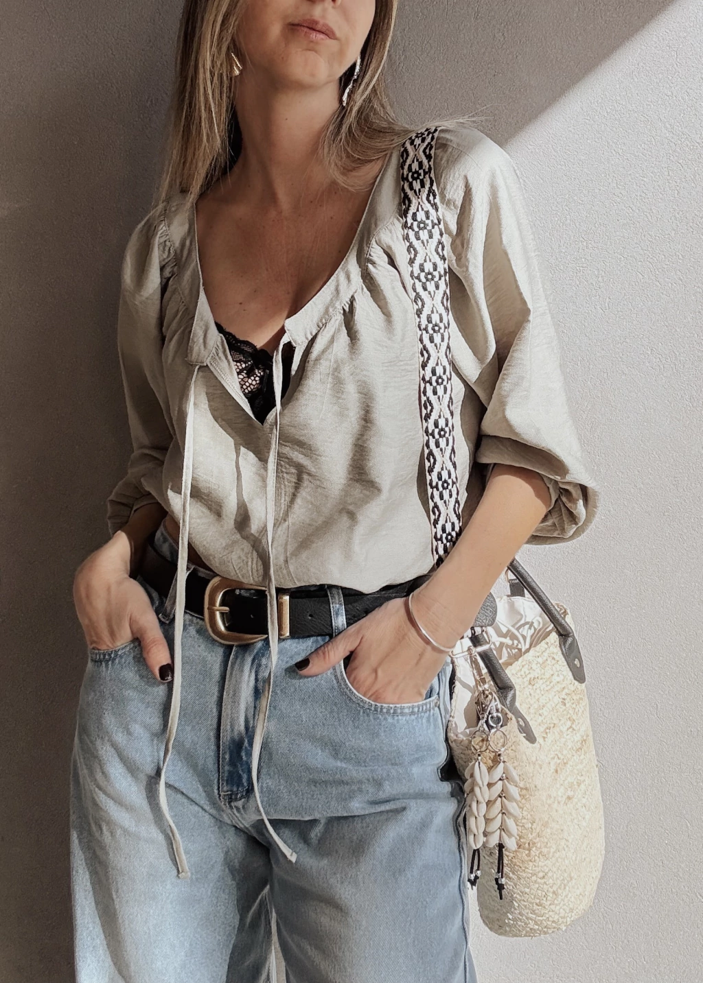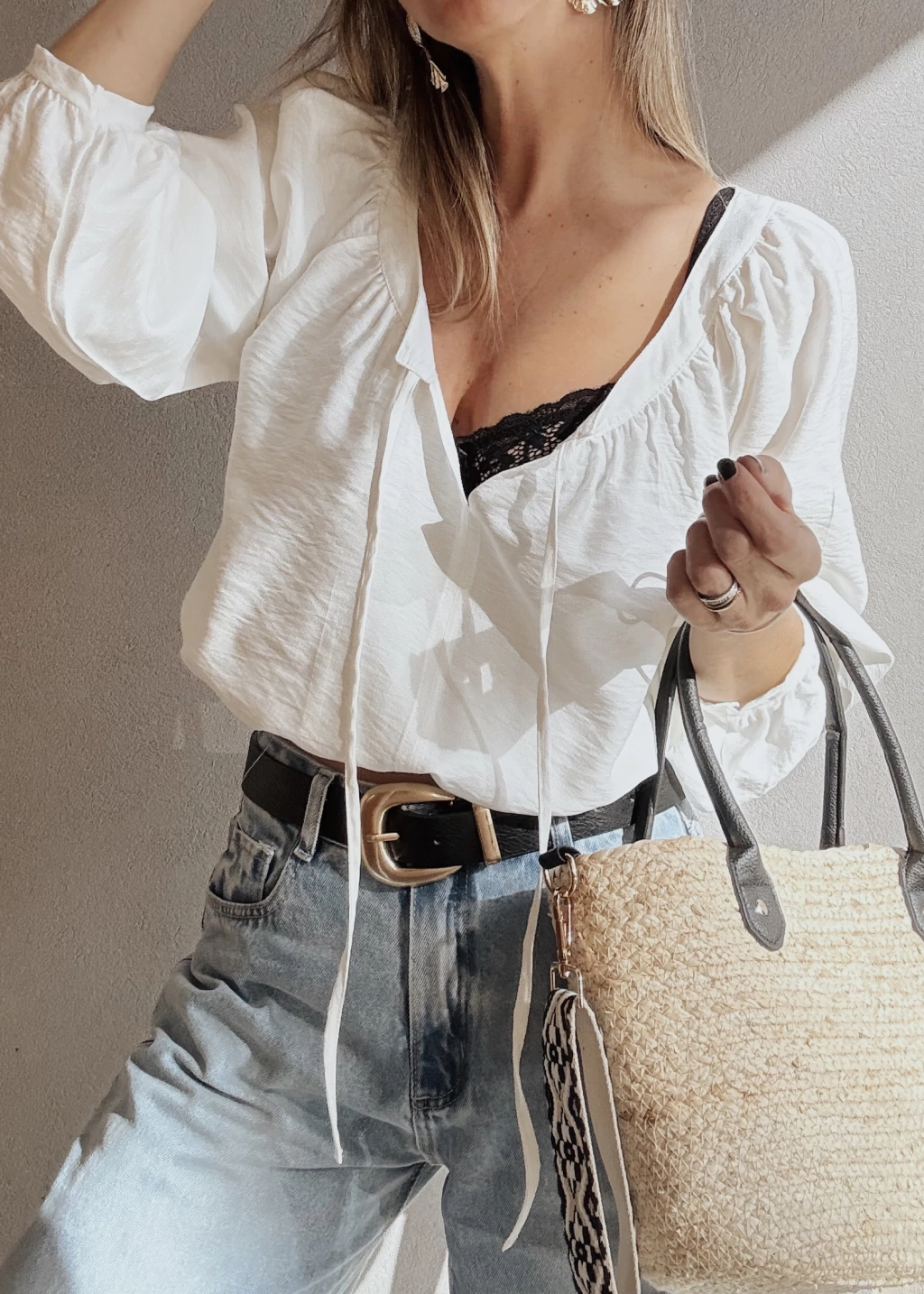 Blusa con cuello redondo profundo y lazo para estar en el escote. Cuenta con mangas ranglan tipo balloon y posee frunces en todo el escote, con elástico en la cintura, generando efecto abuchonado.