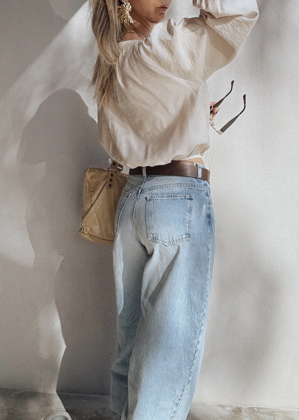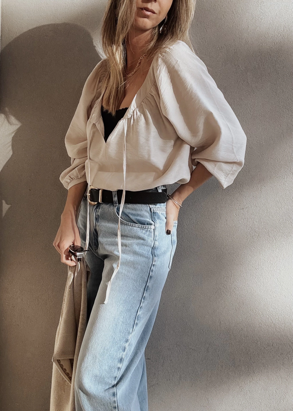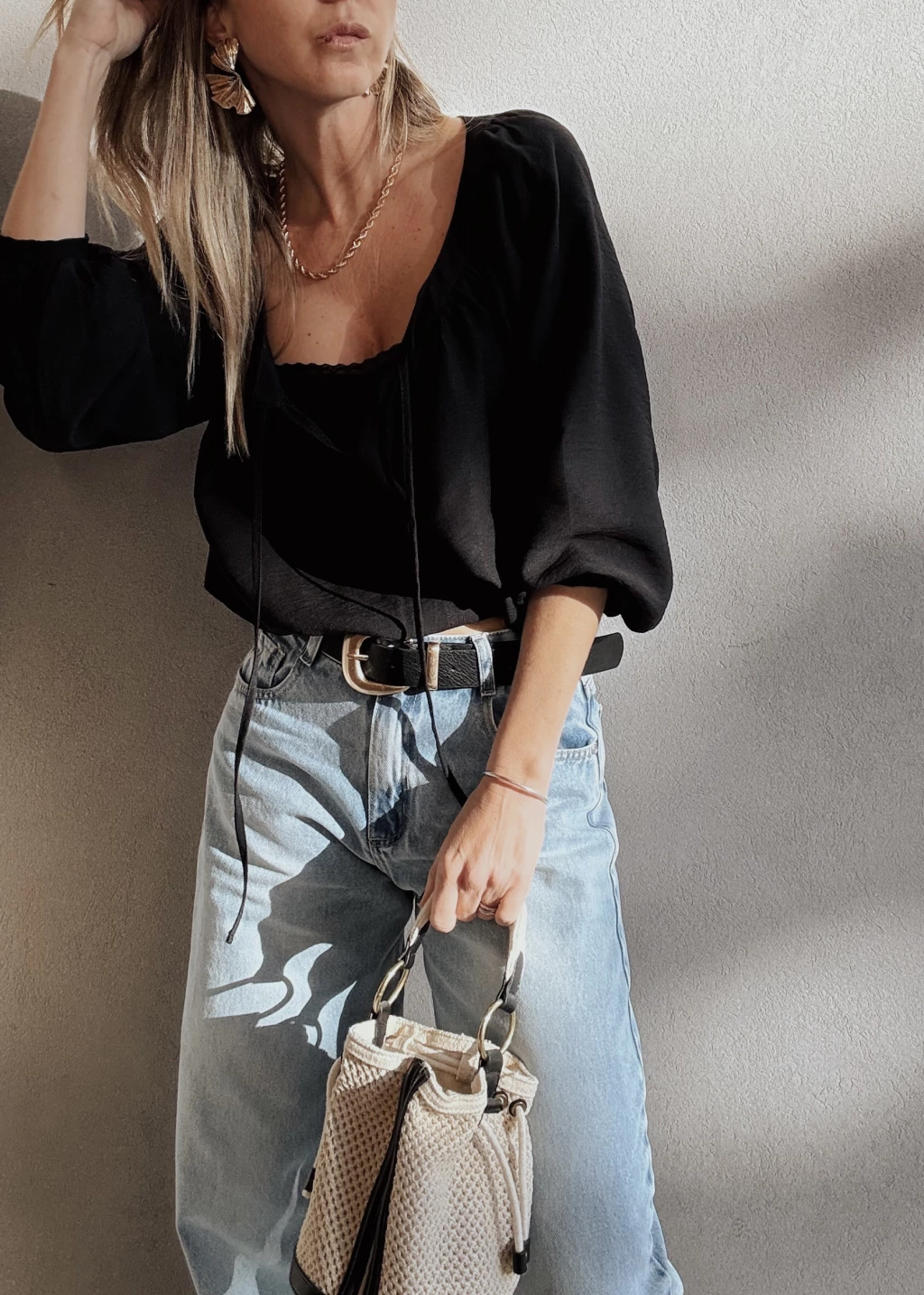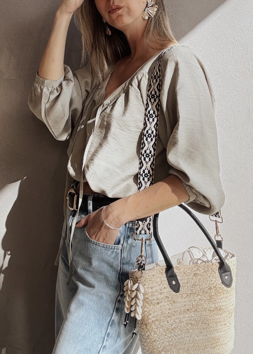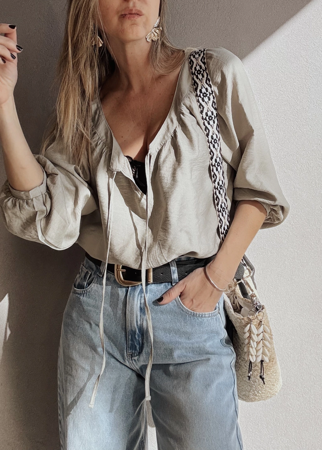 Blusa con cuello redondo profundo y lazo para estar en el escote. Cuenta con mangas ranglan tipo balloon y posee frunces en todo el escote, con elástico en la cintura, generando efecto abuchonado.