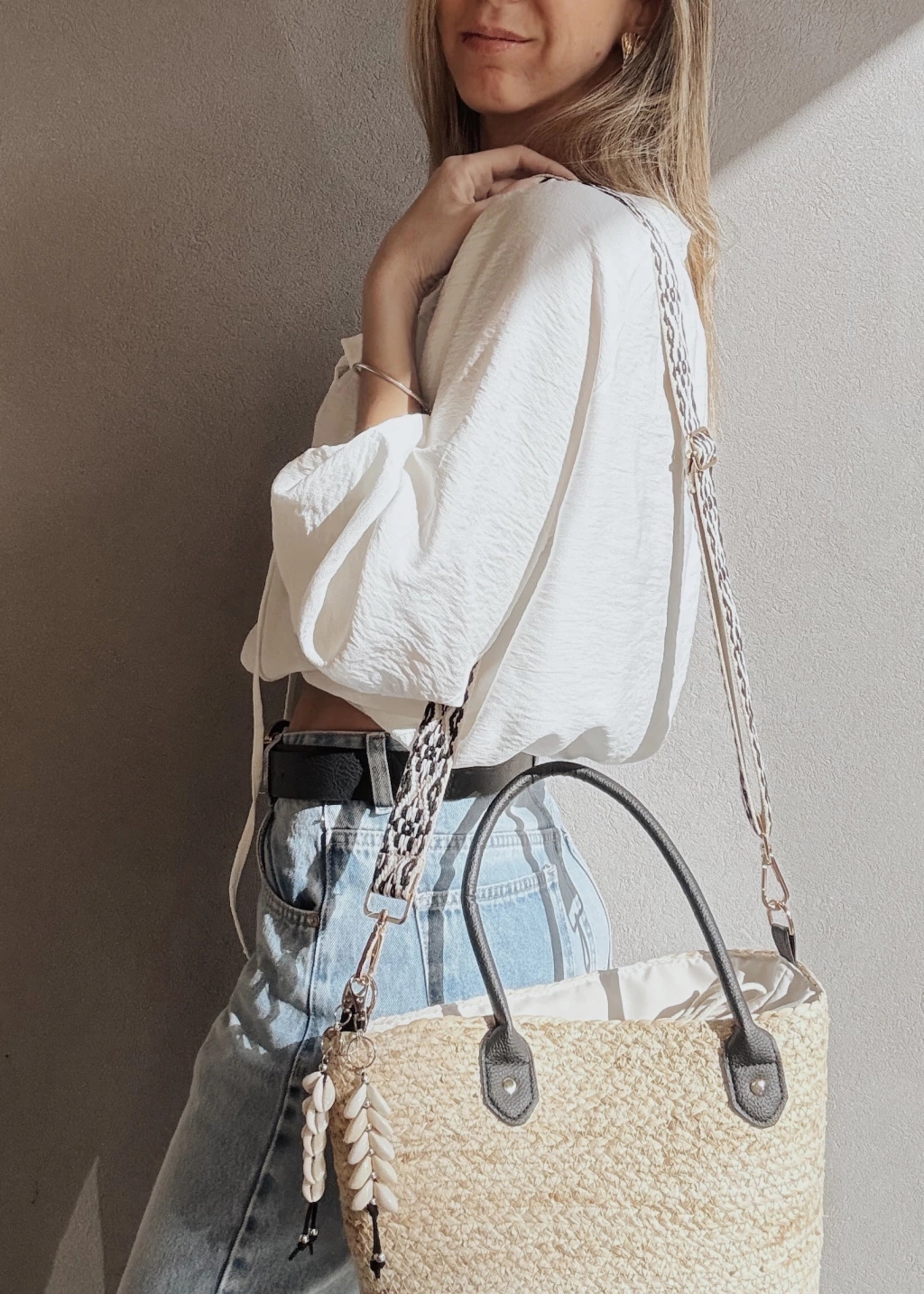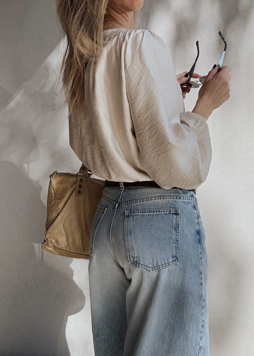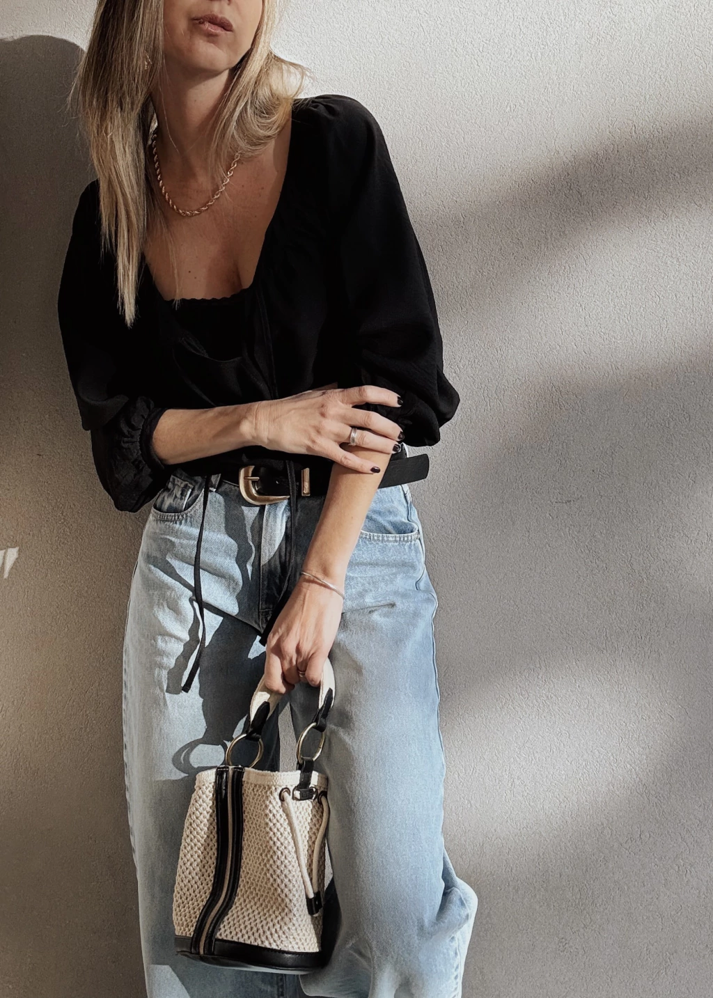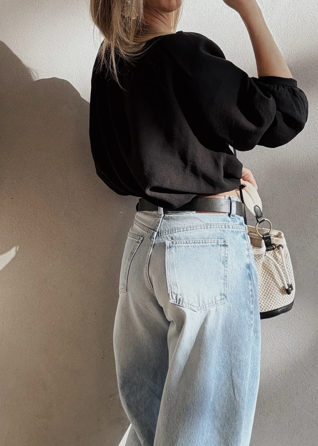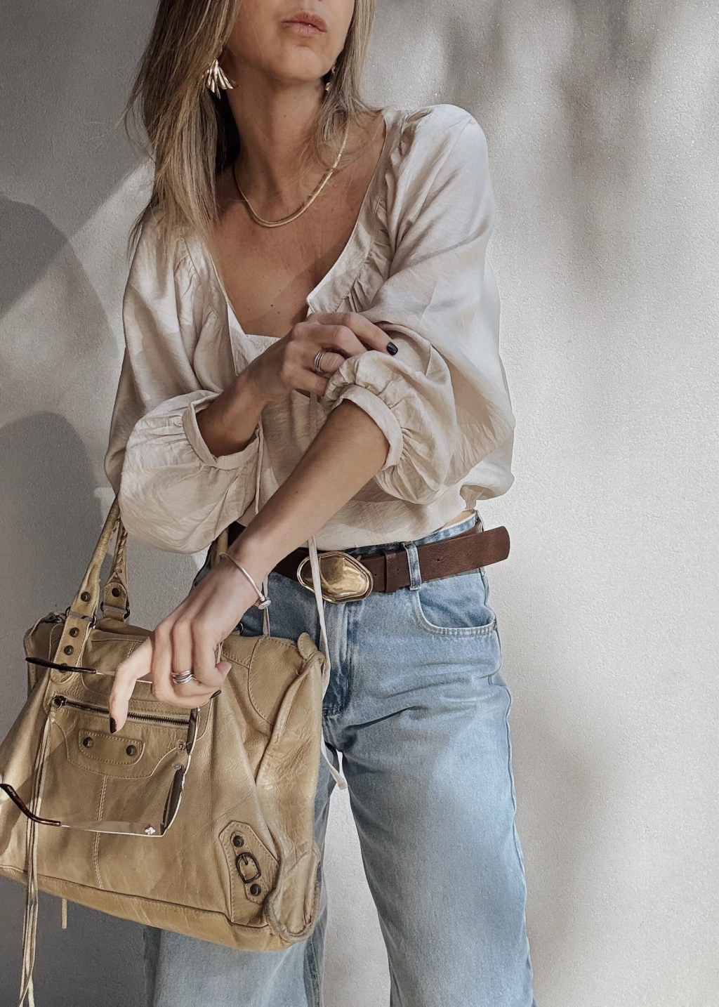 Blusa con cuello redondo profundo y lazo para estar en el escote. Cuenta con mangas ranglan tipo balloon y posee frunces en todo el escote, con elástico en la cintura, generando efecto abuchonado.