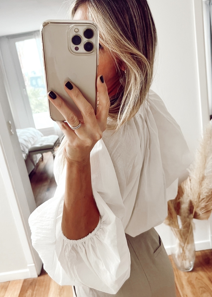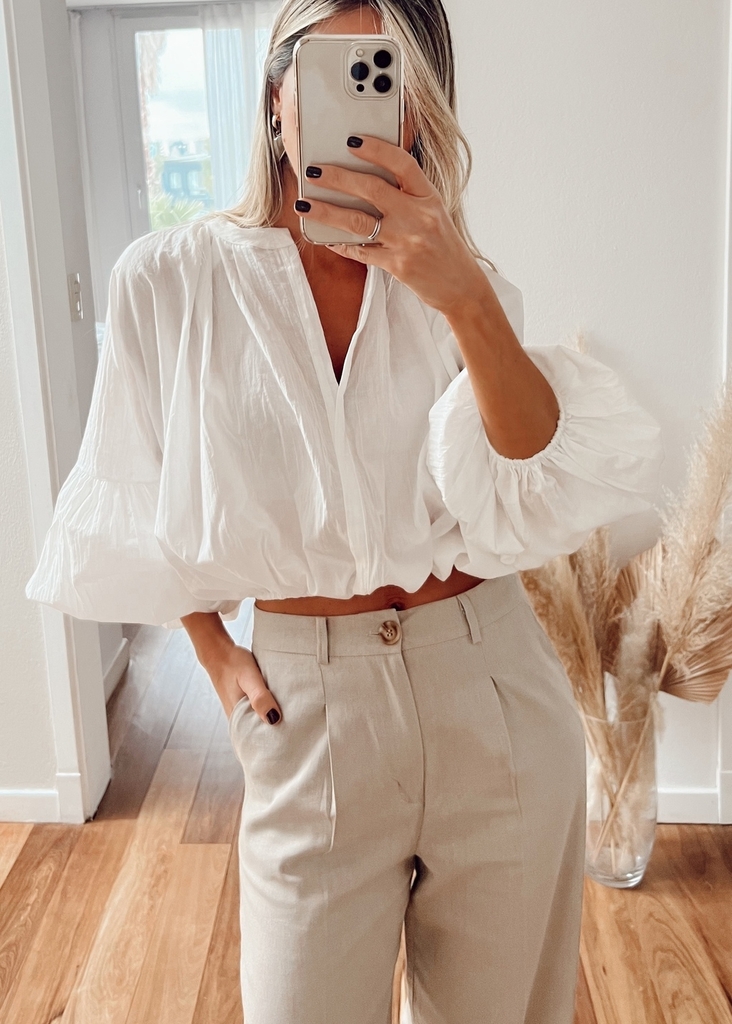 Blusa con alforzas y falsa cartera hasta la base, cuello tipo mao. Posee cintura y puños con gran elástico, corte balloon con mangas murciélago. Súper amplia.