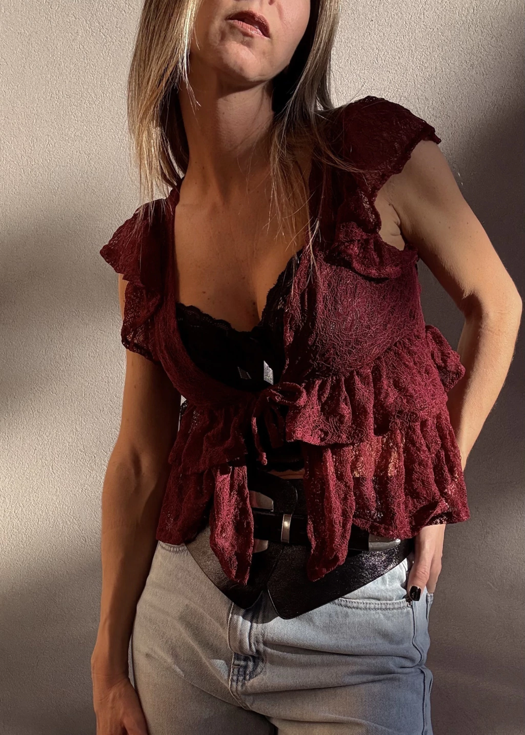 Blusa tipo top escote en V con lazo al frente. Tolerita de encaje lazo regulable en la cintura, corte princesa, con volados en la parte inferior y volados en las manguitas cortas.