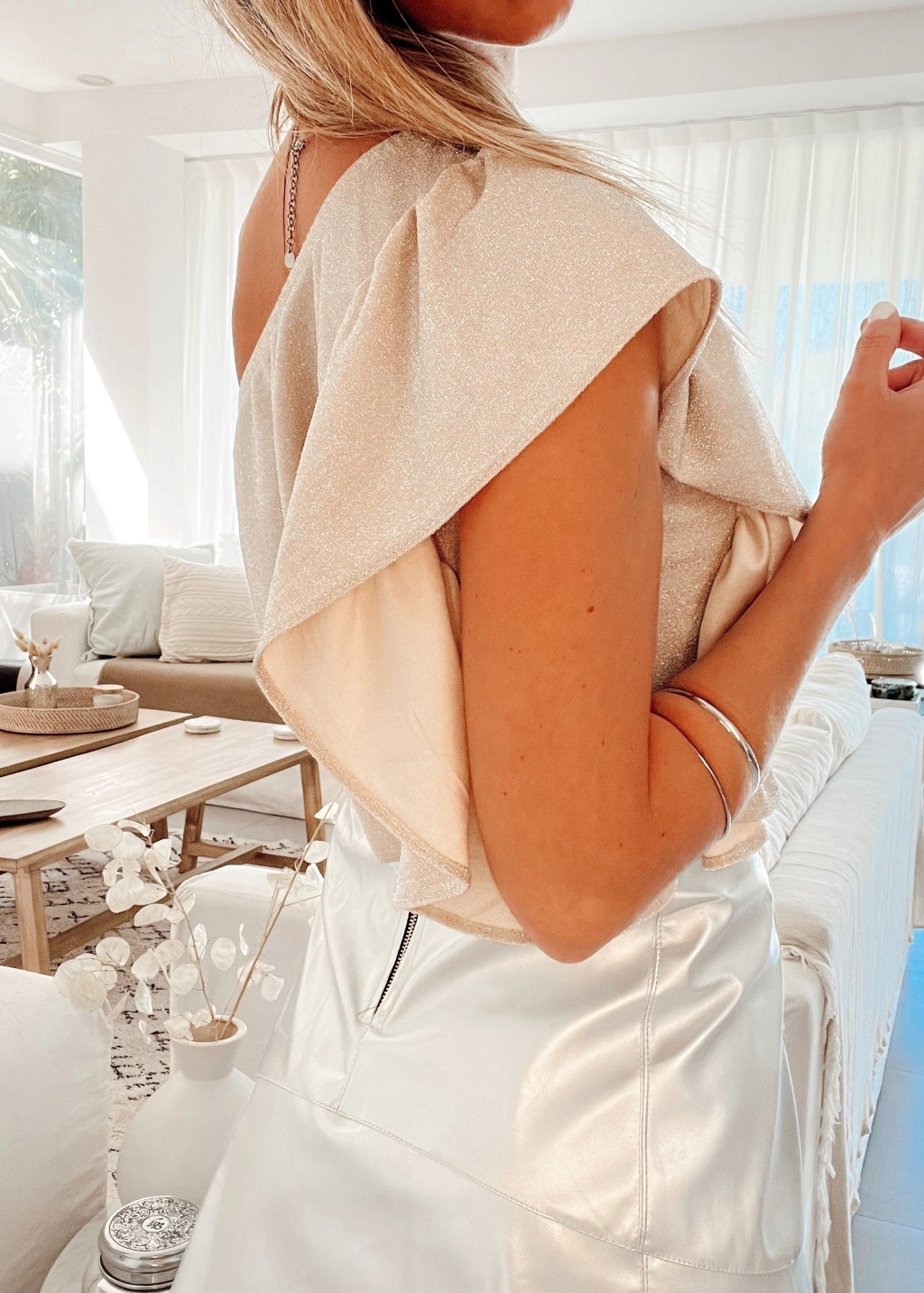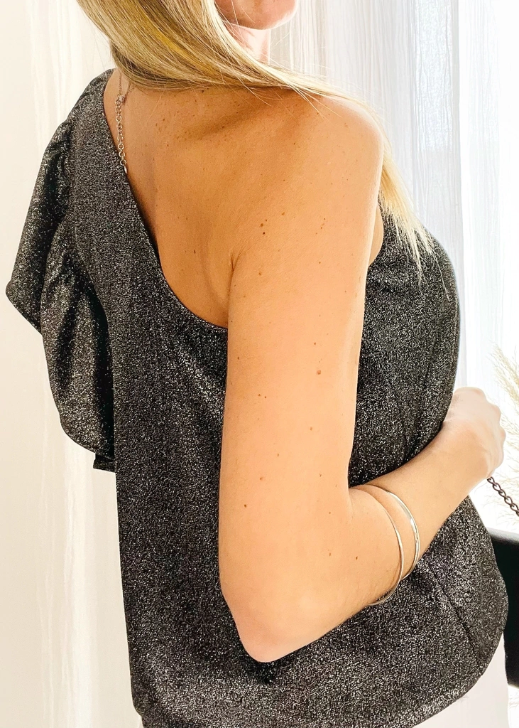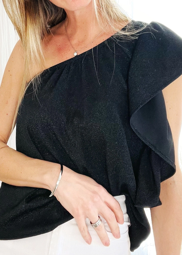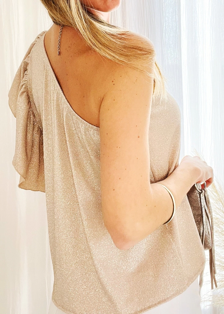 Blusa con elástico en el escote de un solo hombro, con volado. En el costado en el que se encuentra el volado posee tapa corpiño. Es suelta, no marca.