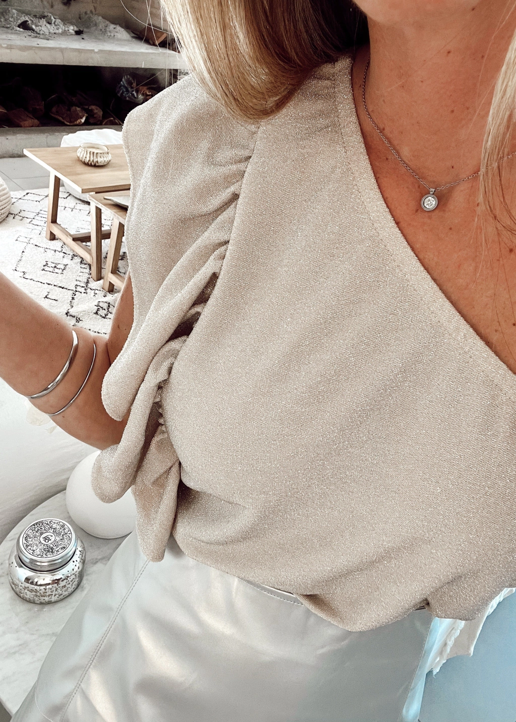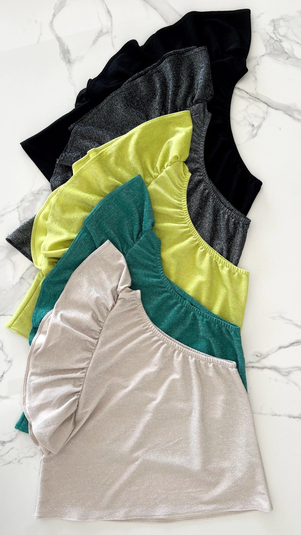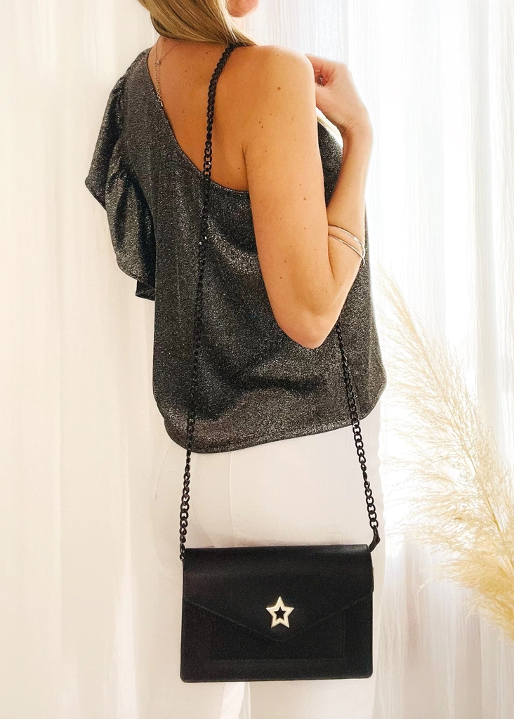 Blusa con elástico en el escote de un solo hombro, con volado. En el costado en el que se encuentra el volado posee tapa corpiño. Es suelta, no marca.
