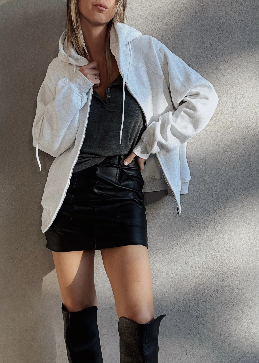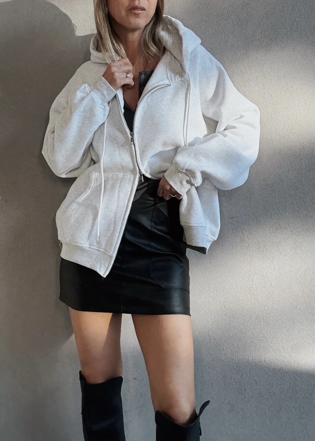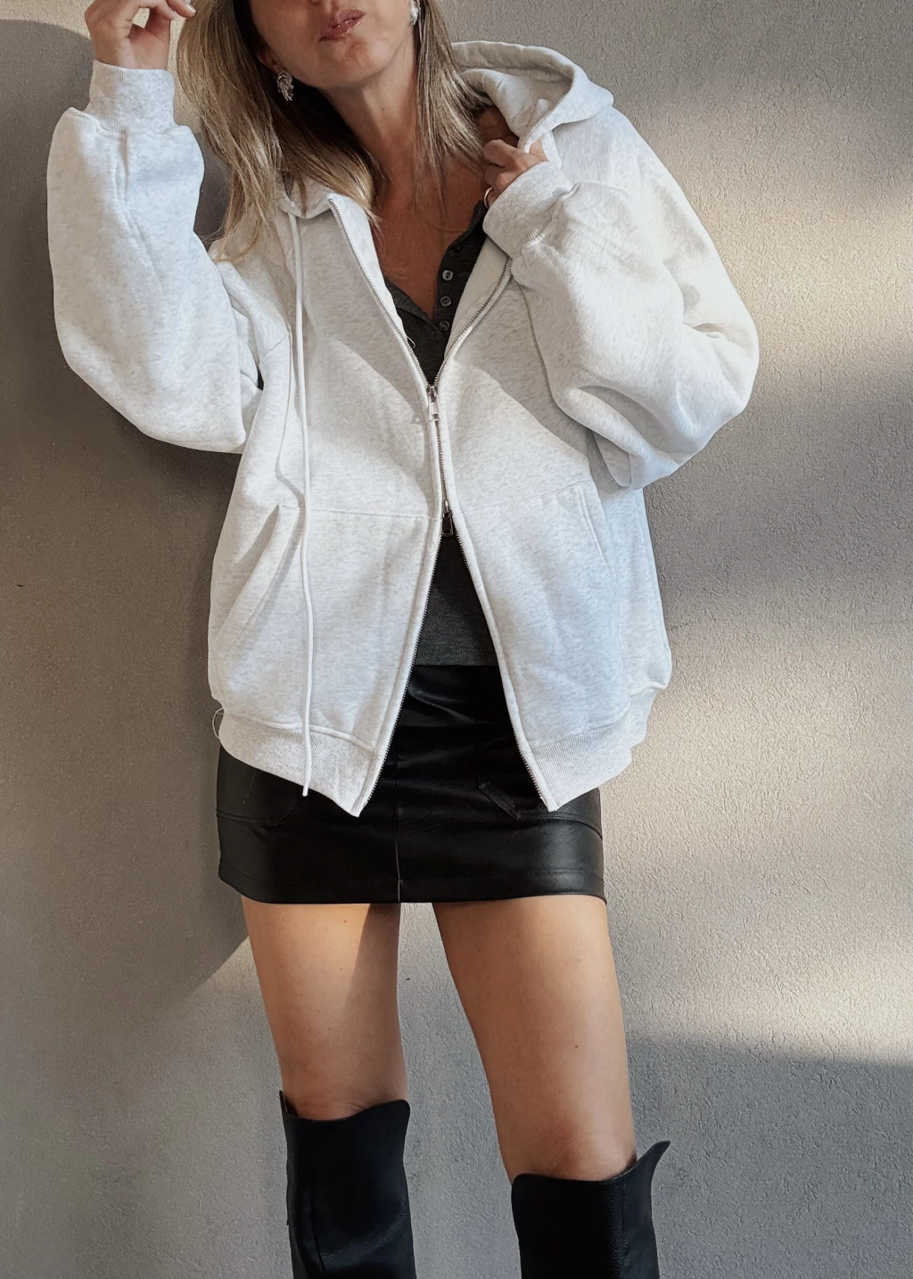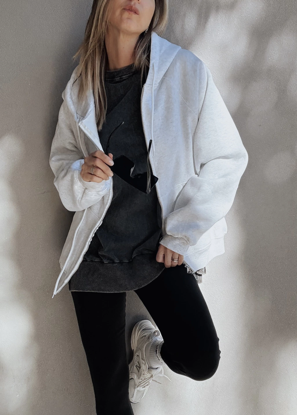 Camperita/Buzo oversize con cierre metálico y capucha con cordón regulable. Posee manga ranghlan, bolsillos al frente tipo canguro y puños en mangas y cintura.