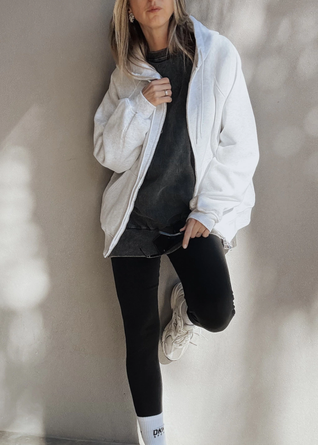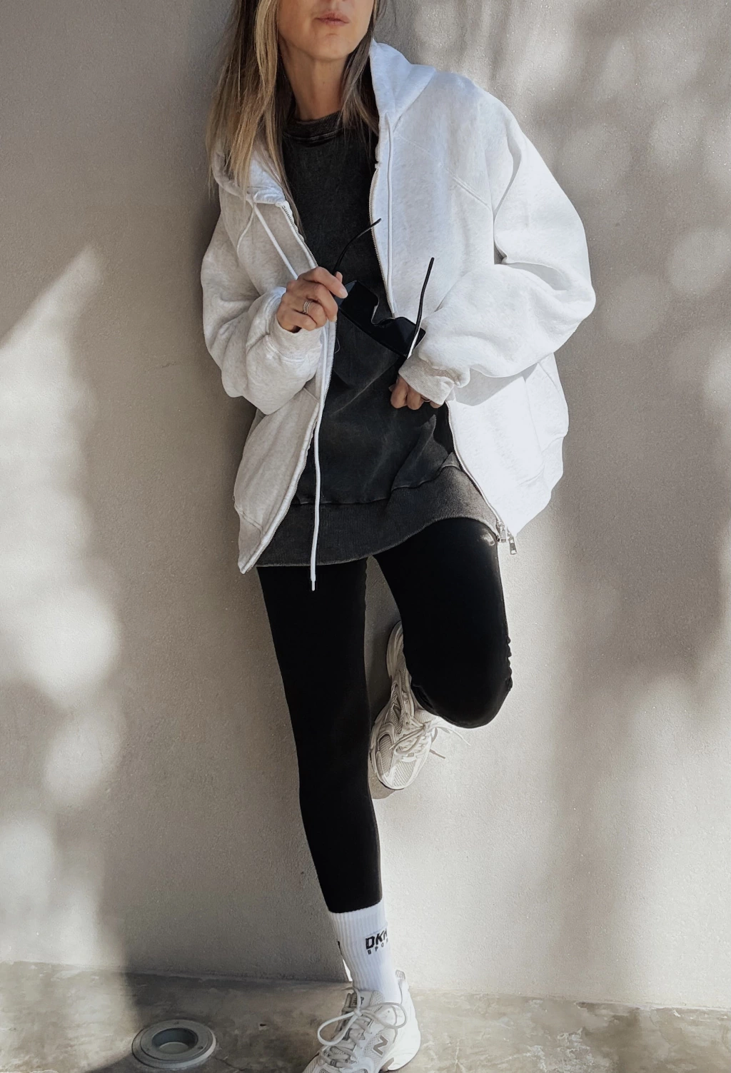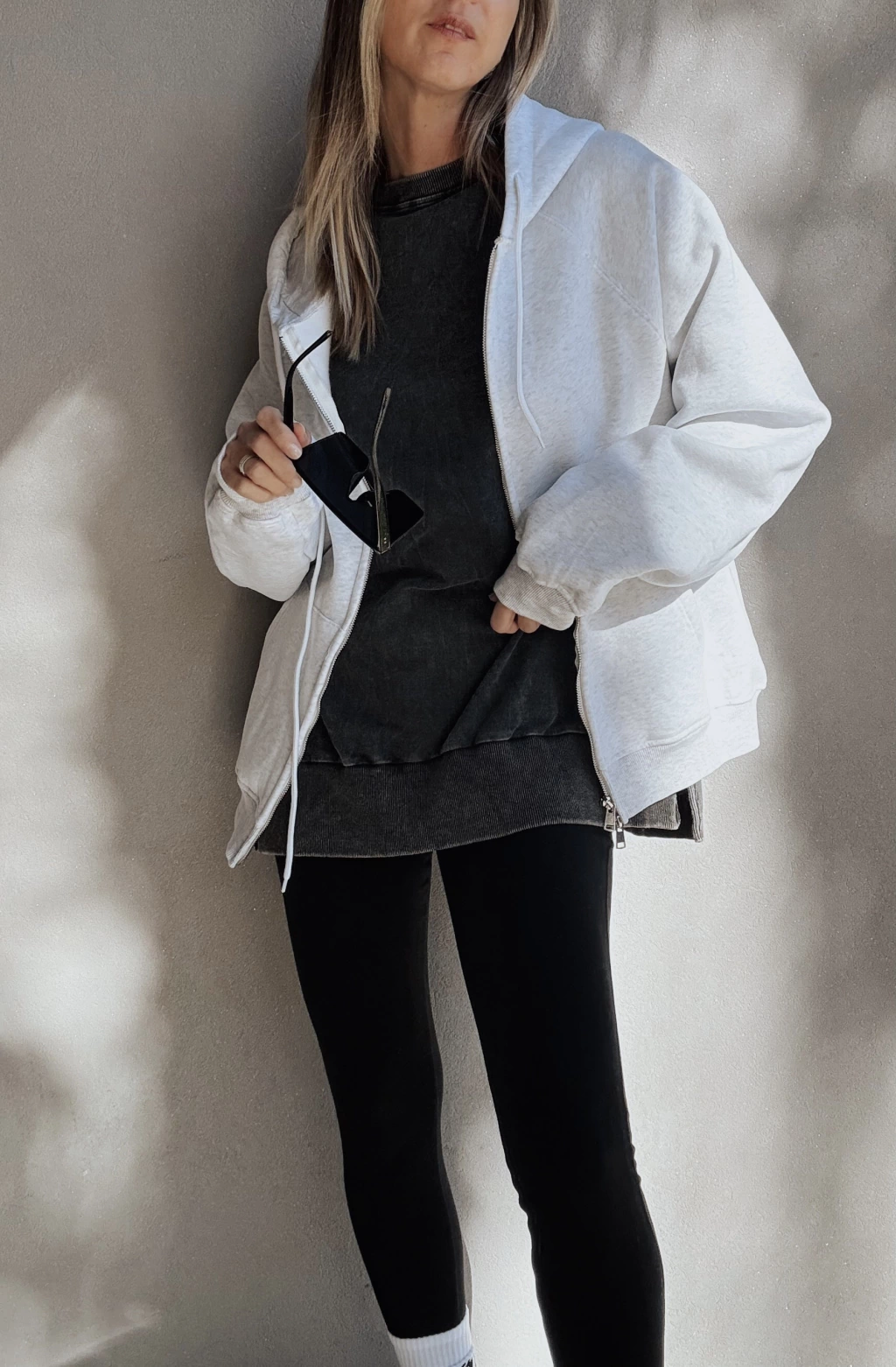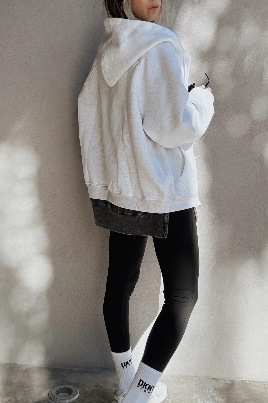Camperita/Buzo oversize con cierre metálico y capucha con cordón regulable. Posee manga ranghlan, bolsillos al frente tipo canguro y puños en mangas y cintura.