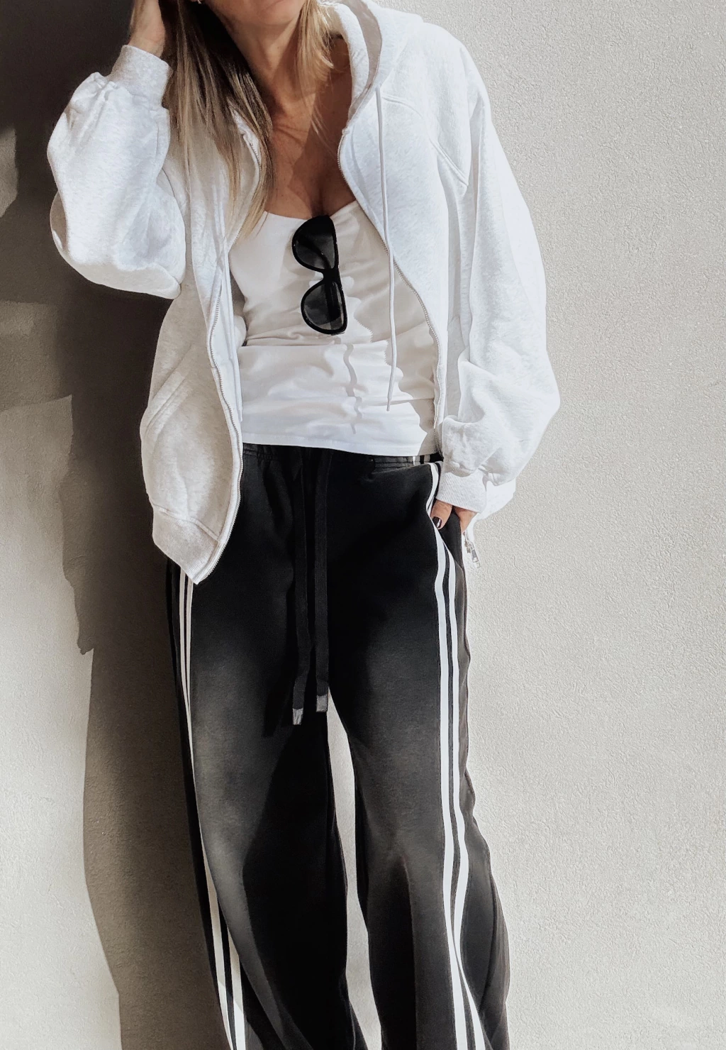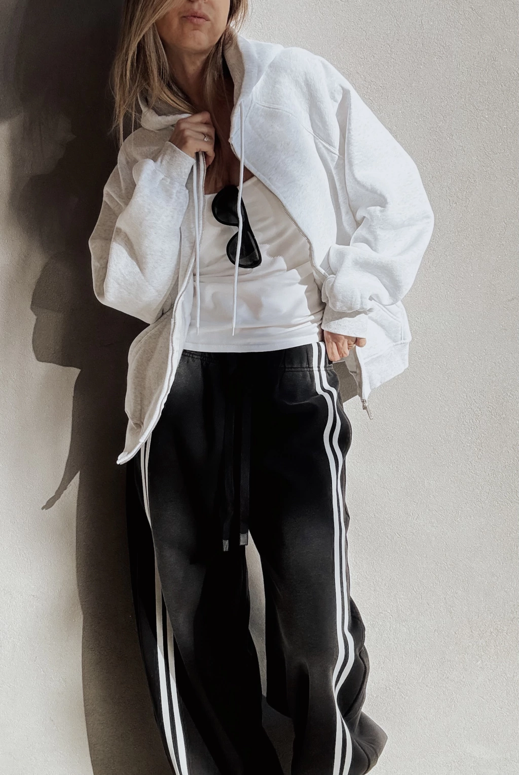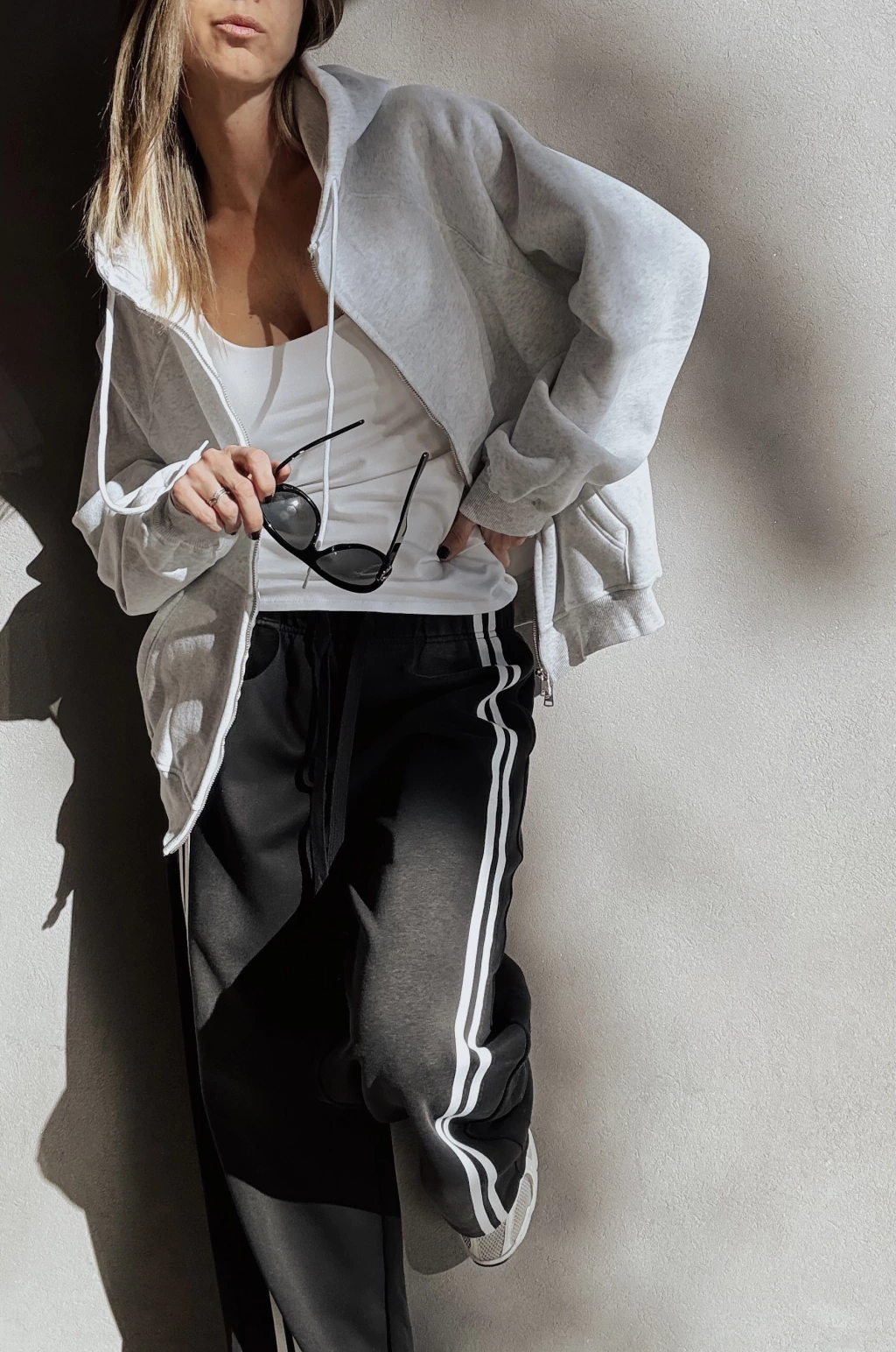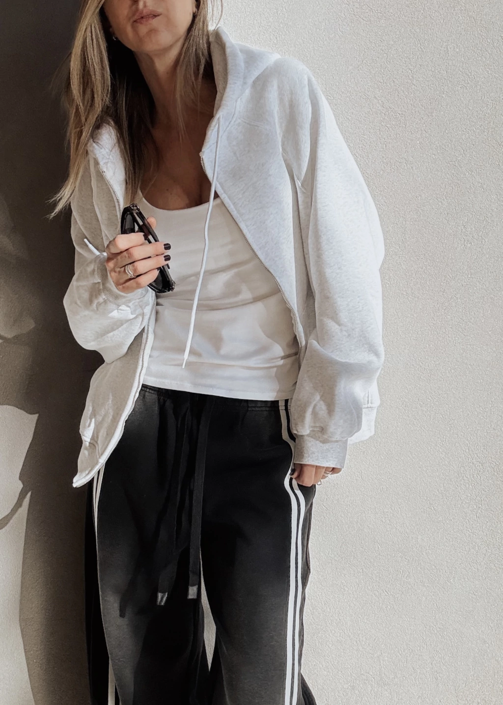 Camperita/Buzo oversize con cierre metálico y capucha con cordón regulable. Posee manga ranghlan, bolsillos al frente tipo canguro y puños en mangas y cintura.
