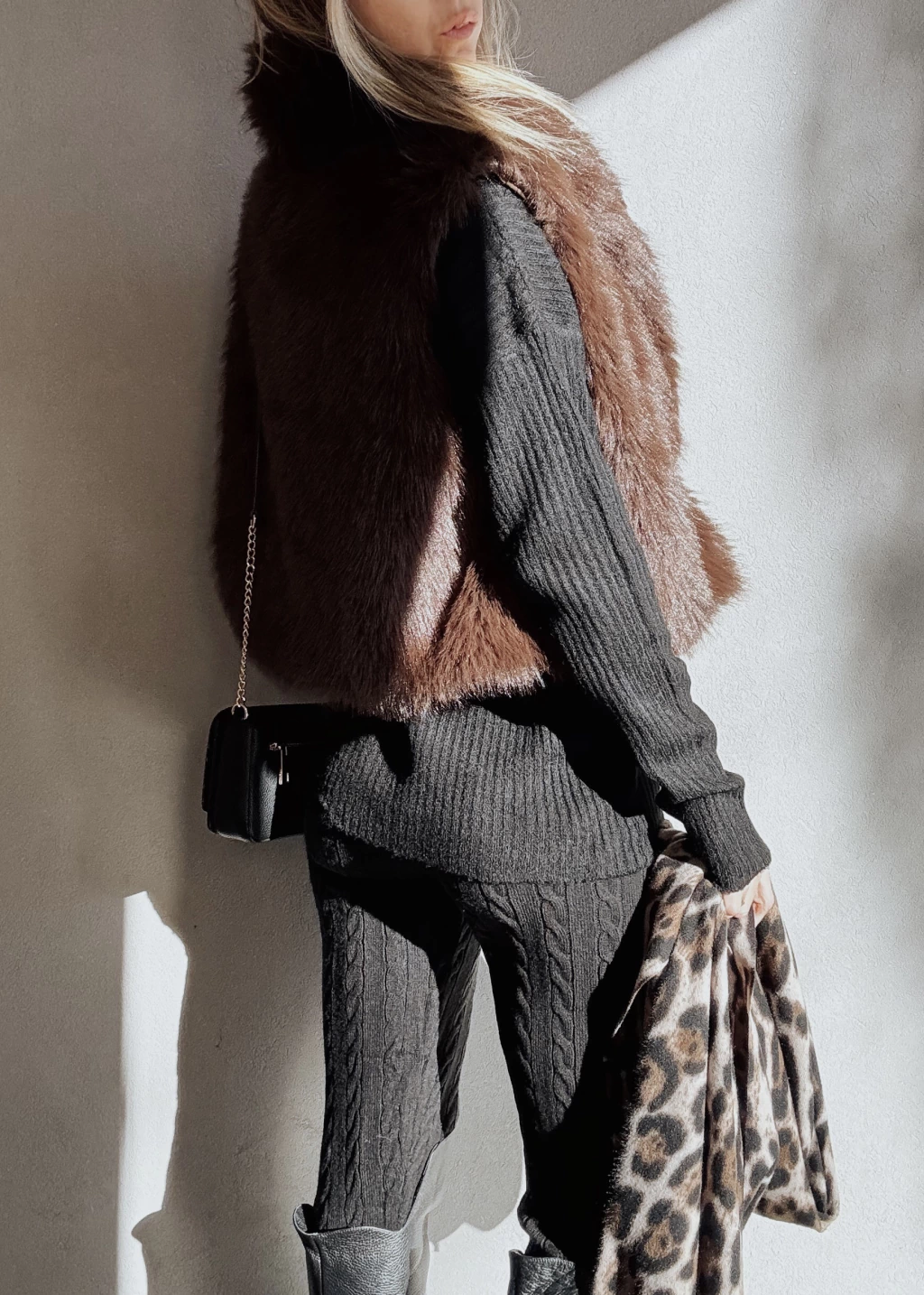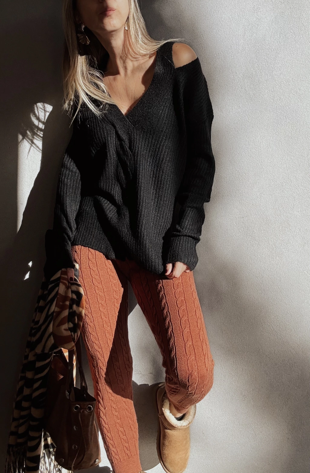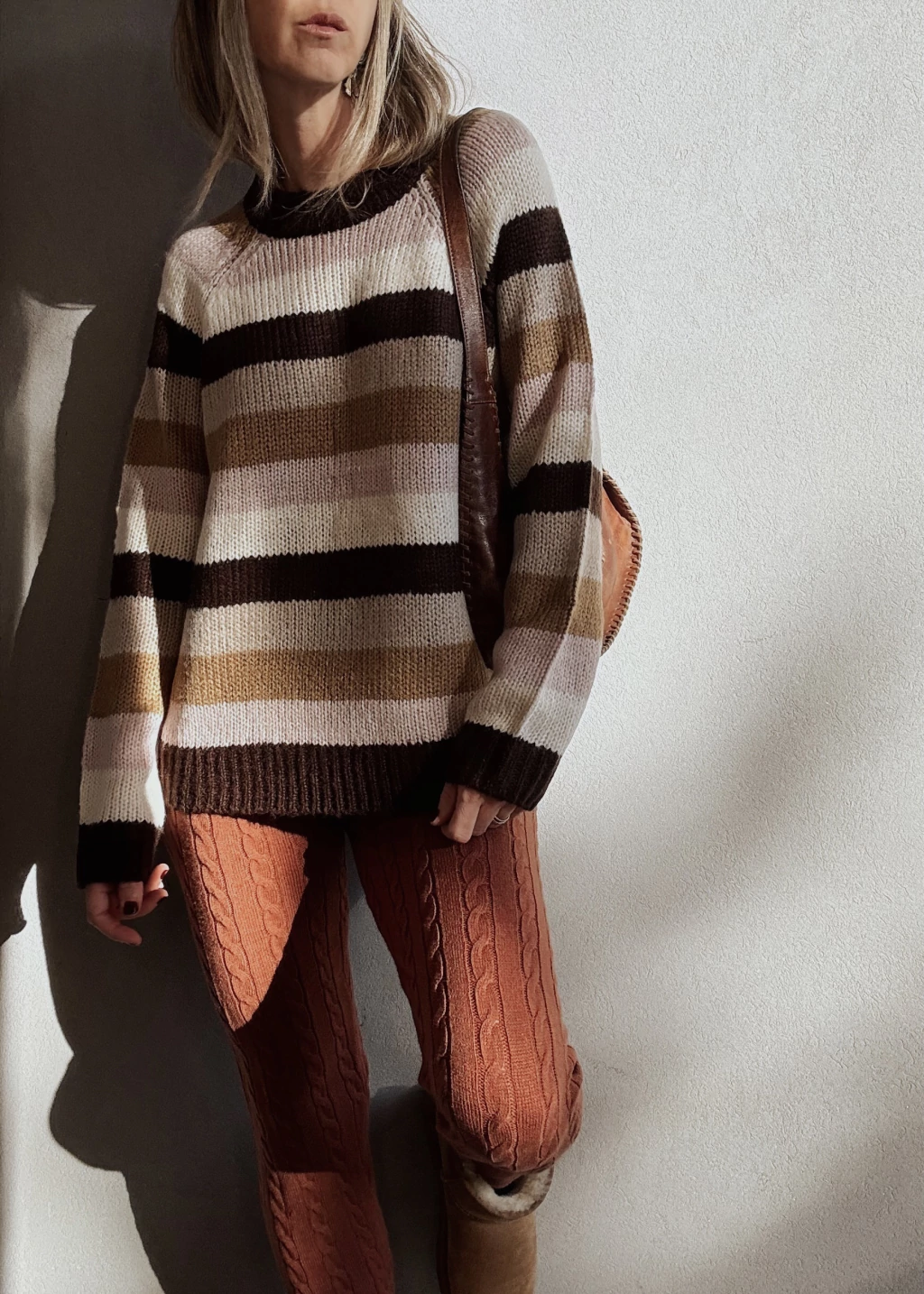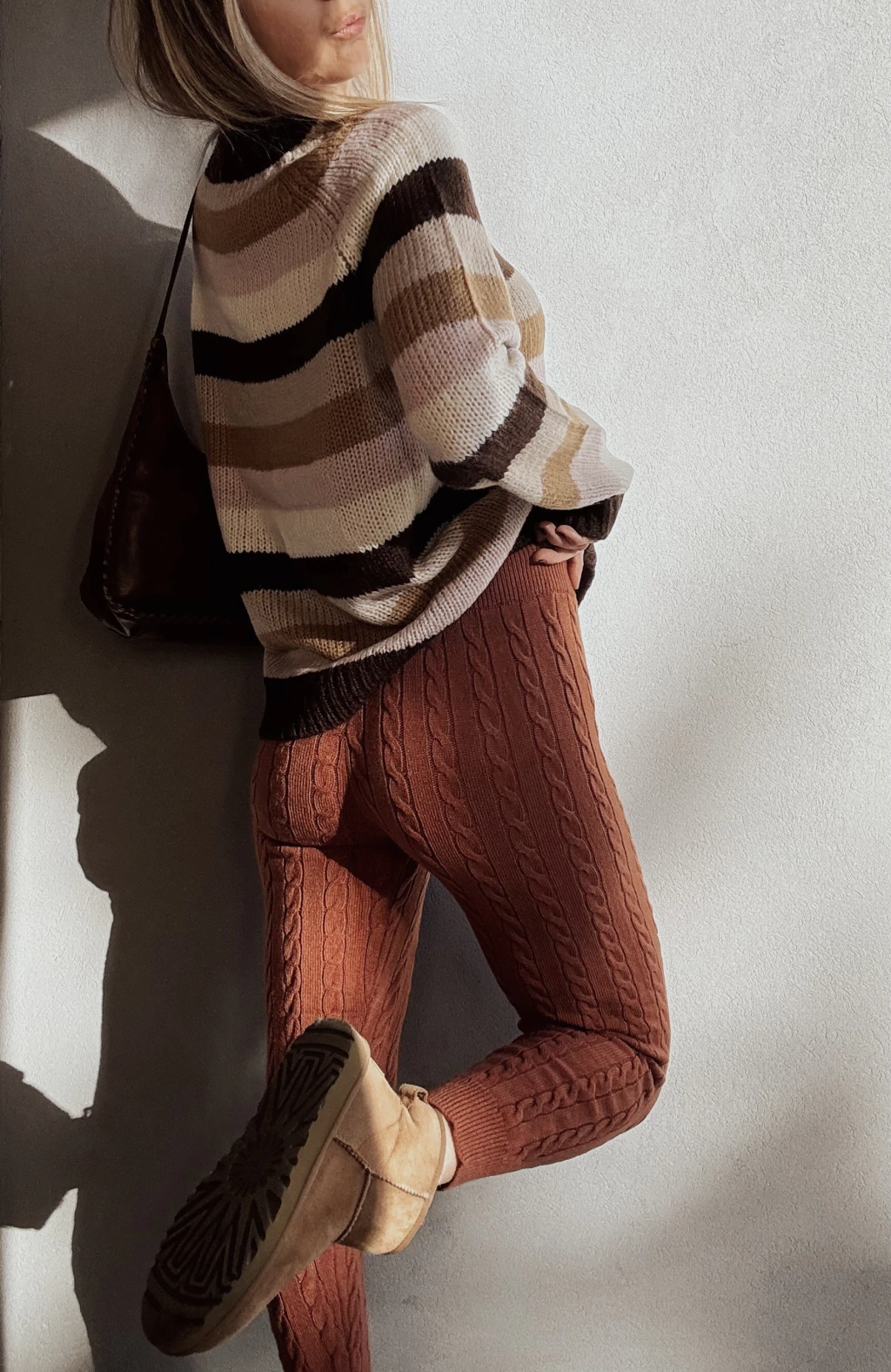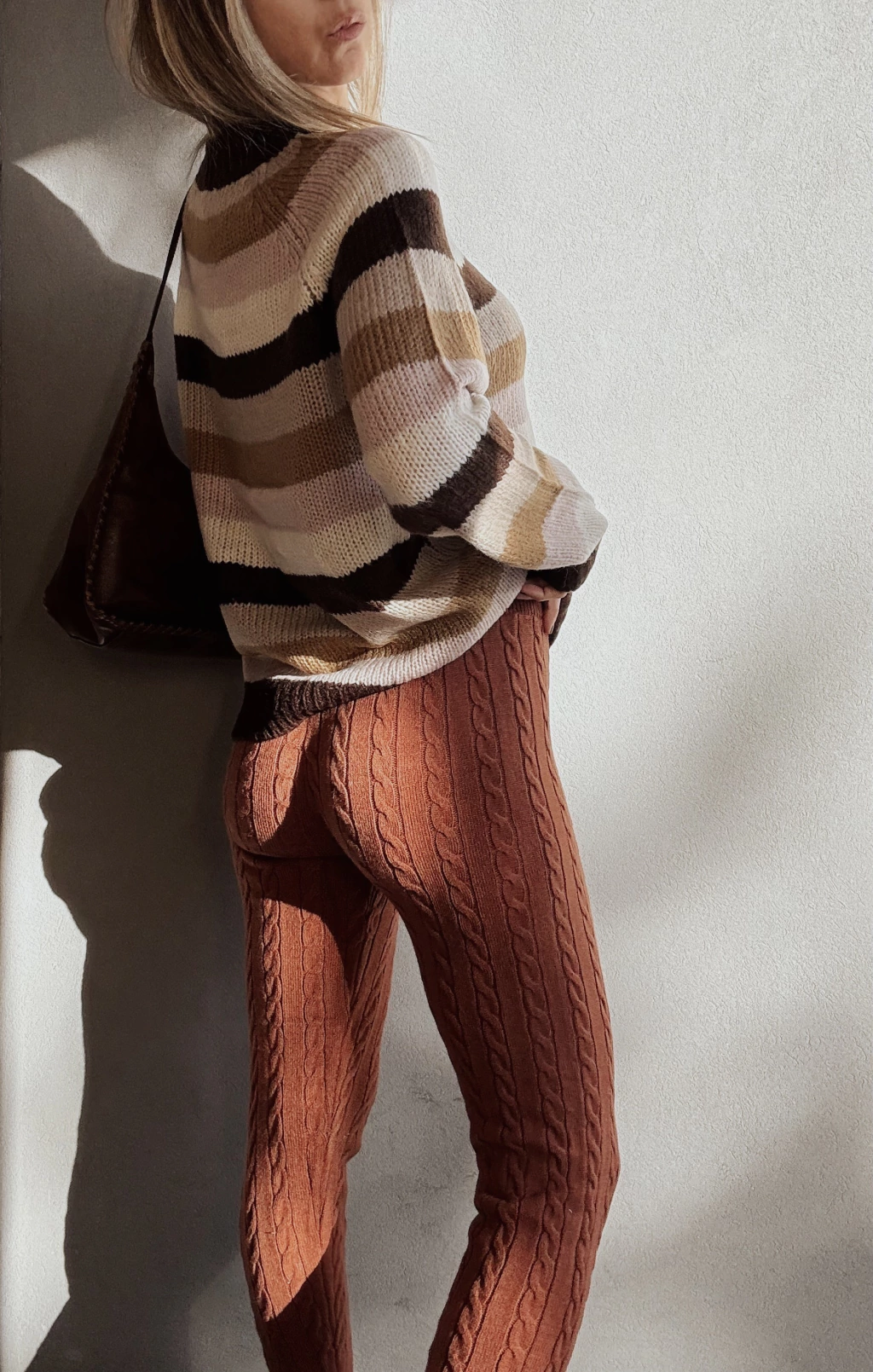 Calza tejida con canelones verticales y espigas. Cintura elástica con cordón regulable, y puños en tobillo.