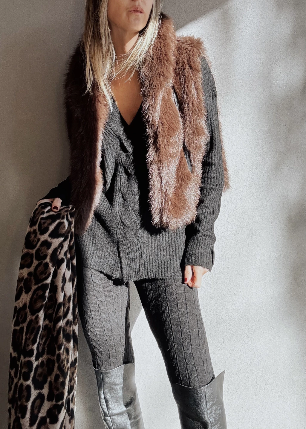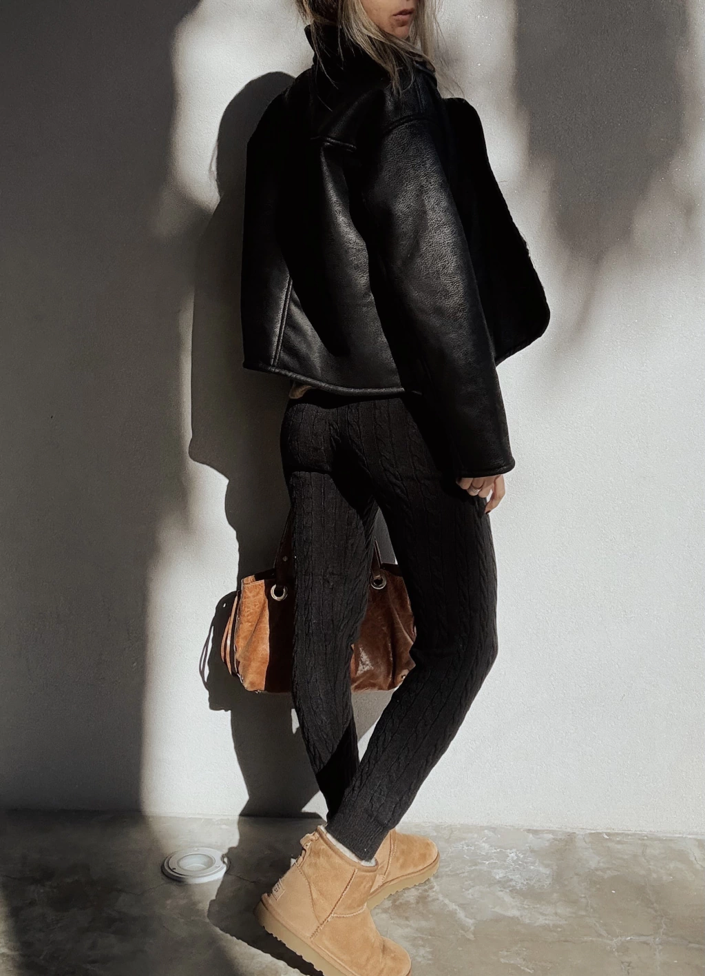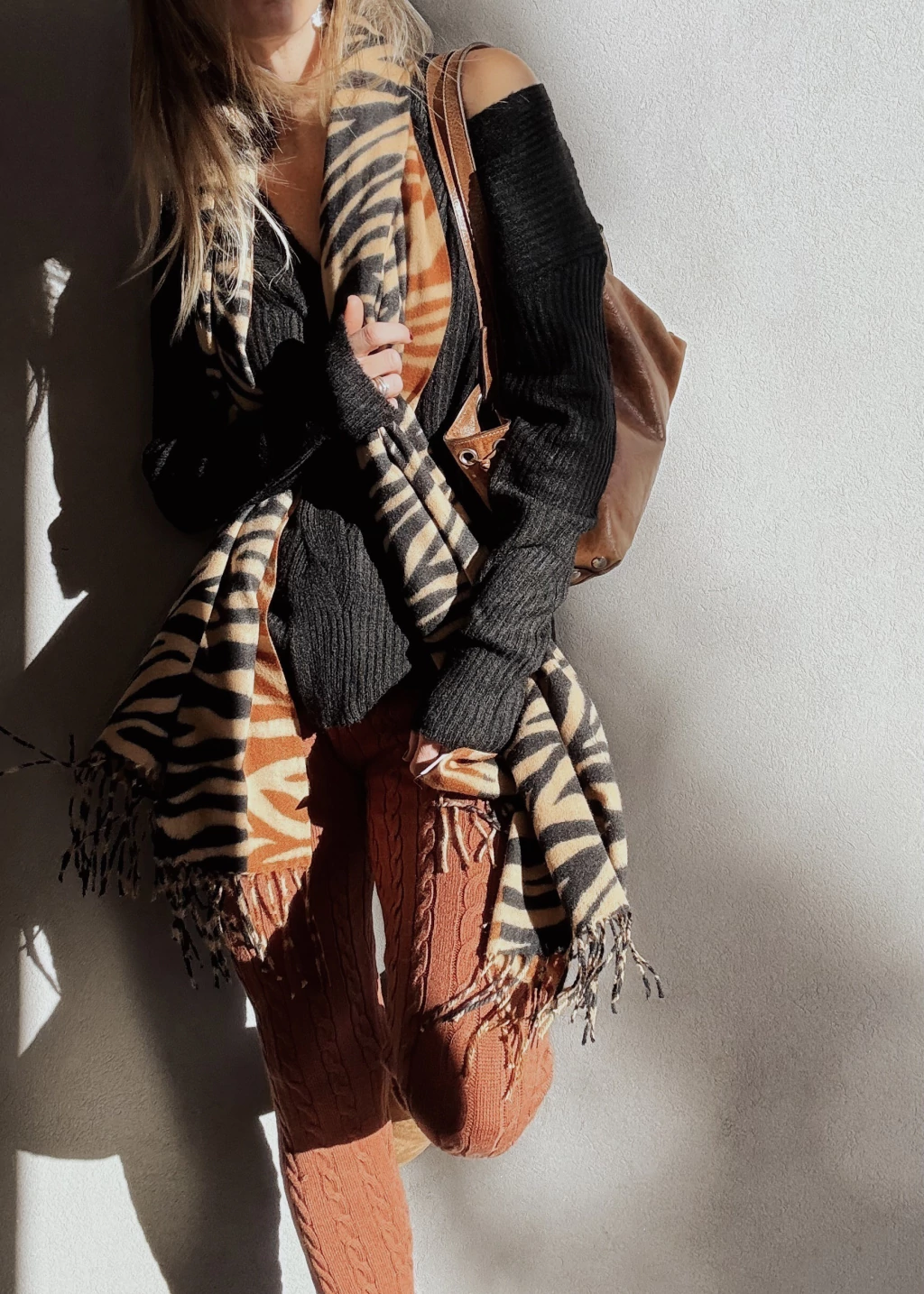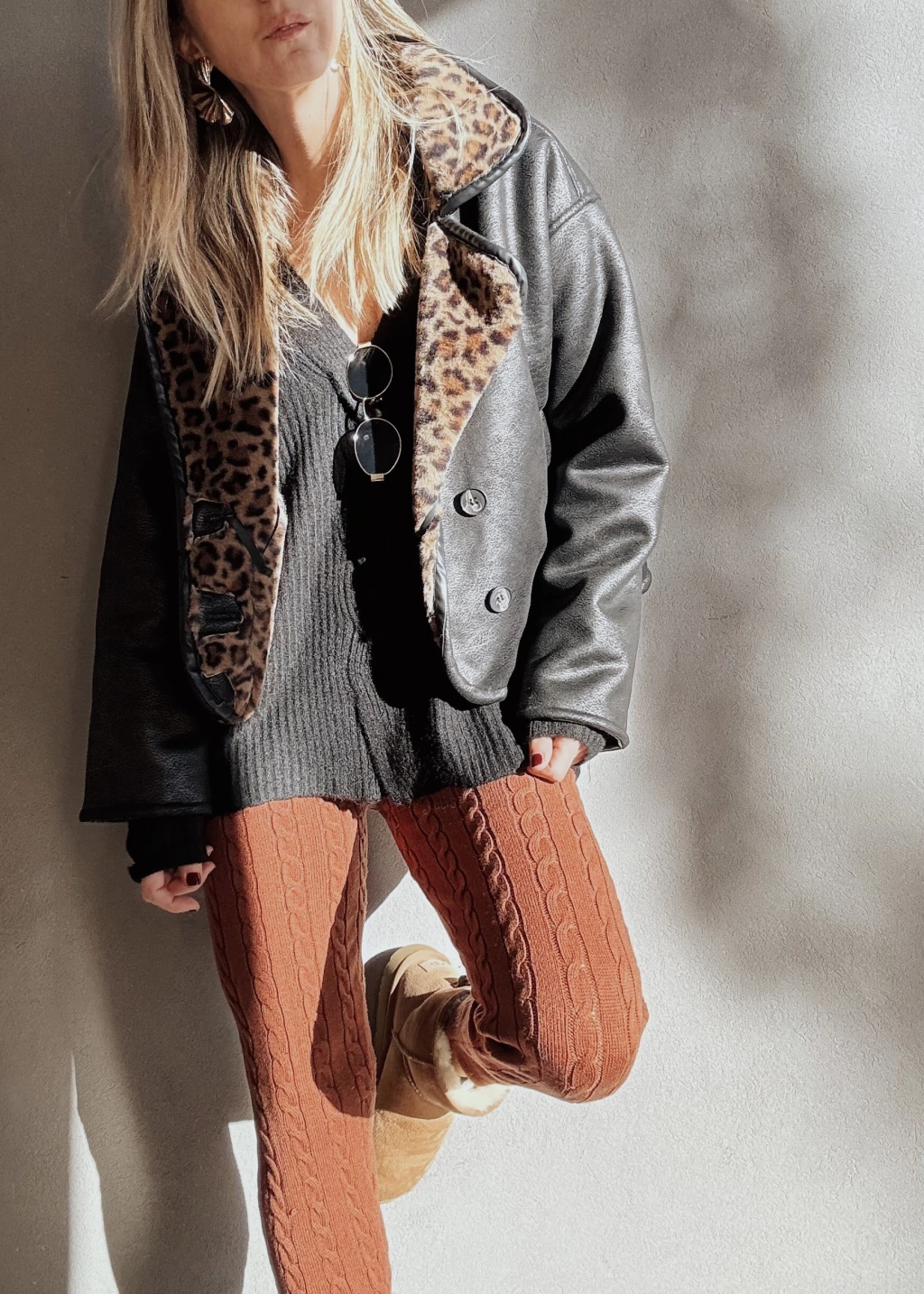 Calza tejida con canelones verticales y espigas. Cintura elástica con cordón regulable, y puños en tobillo.