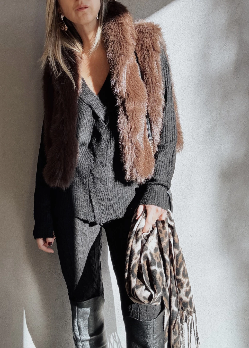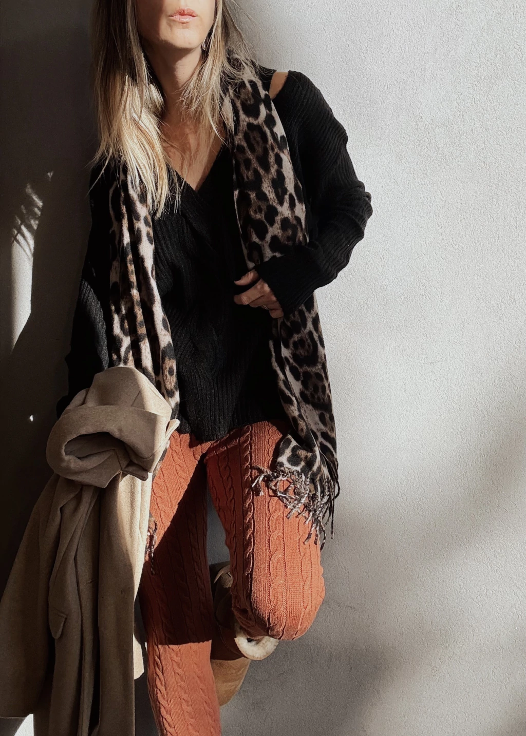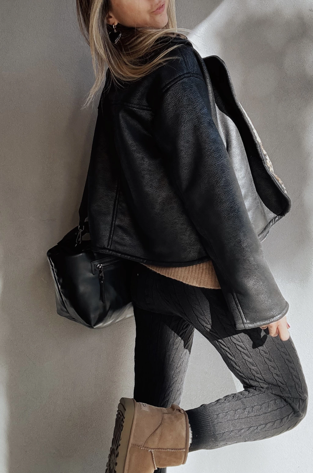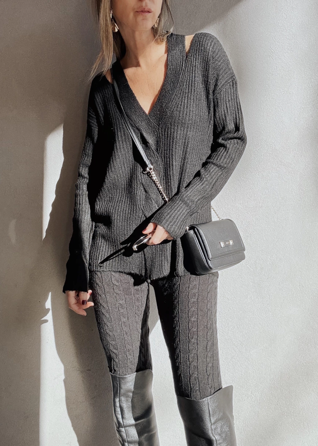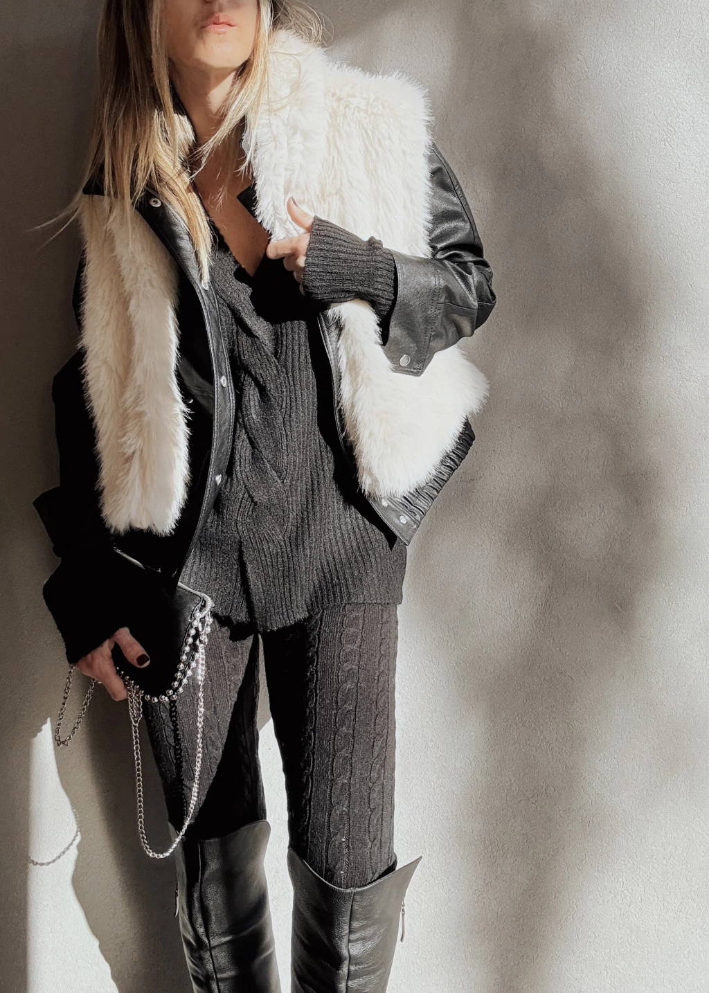Calza tejida con canelones verticales y espigas. Cintura elástica con cordón regulable, y puños en tobillo.