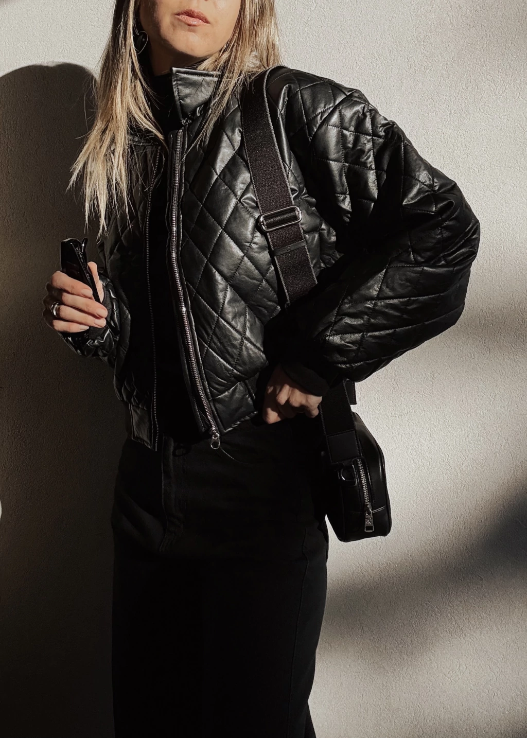 Campera matelaseada. Campera corta con textura matelaseada confeccionada en material símil cuero con cuello alto, cierre frontal metálico y bolsillos laterales. Posee puños y cintura en ribb de morley al tono. Forrada al tono con un calce súper canchero.