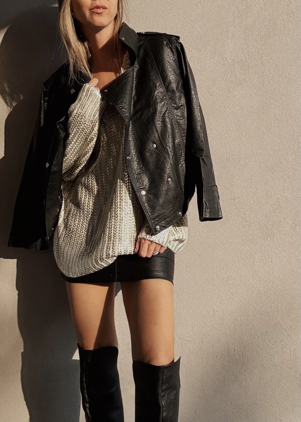 Campera eco cuero íntegramente forrada al tono con grandes solapas y botones metálicos plateados. Posee dos bolsillos funcionales laterales y doble fila de botones. Posee elástico en los laterales de la cintura generando efecto abuchonado, canchero, con presillas y tira regulable en los puños.