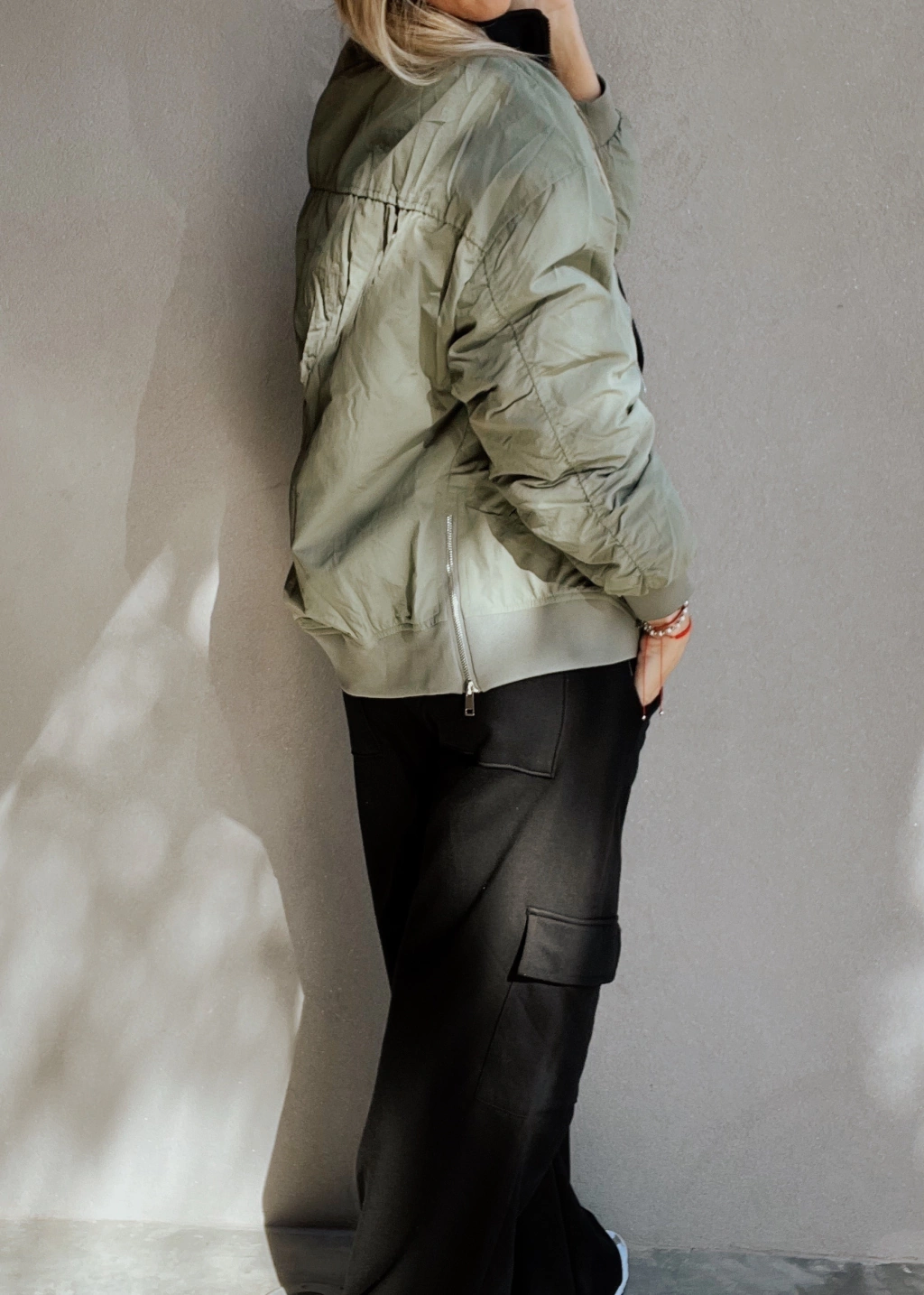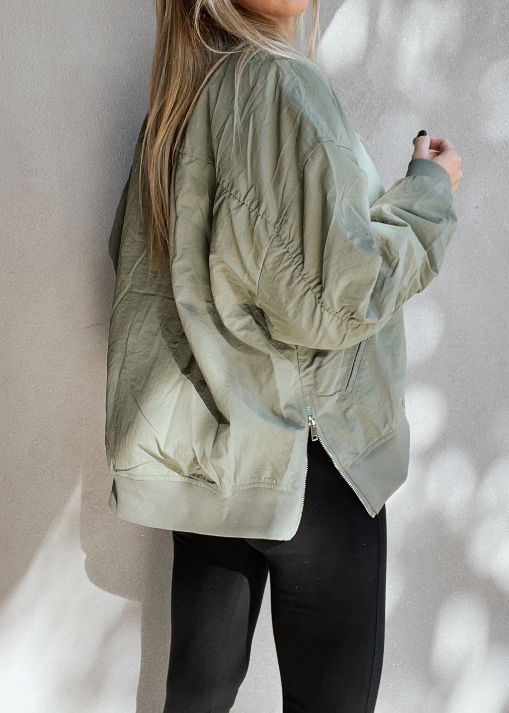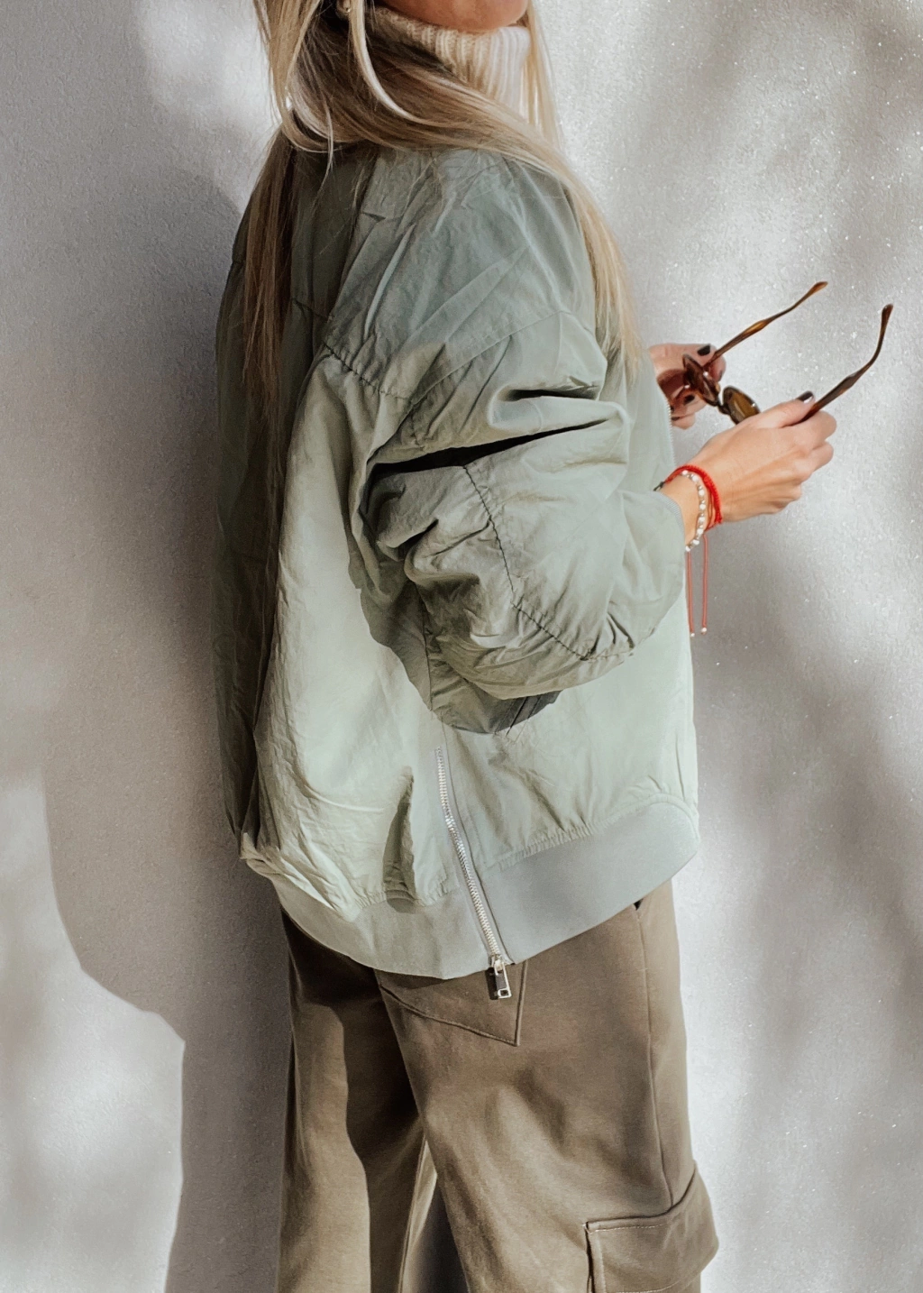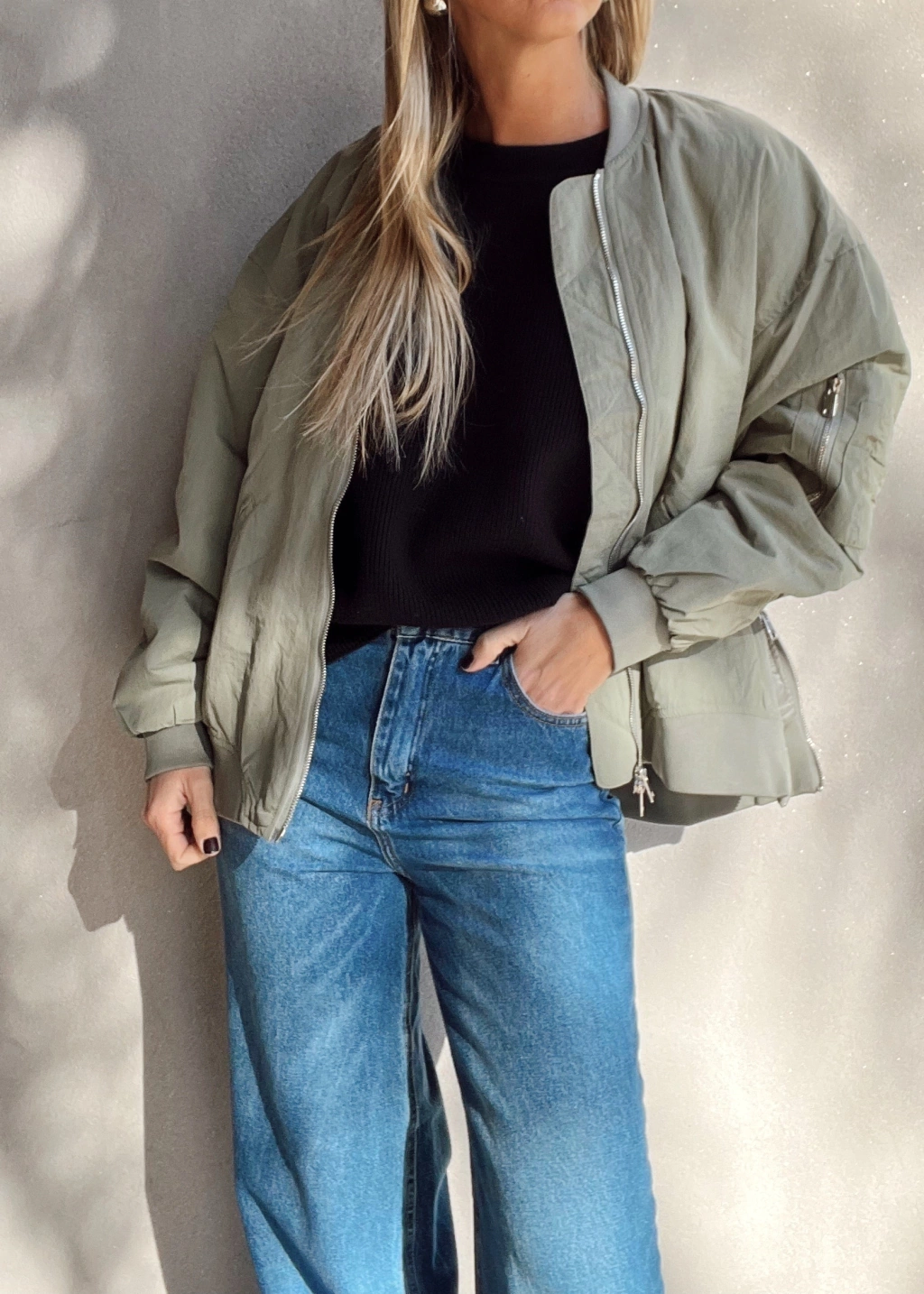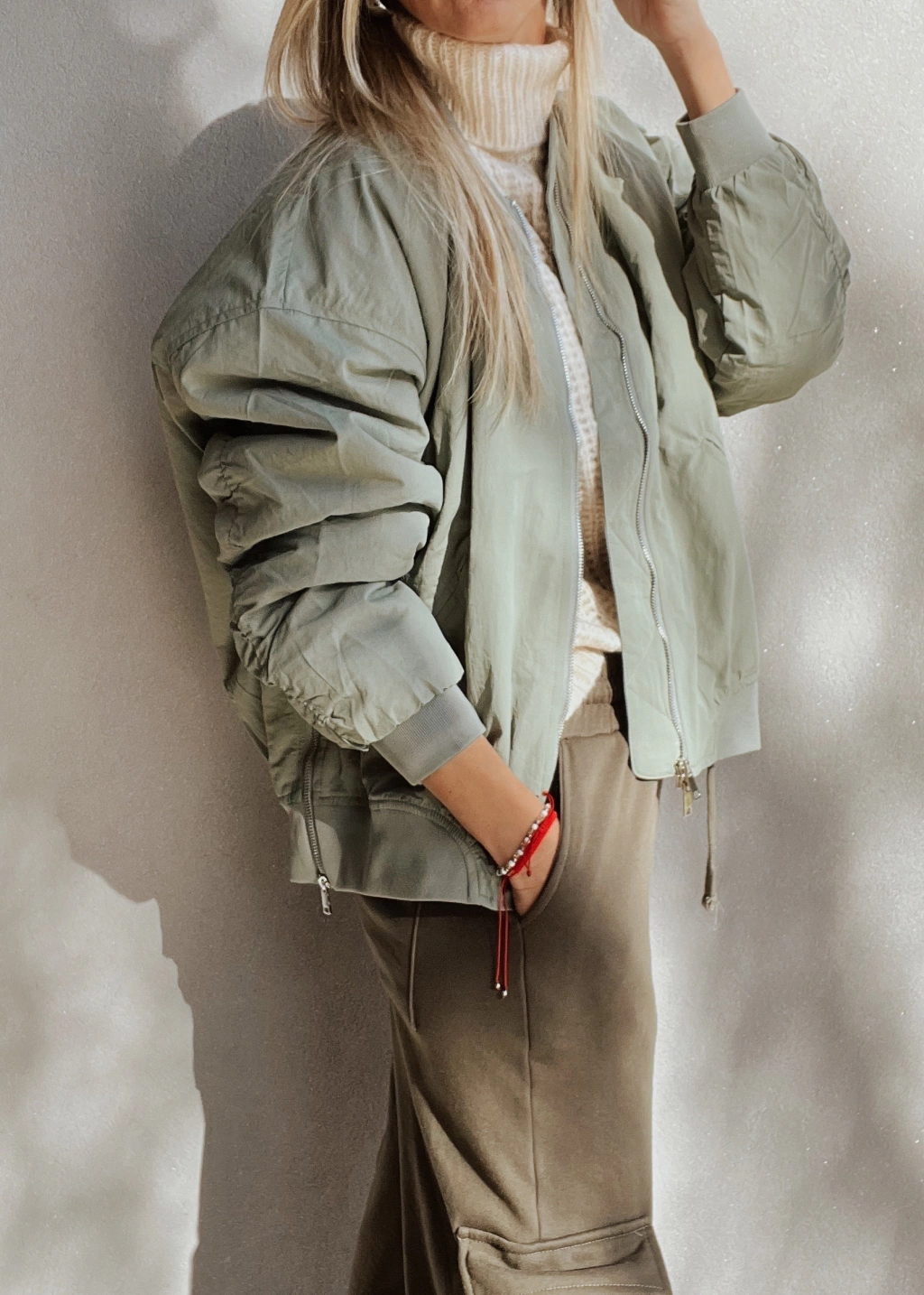 Campera bomber oversize con cierres metálicos al frente y en los laterales. Cuello y puños en rib. Posee un bolsillo lateral en la manga izquierda con cierre metálico y dos costuras con frunce en ambas mangas. Forrada al tono.