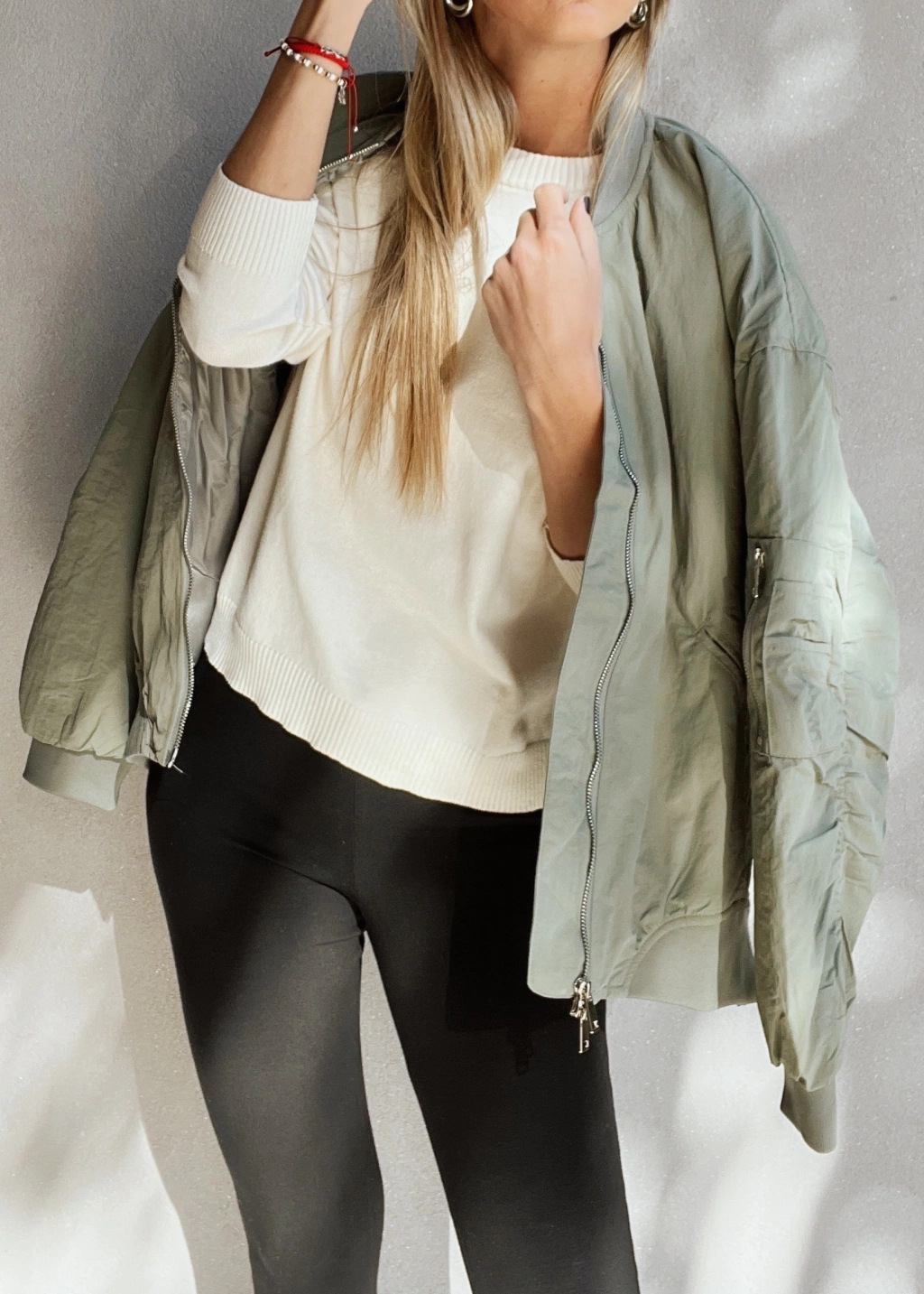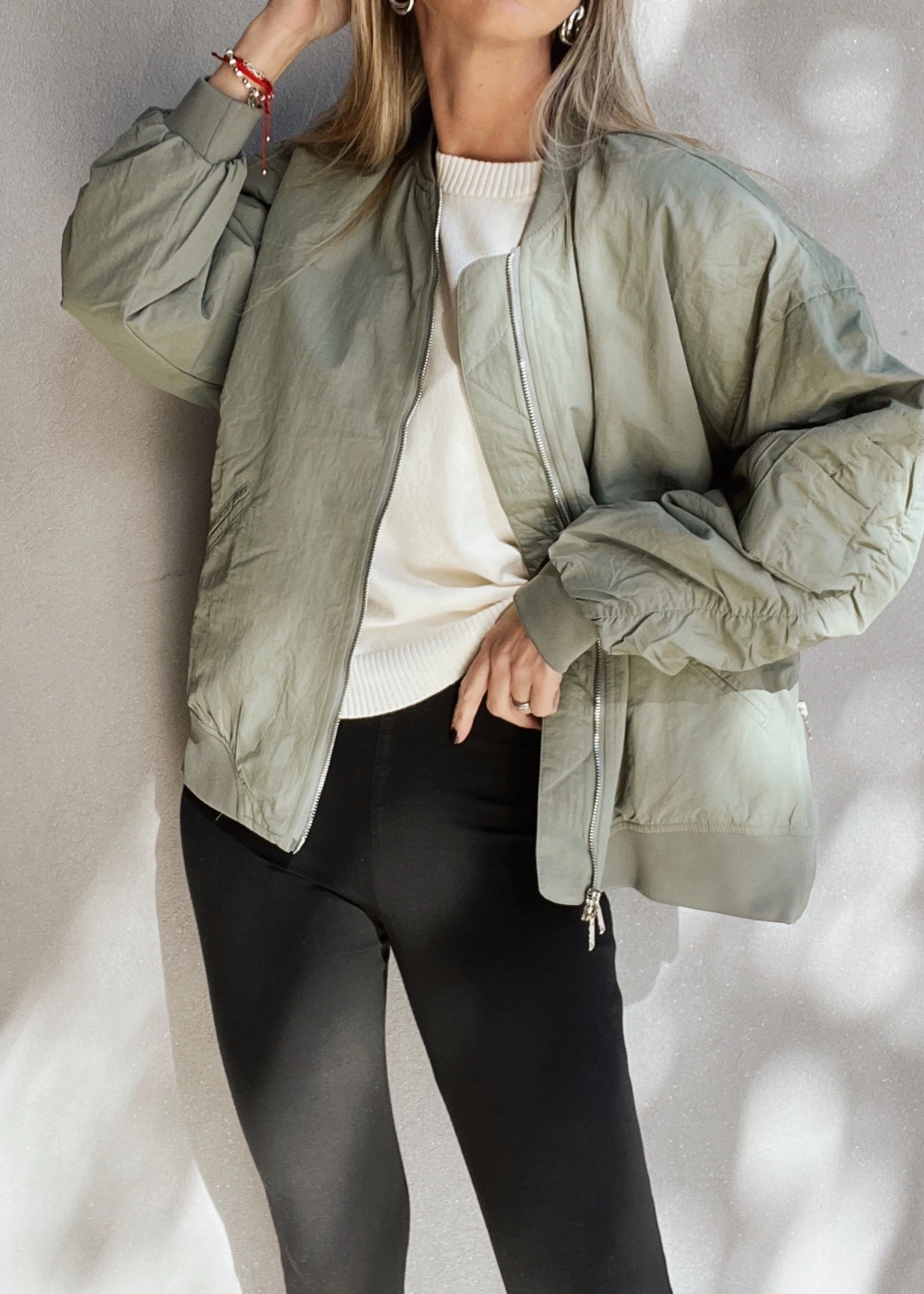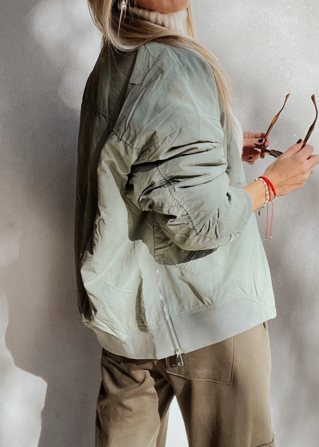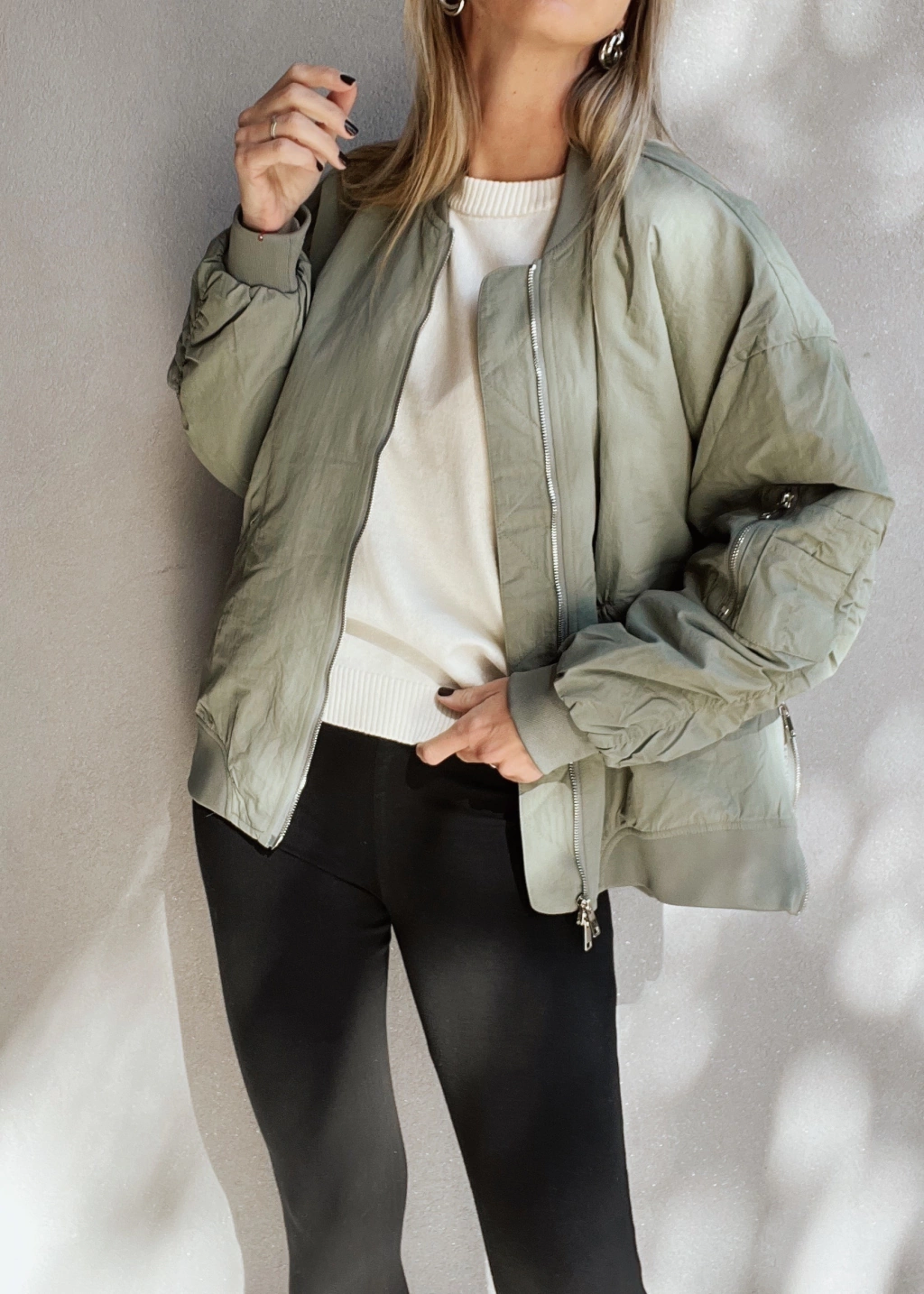Campera bomber oversize con cierres metálicos al frente y en los laterales. Cuello y puños en rib. Posee un bolsillo lateral en la manga izquierda con cierre metálico y dos costuras con frunce en ambas mangas. Forrada al tono.