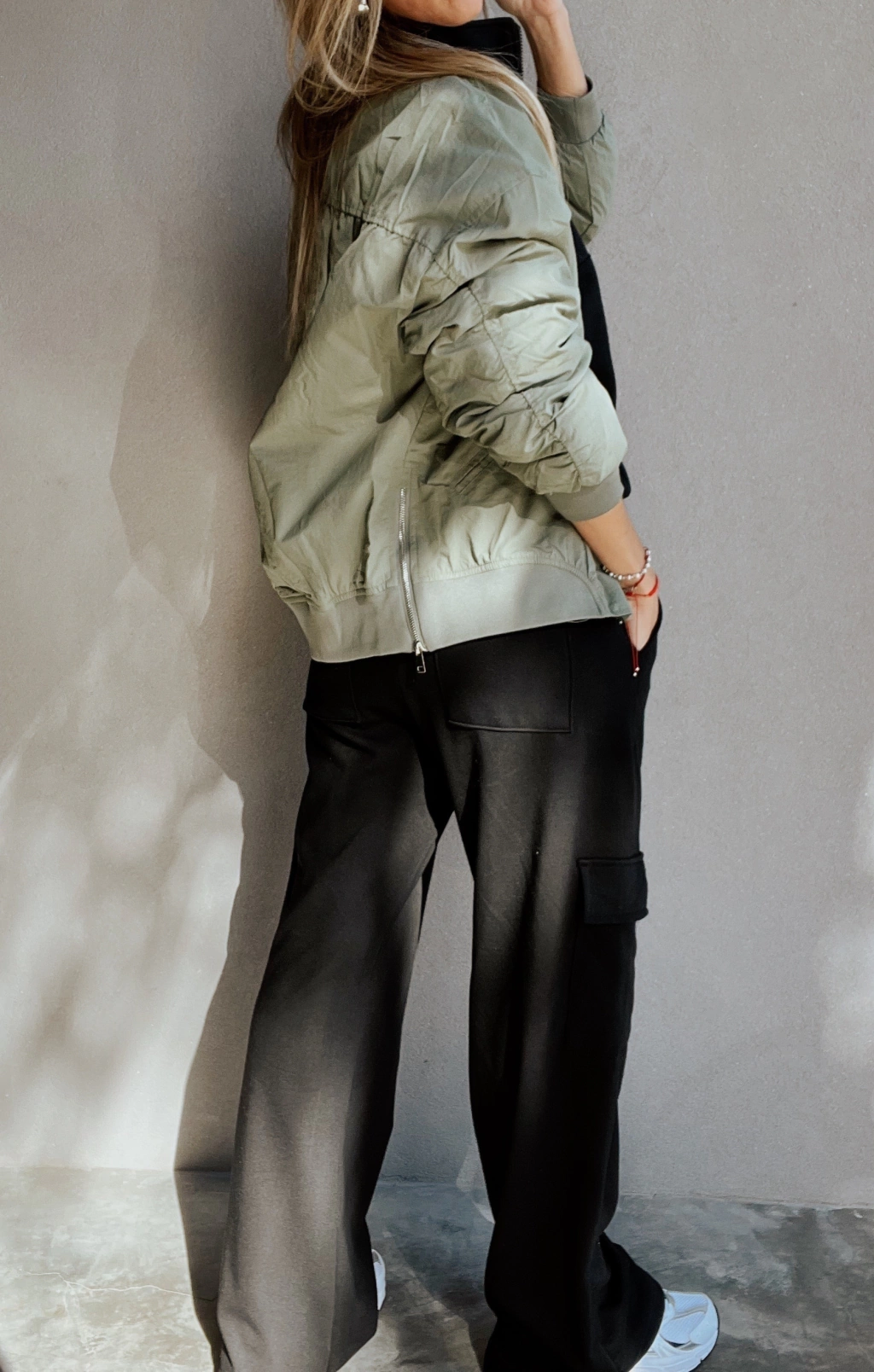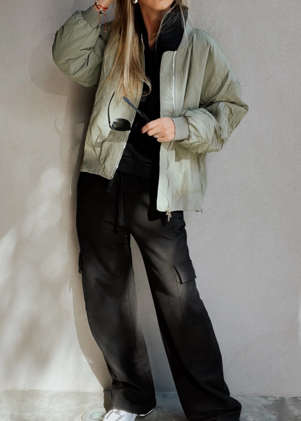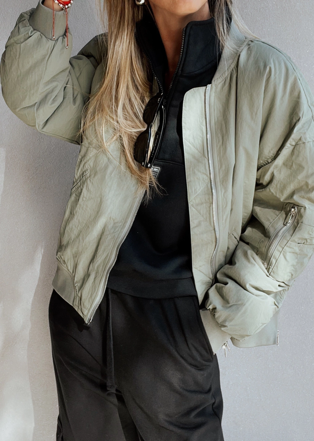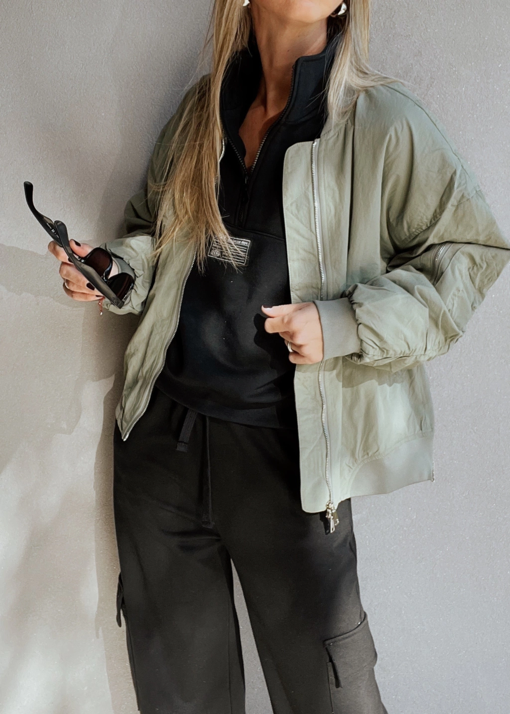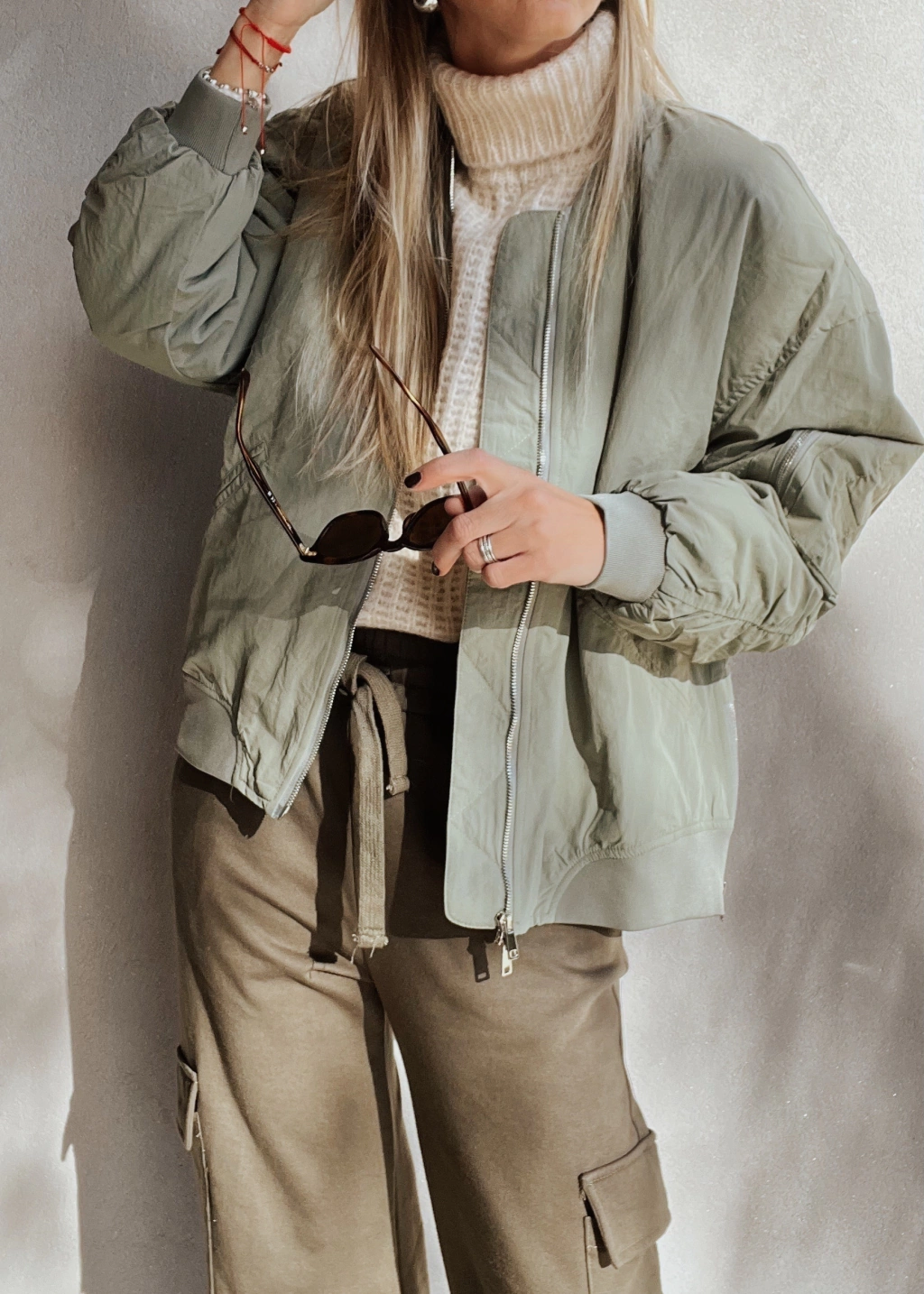 Campera bomber oversize con cierres metálicos al frente y en los laterales. Cuello y puños en rib. Posee un bolsillo lateral en la manga izquierda con cierre metálico y dos costuras con frunce en ambas mangas. Forrada al tono.