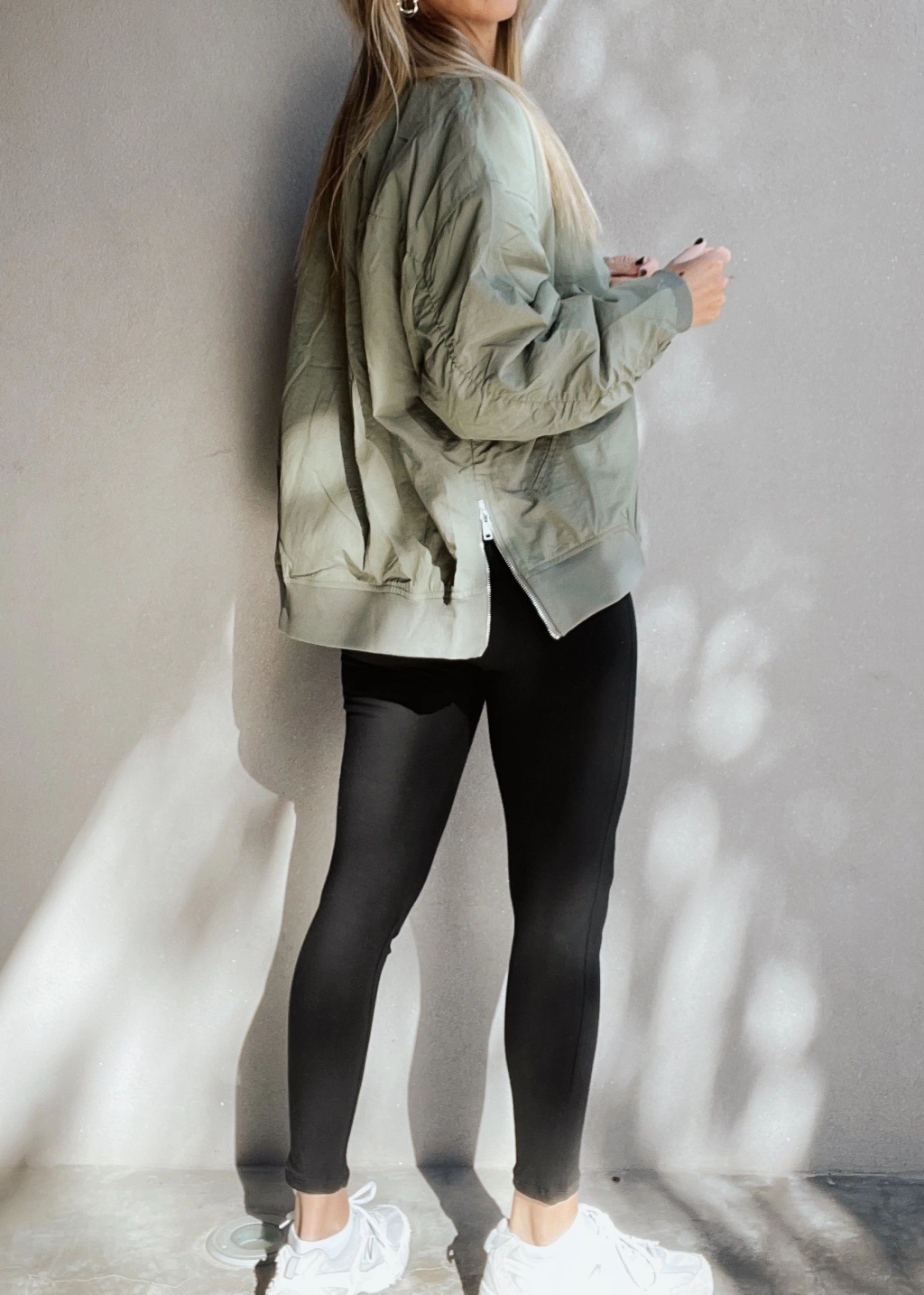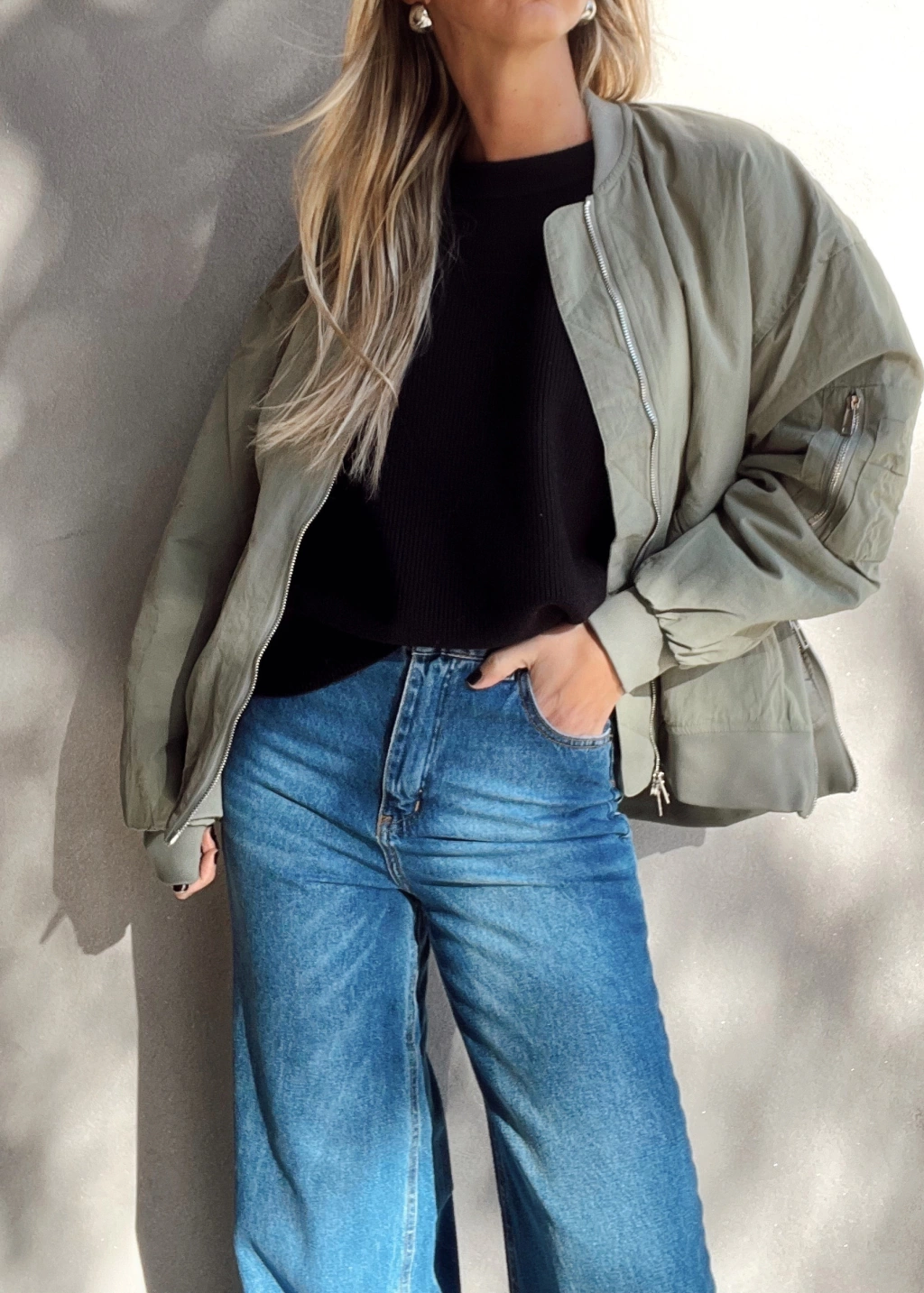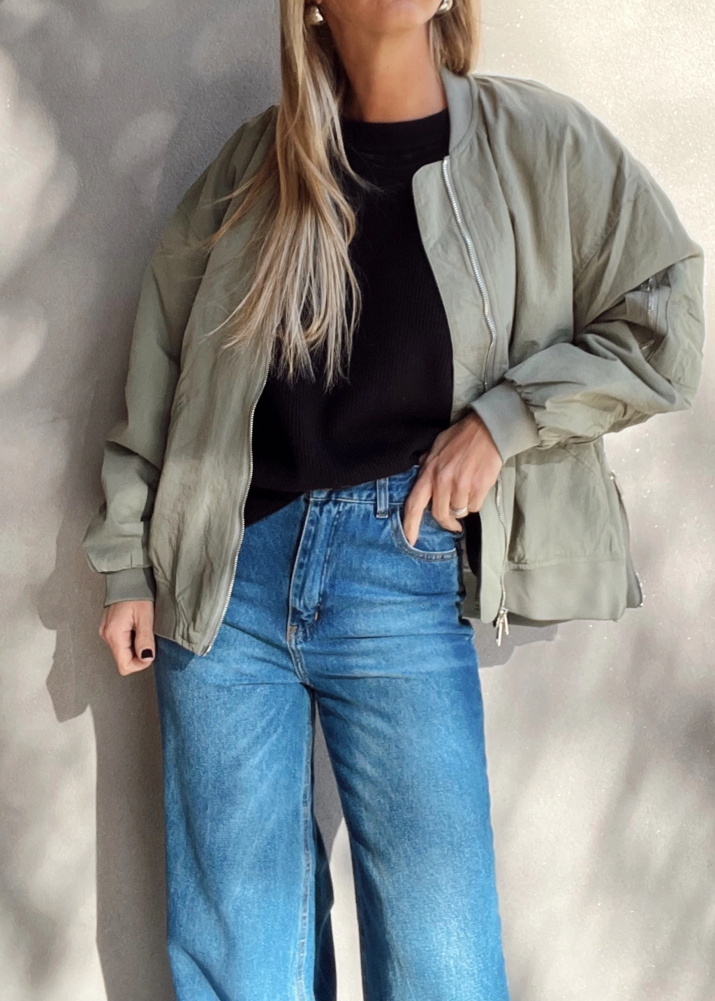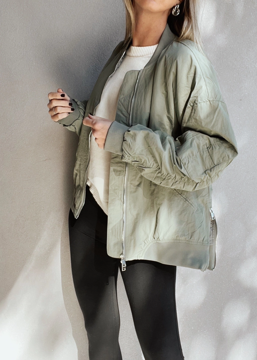 Campera bomber oversize con cierres metálicos al frente y en los laterales. Cuello y puños en rib. Posee un bolsillo lateral en la manga izquierda con cierre metálico y dos costuras con frunce en ambas mangas. Forrada al tono.