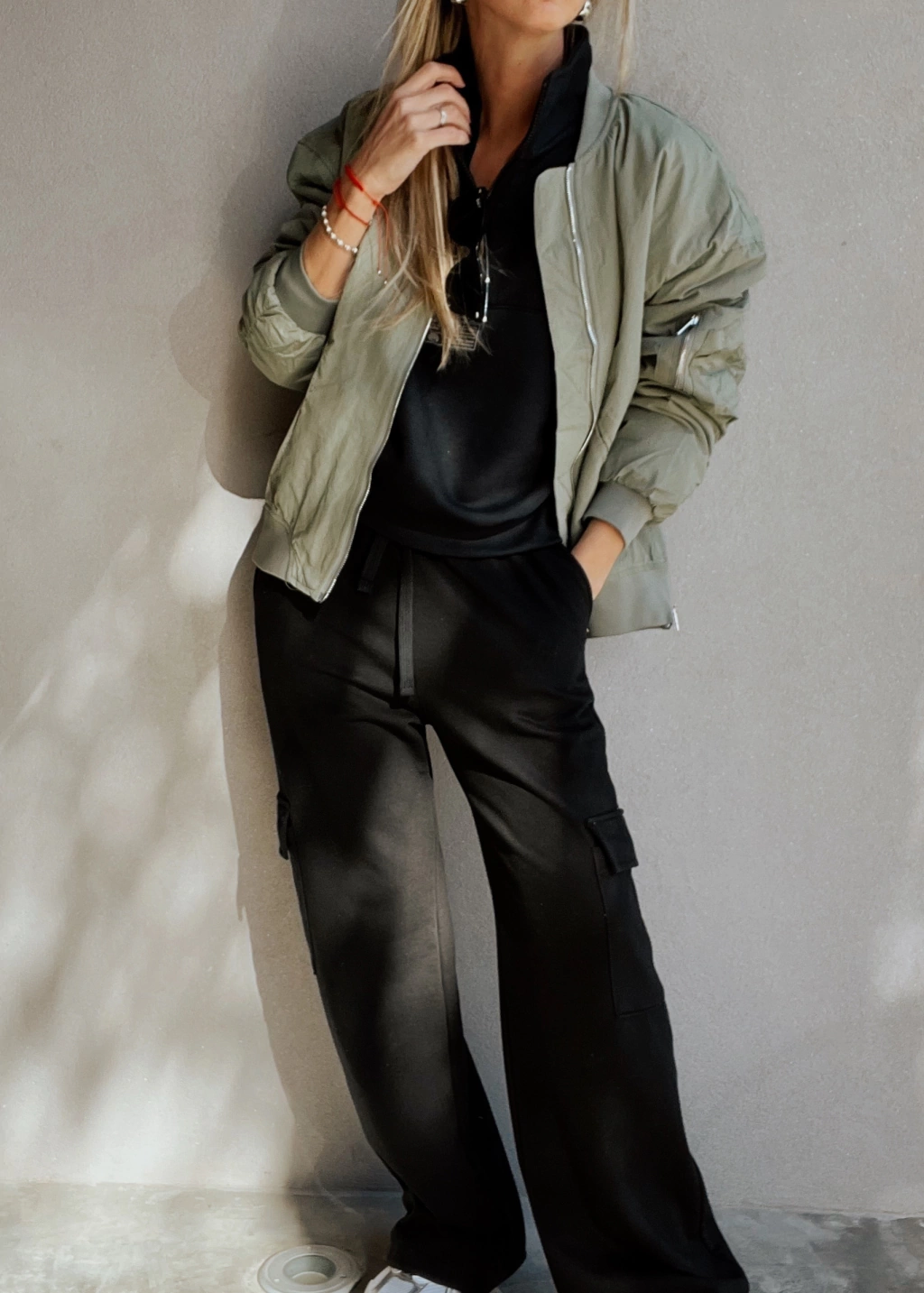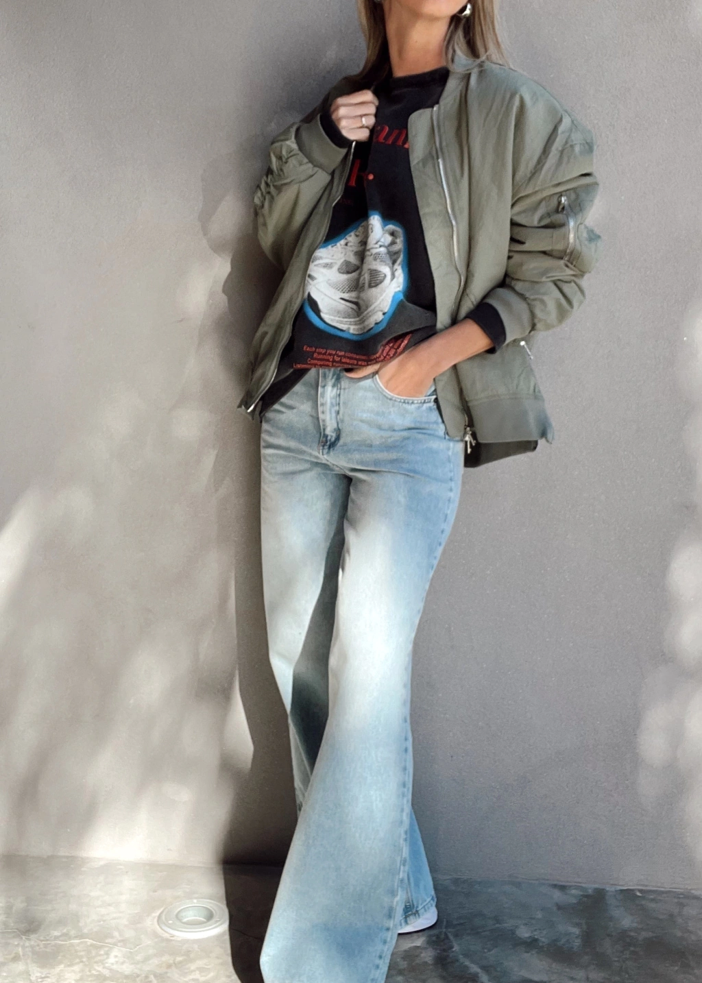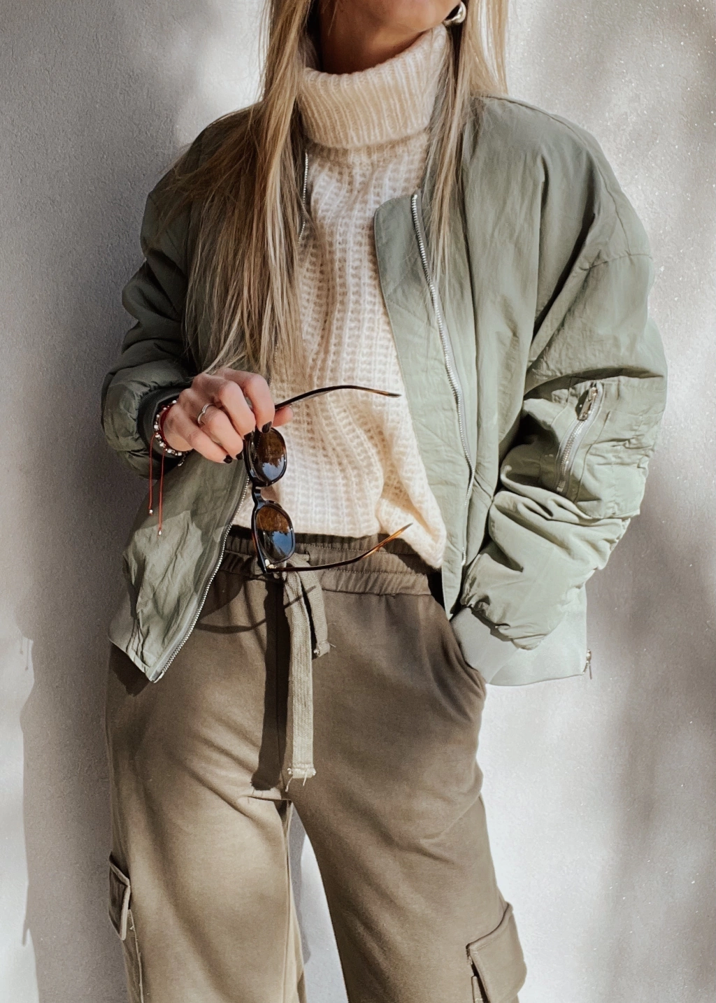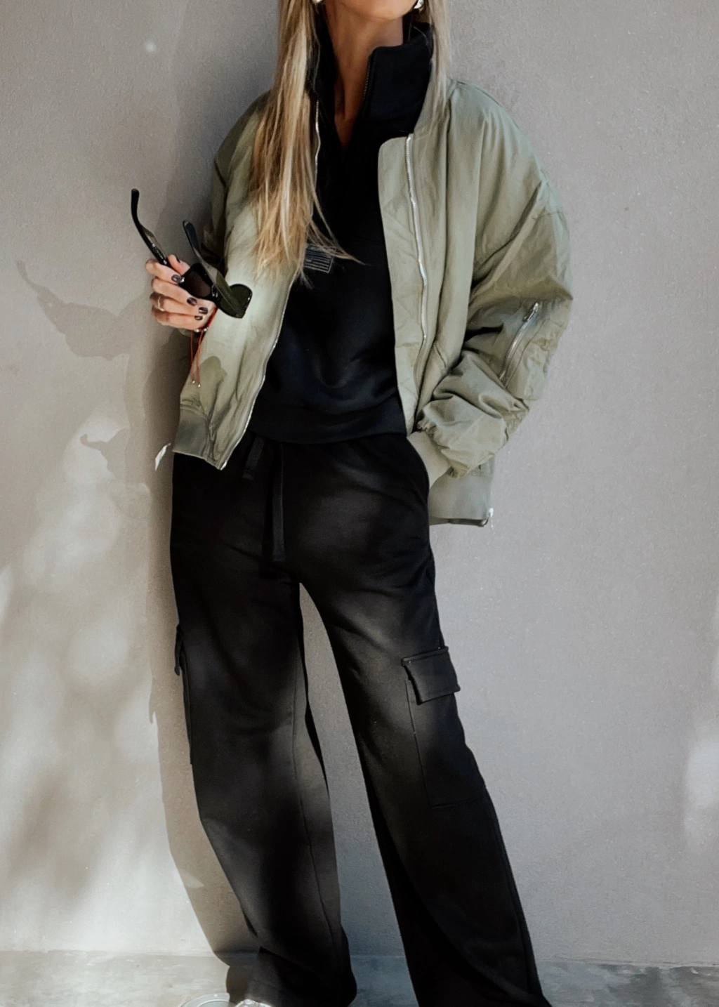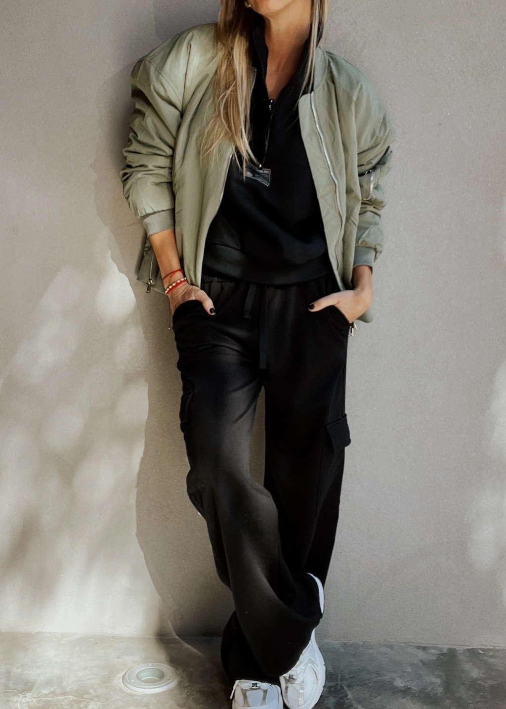 Campera bomber oversize con cierres metálicos al frente y en los laterales. Cuello y puños en rib. Posee un bolsillo lateral en la manga izquierda con cierre metálico y dos costuras con frunce en ambas mangas. Forrada al tono.