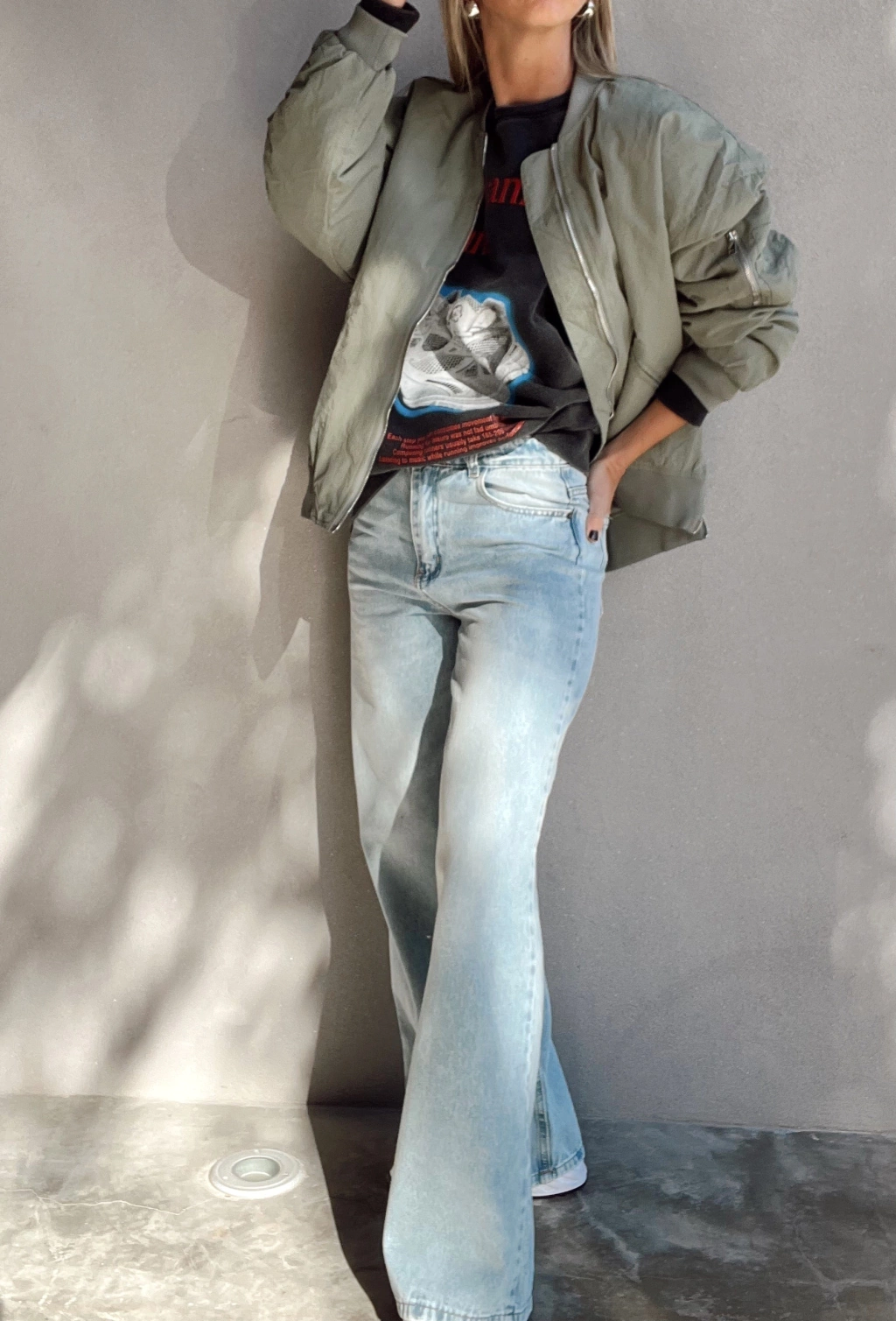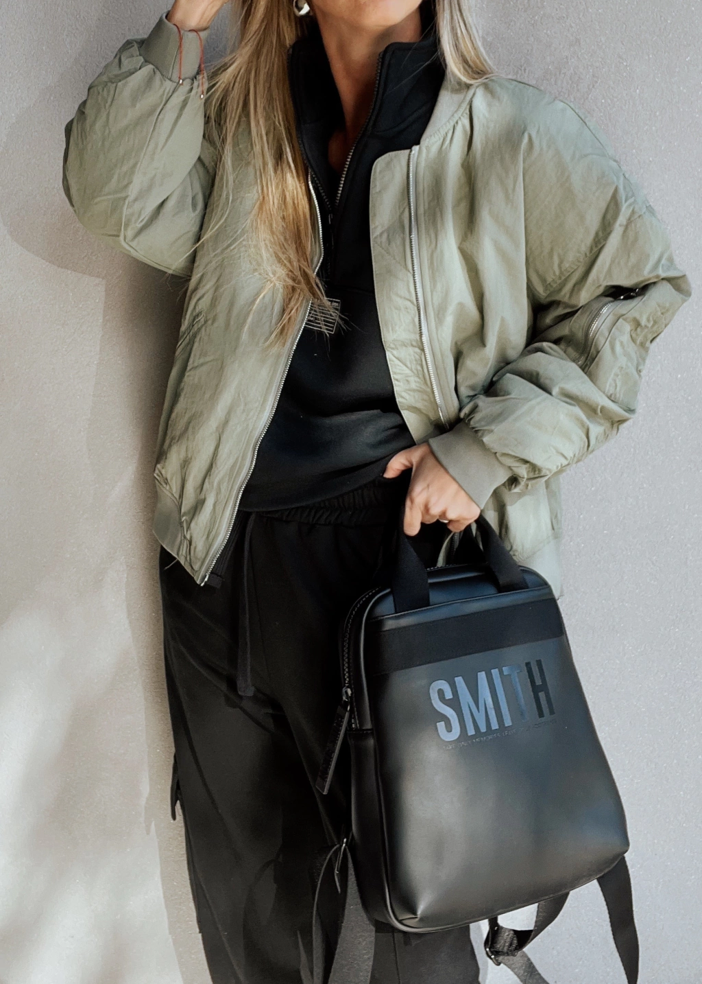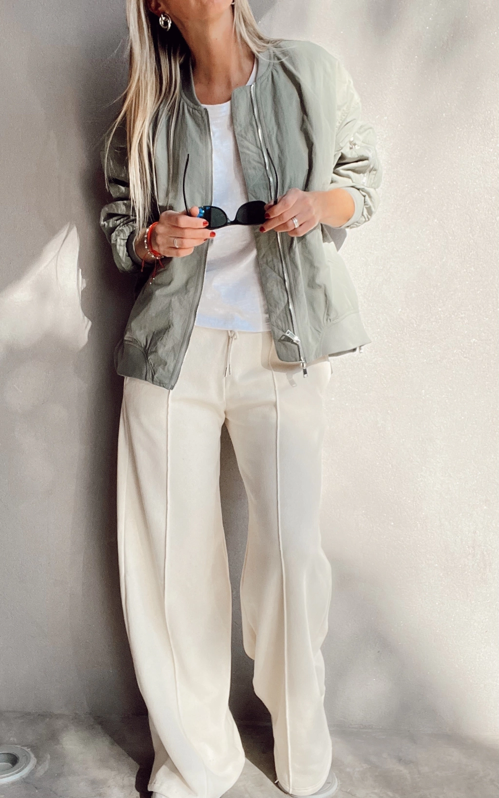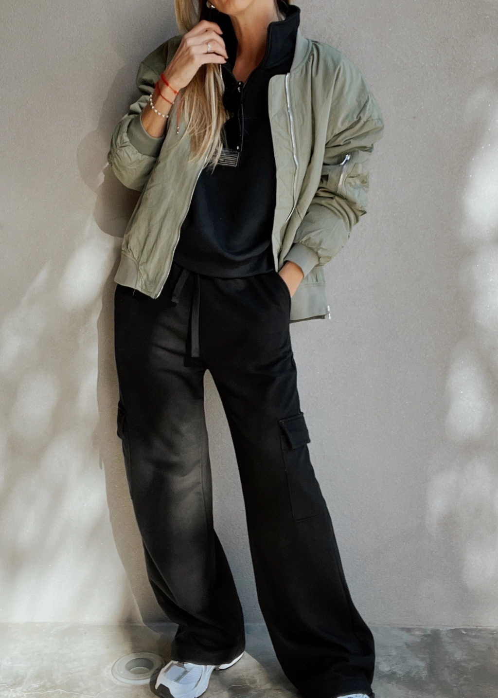Campera bomber oversize con cierres metálicos al frente y en los laterales. Cuello y puños en rib. Posee un bolsillo lateral en la manga izquierda con cierre metálico y dos costuras con frunce en ambas mangas. Forrada al tono.