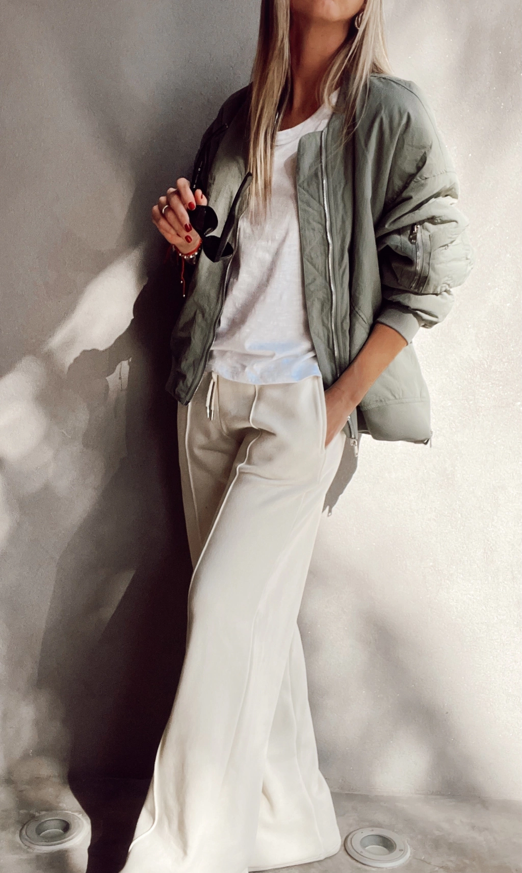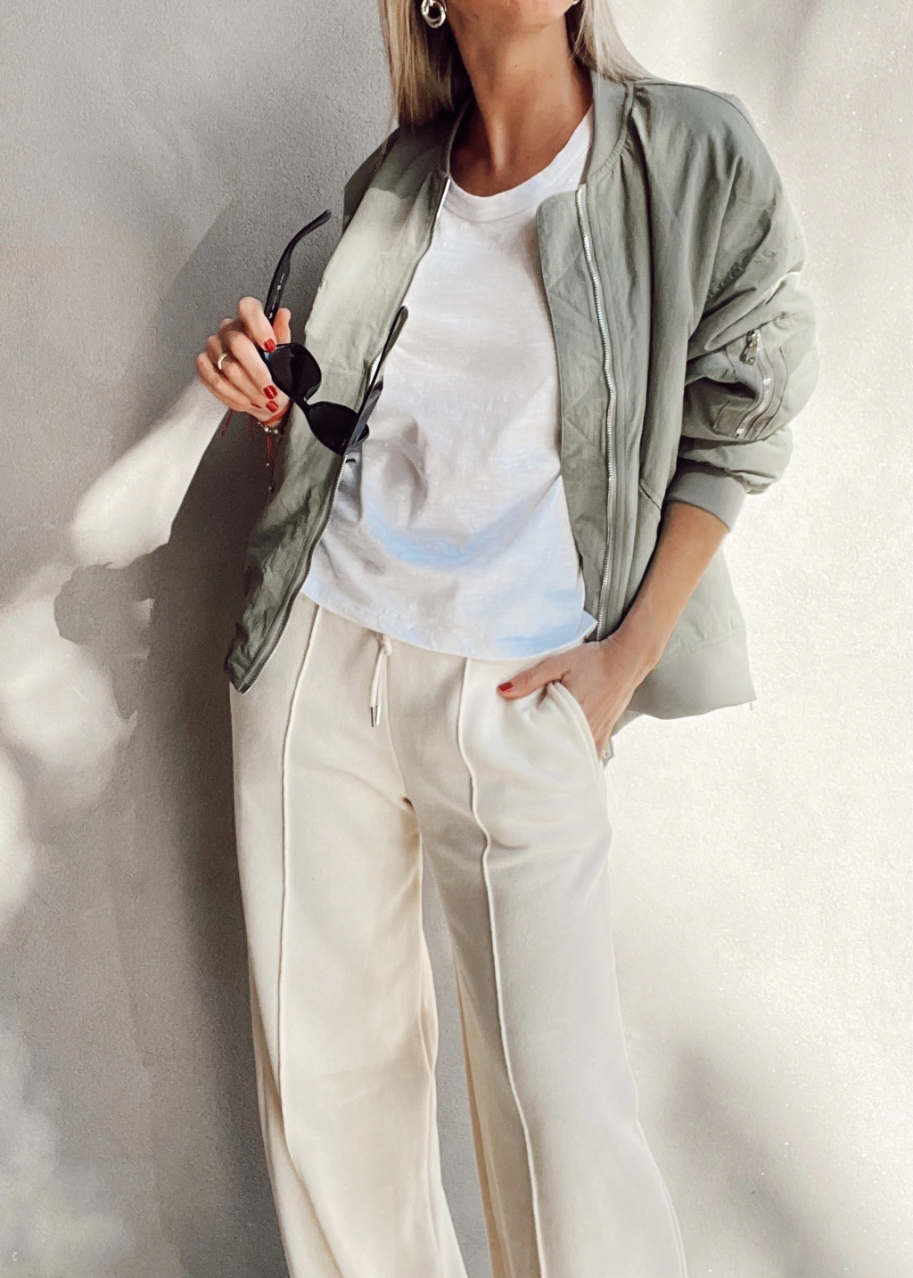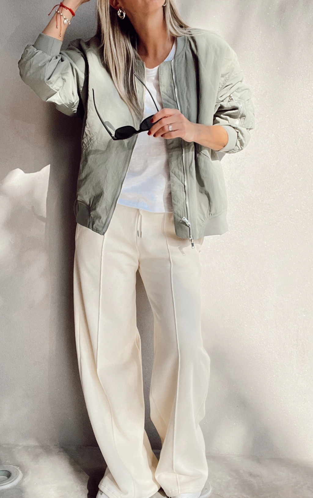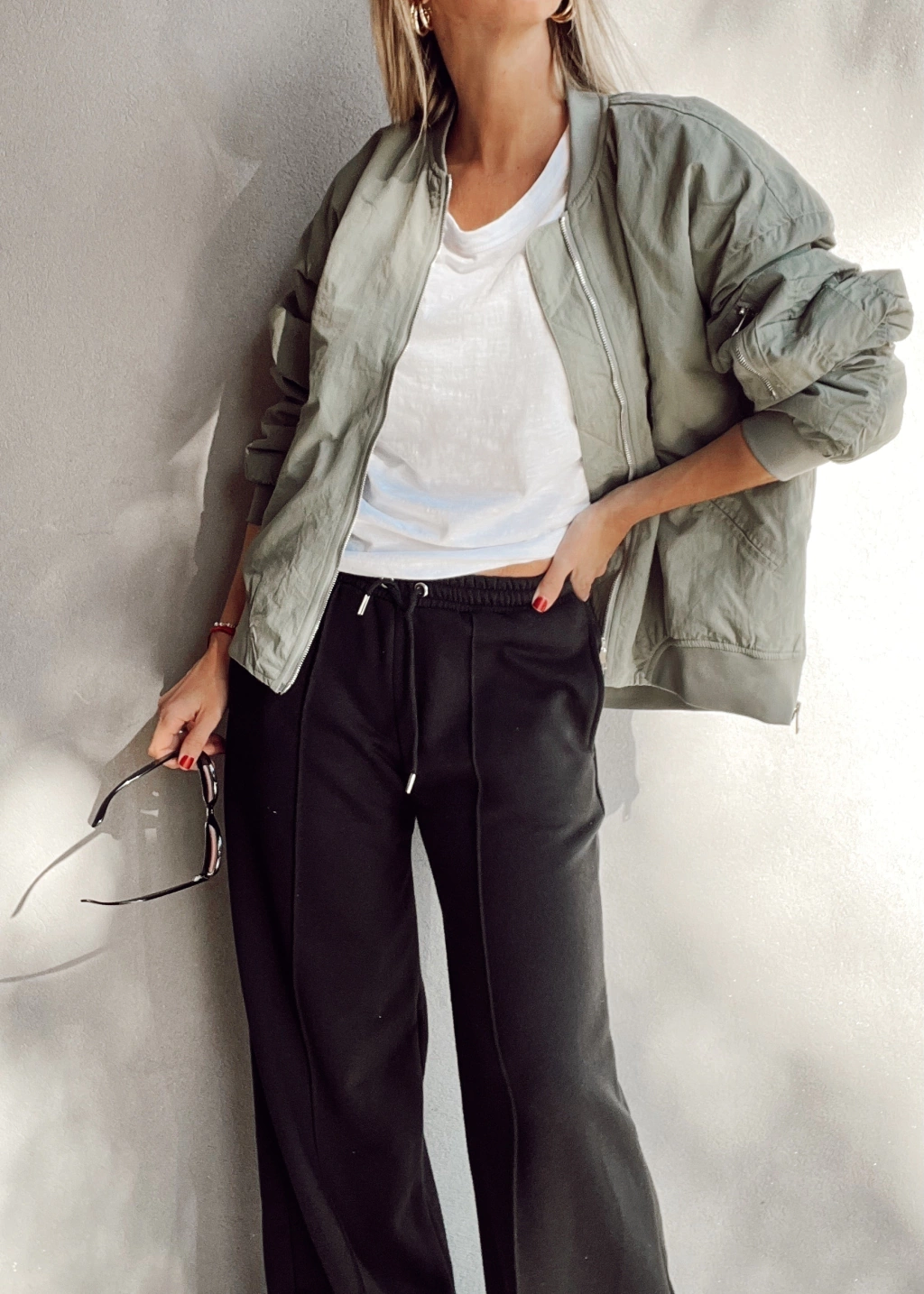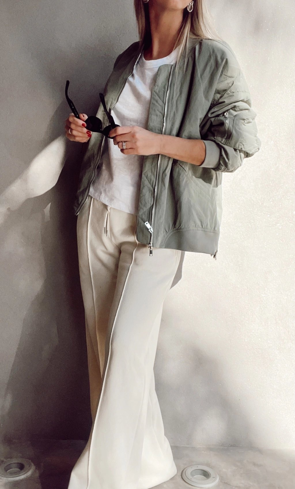 Campera bomber oversize con cierres metálicos al frente y en los laterales. Cuello y puños en rib. Posee un bolsillo lateral en la manga izquierda con cierre metálico y dos costuras con frunce en ambas mangas. Forrada al tono.