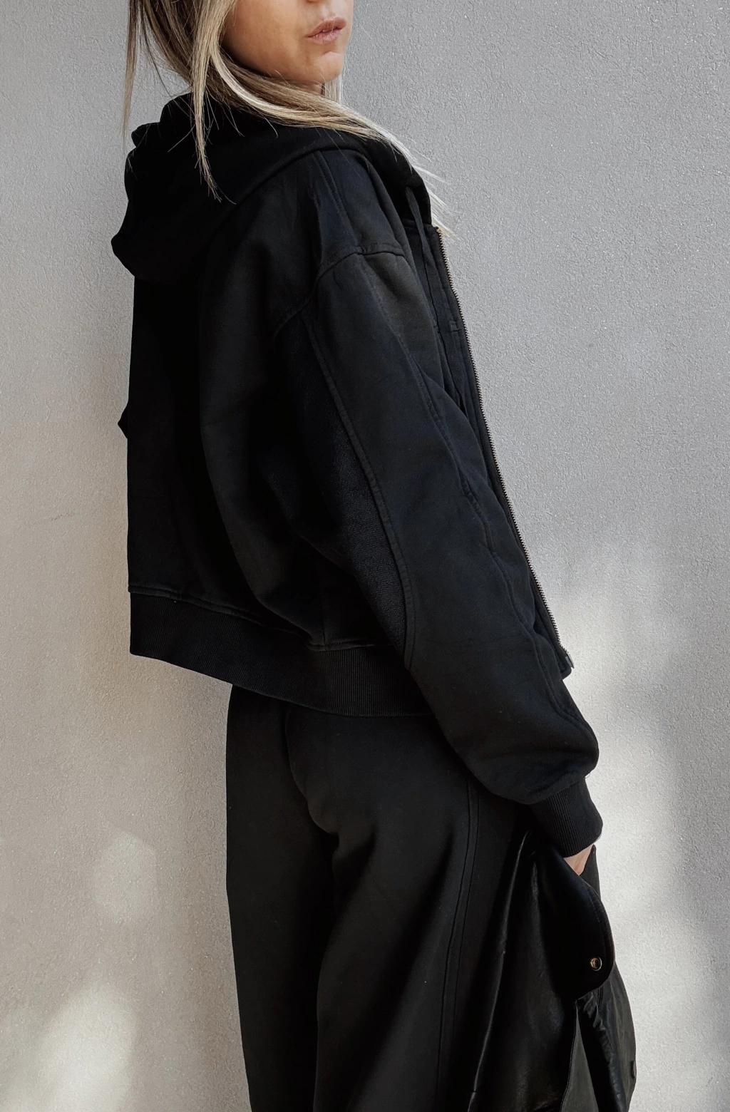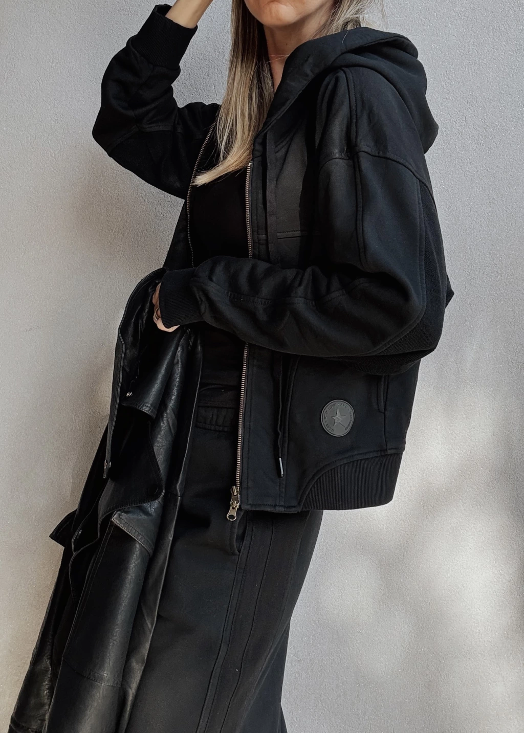 Camperita/Buzo con cierre metálico y capucha con cordón regulable. Posee costuras verticales, bolsillos invisibles frontales y puños en rib de morley en mangas y en cintura. Detalle de aplique de goma al frente.