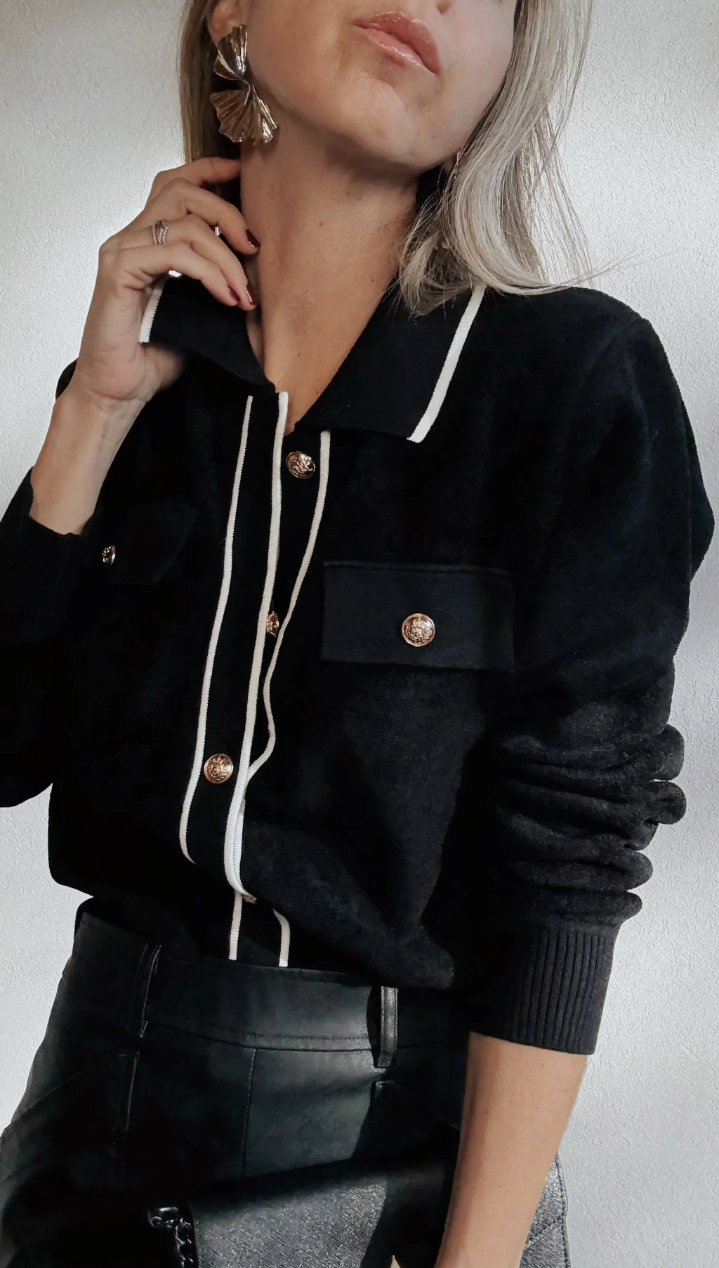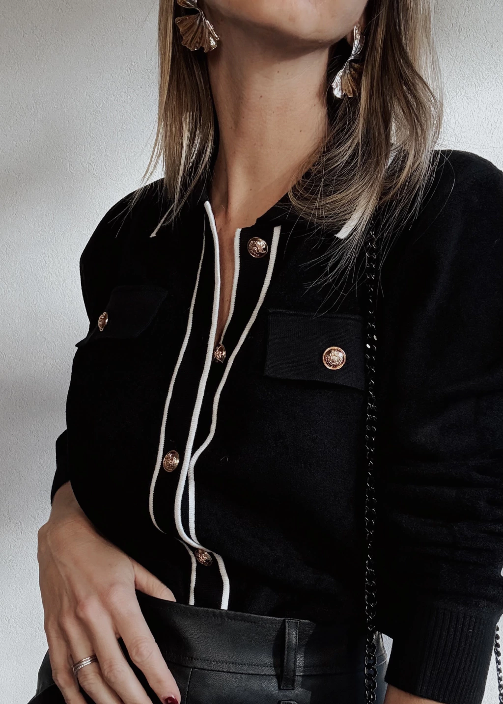 Cardigan cuello redondo con botones dorados, falsos bolsillos al frente con puños en mangas y en cintura.