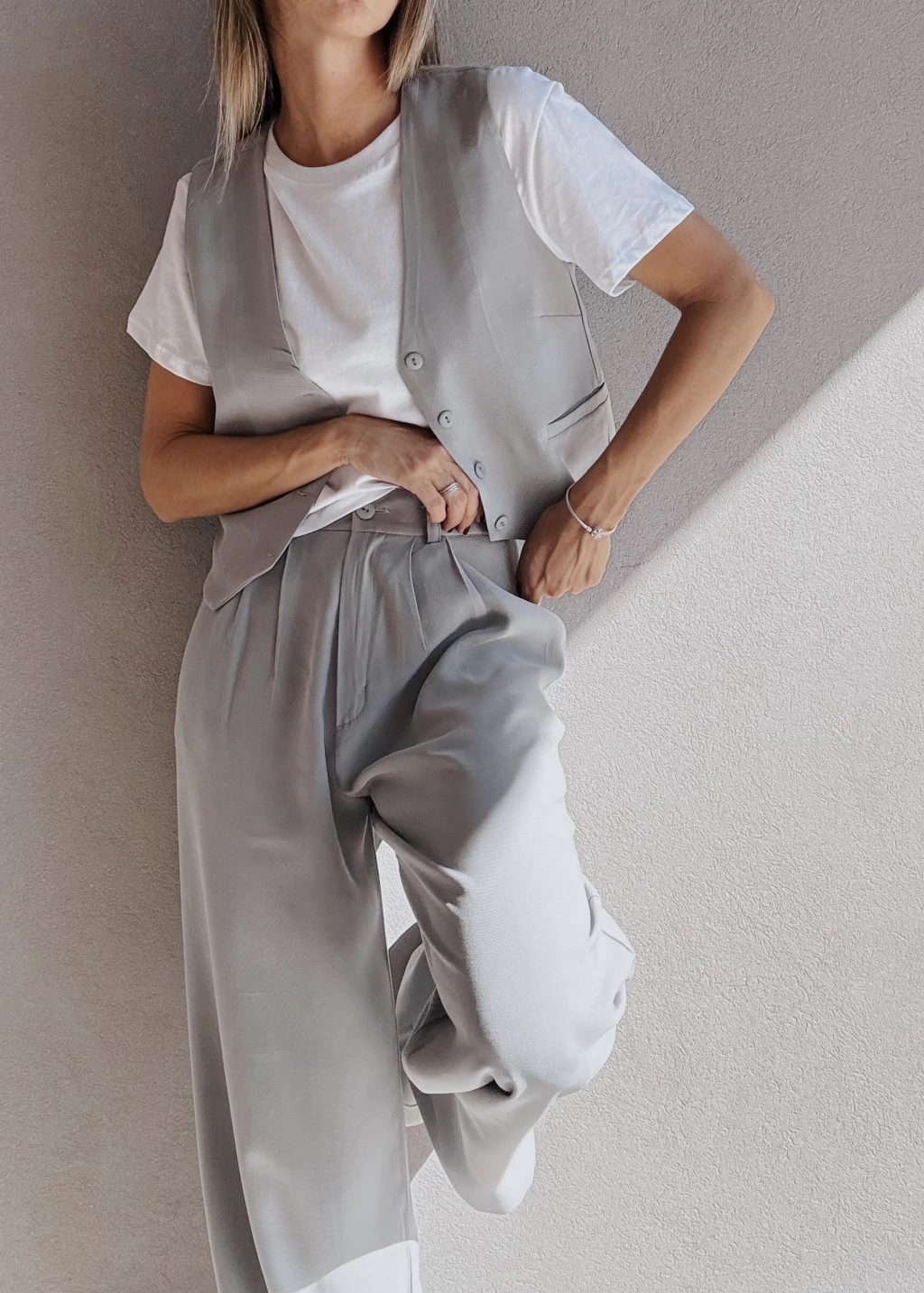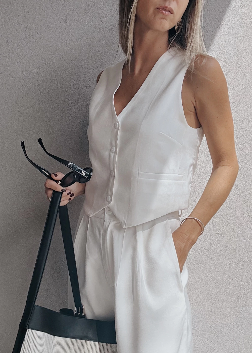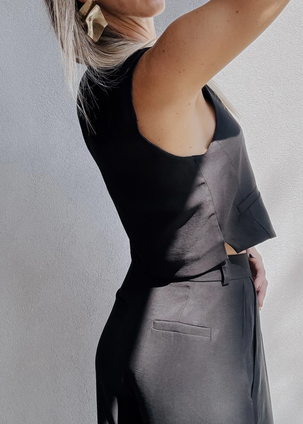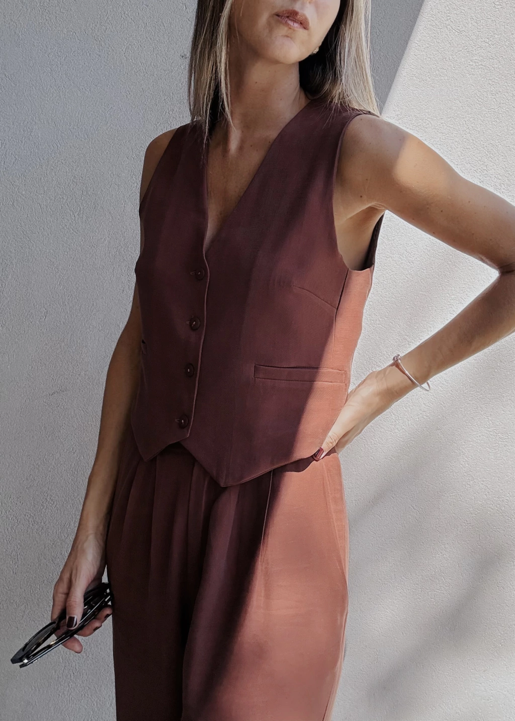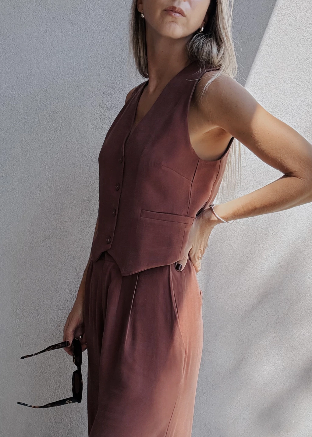 Chaleco sastrero forrado al tono, con botones también al tono y dos falsos bolsillos frontales. Posee pequeñas pinzas en la zona del busto y dos tajitos en los laterales de la cintura.