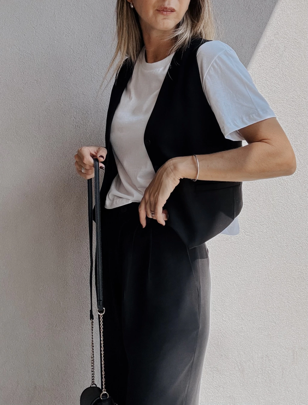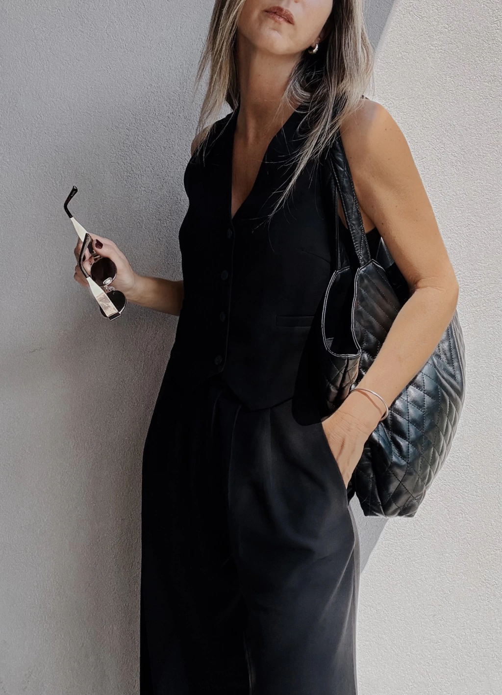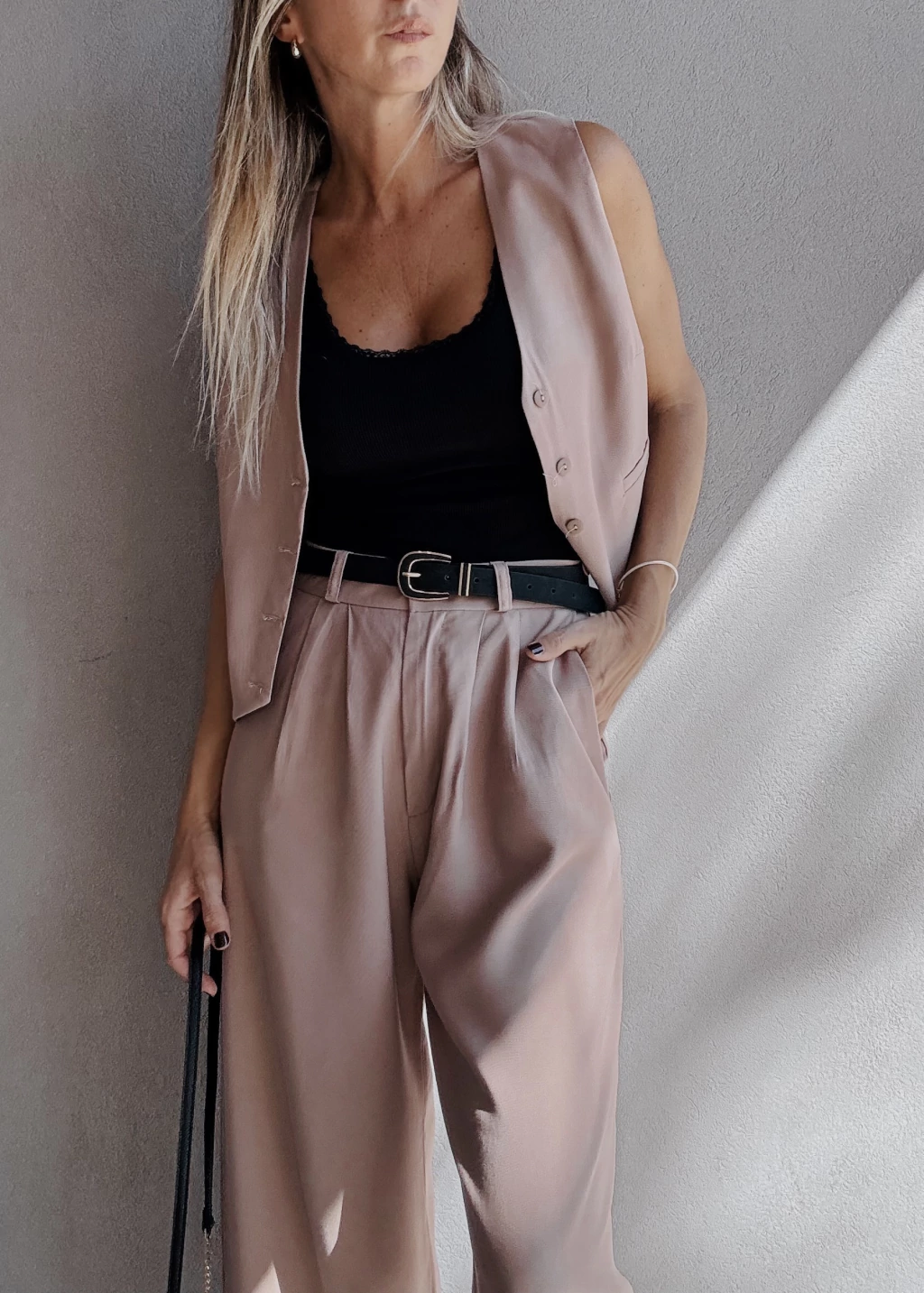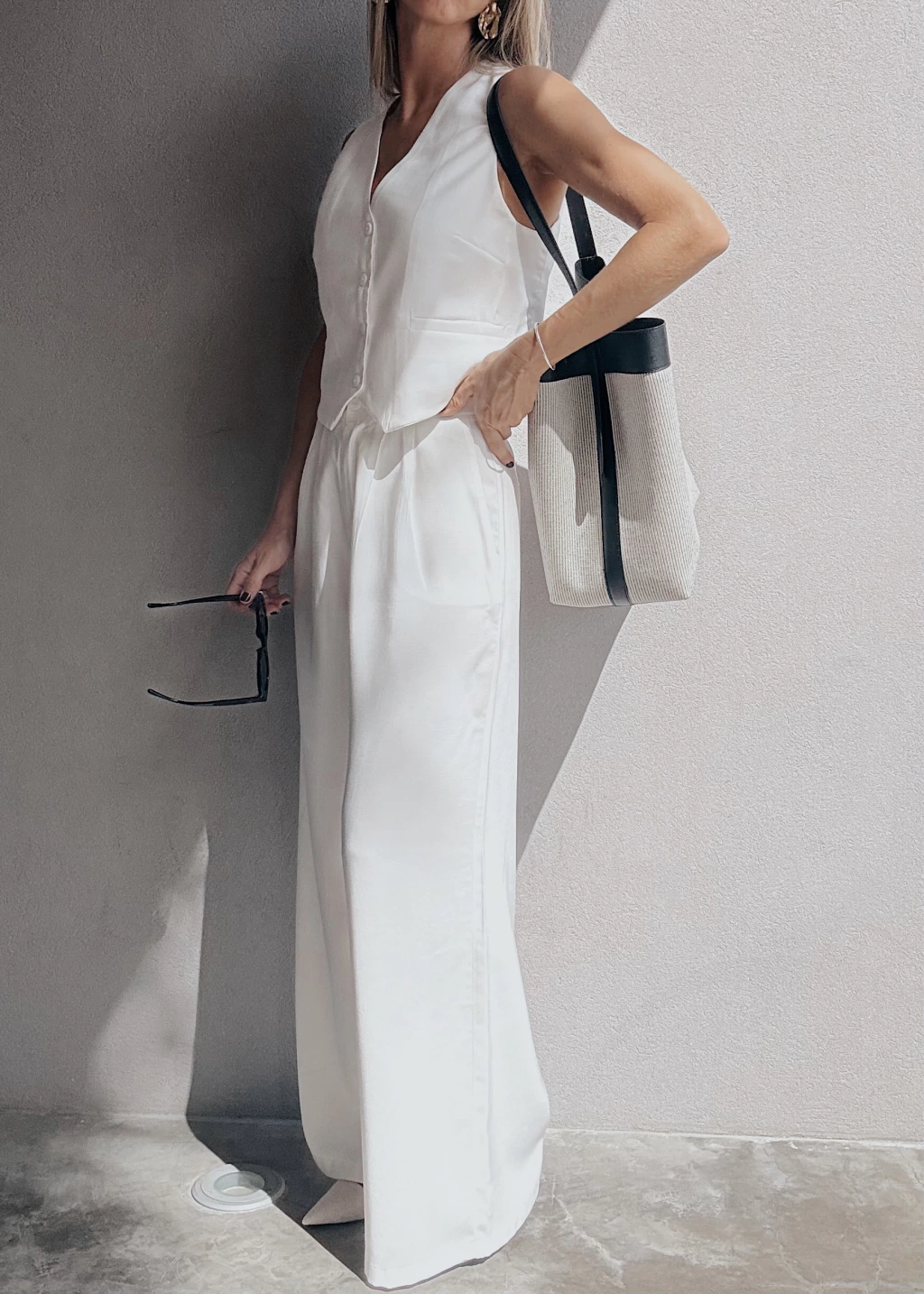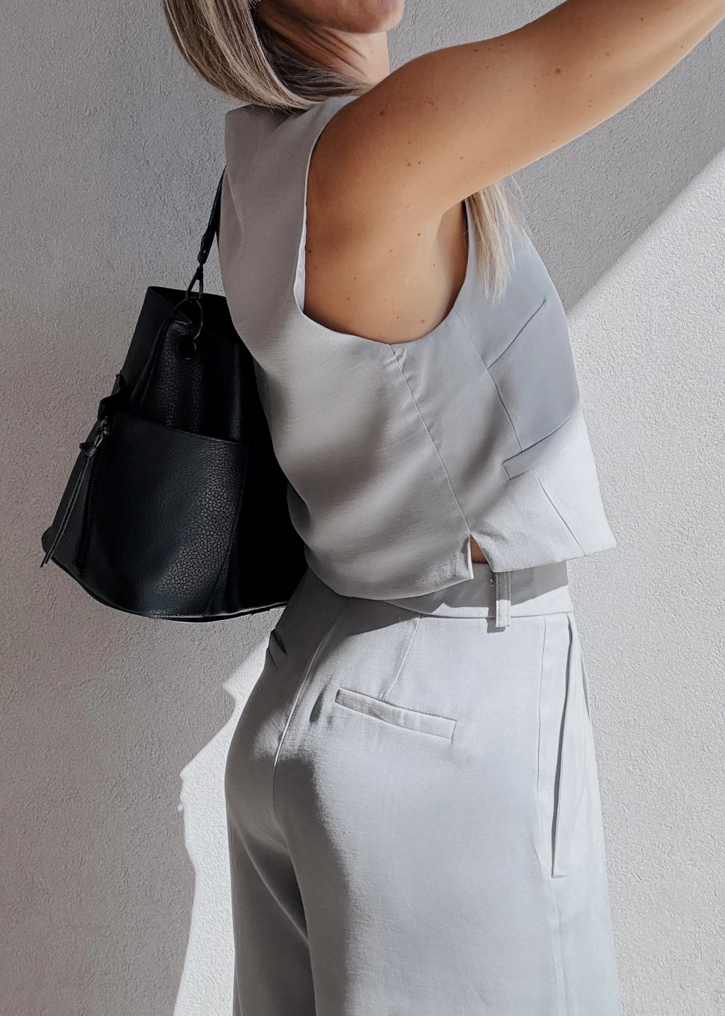 Chaleco sastrero forrado al tono, con botones también al tono y dos falsos bolsillos frontales. Posee pequeñas pinzas en la zona del busto y dos tajitos en los laterales de la cintura.