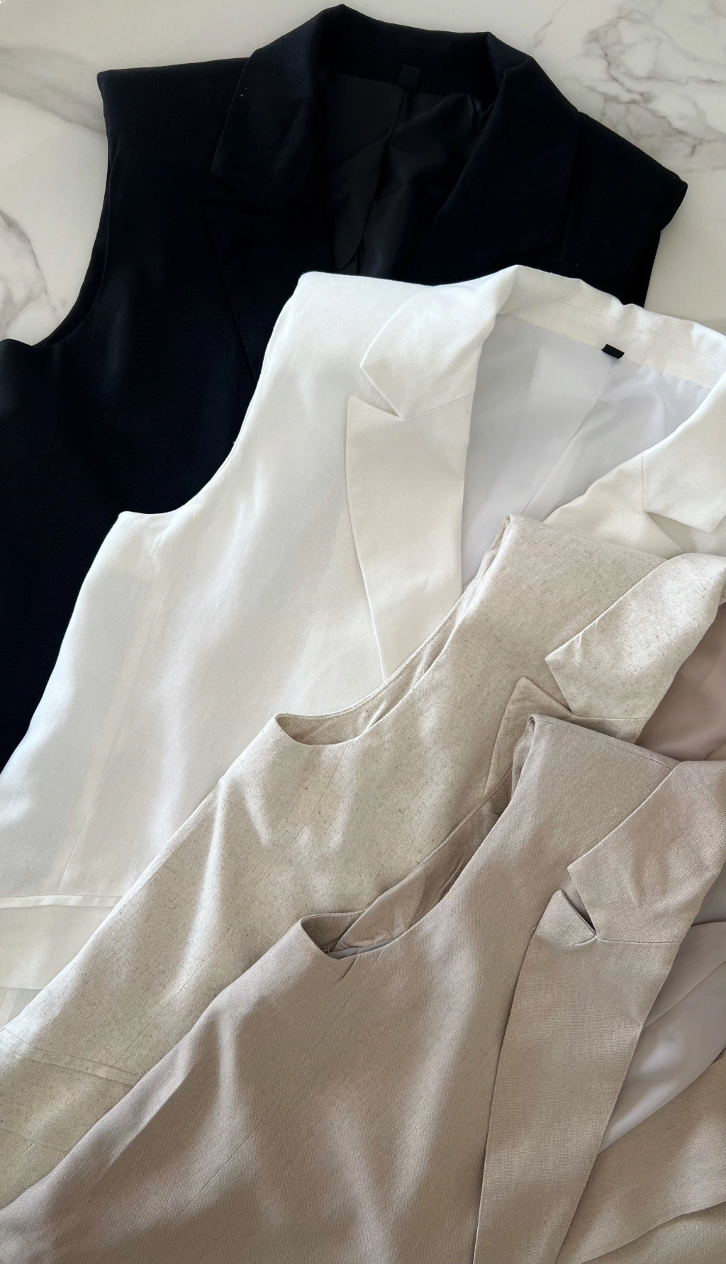 Chaleco sin mangas, cruzado, con dos botones reales simil madera, semi entallado. Está forrado al tono y posee tapas de falsos bolsillos delanteros.
