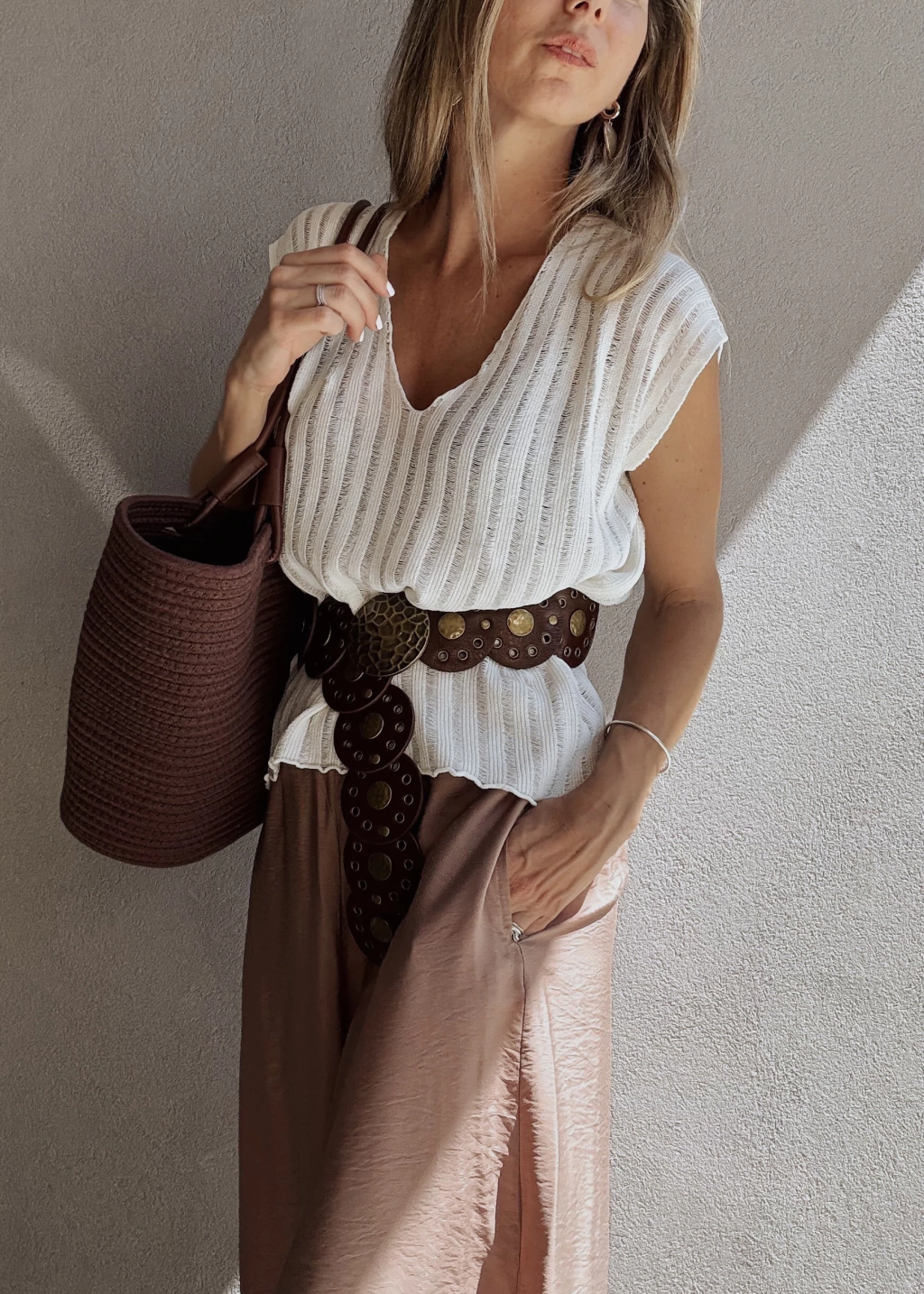 Cinturón tipo faja de cuero con gran hebilla metálica. Posee círculos de cuero con detalles de distintas tachas y arandelas en toda la superficie.