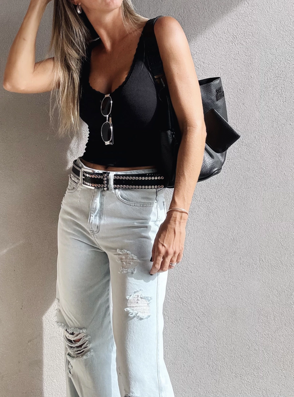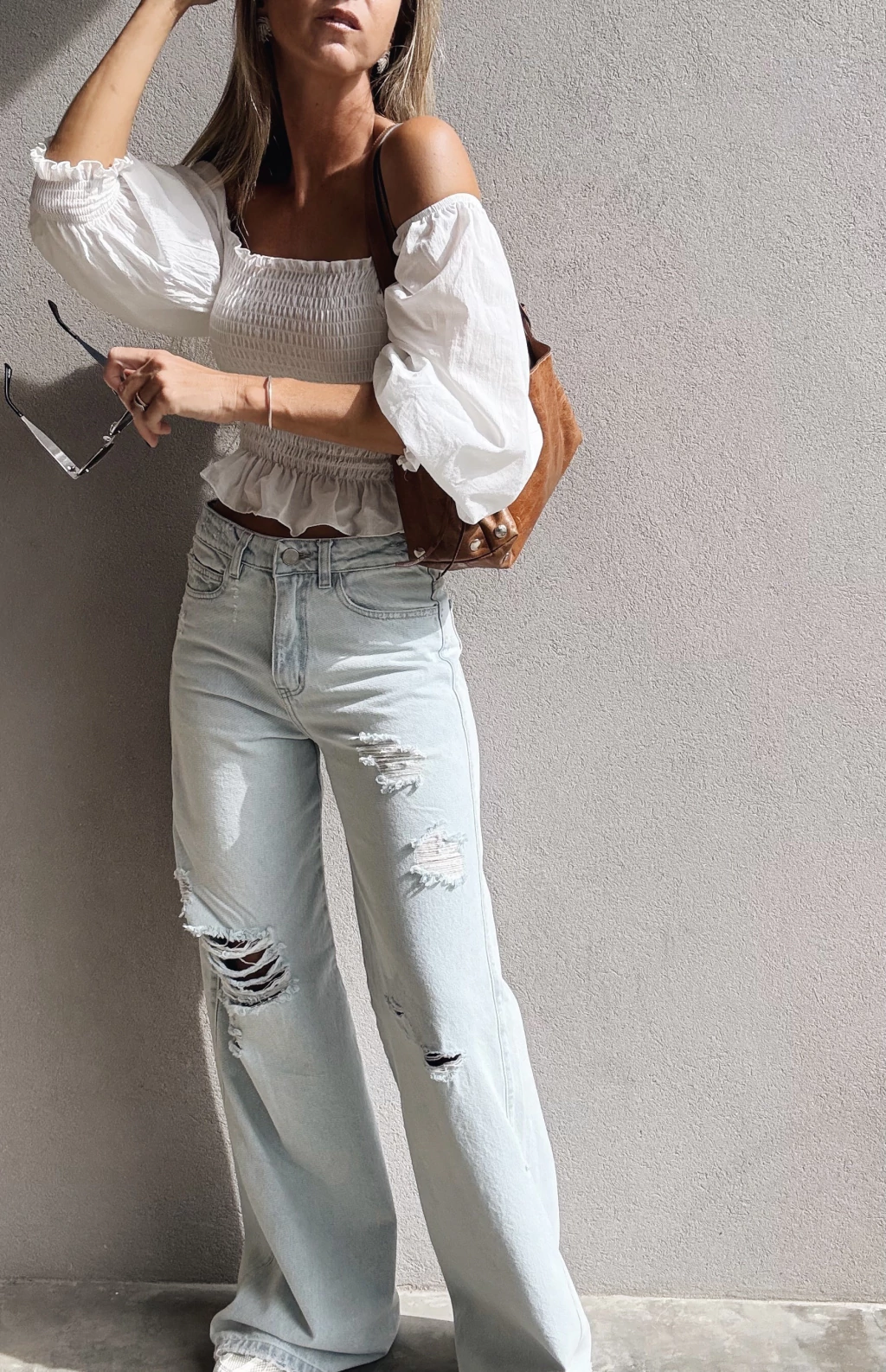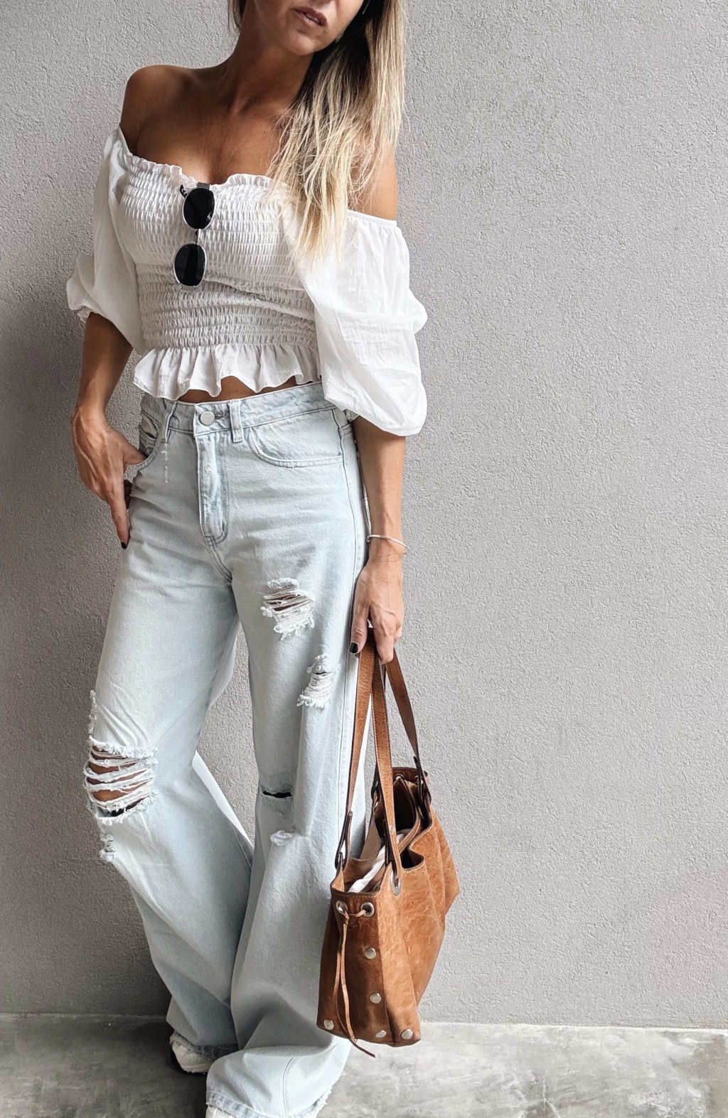 Jean rígido tiro alto, wide leg con desgastes y roturas.