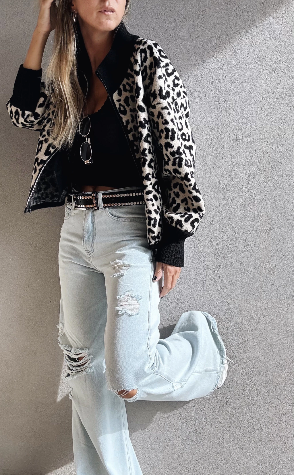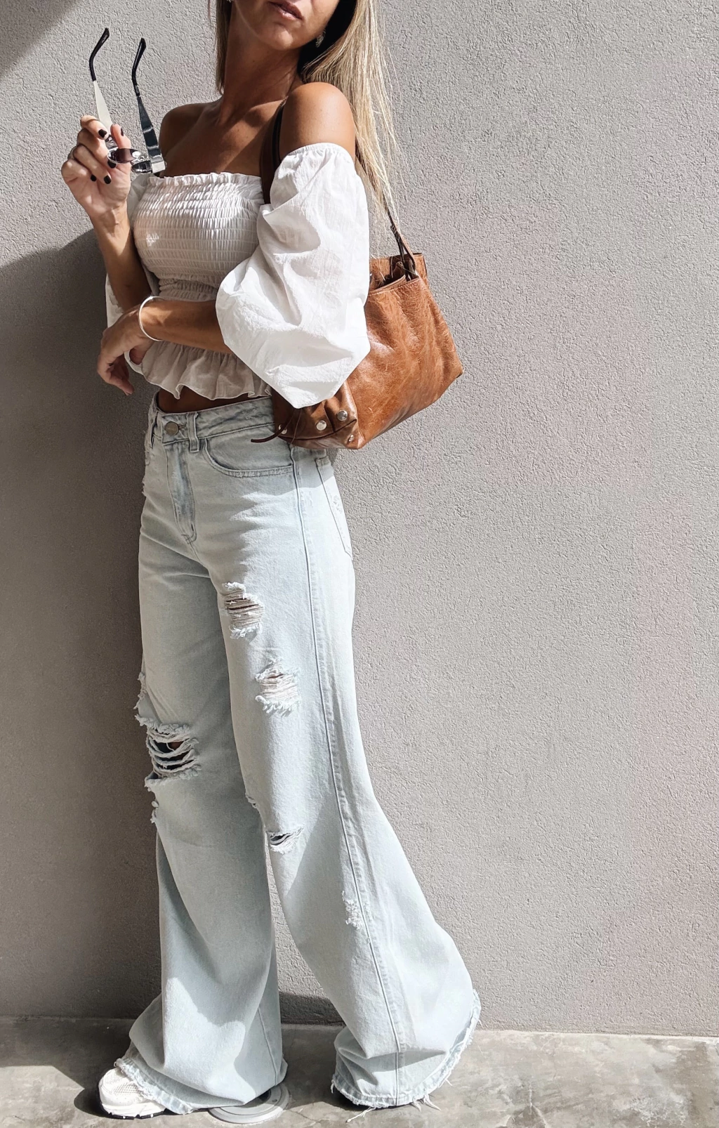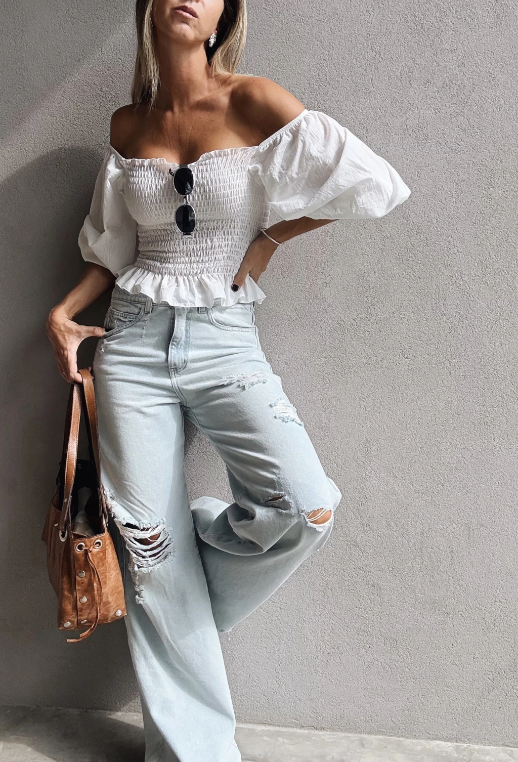 Jean rígido tiro alto, wide leg con desgastes y roturas.