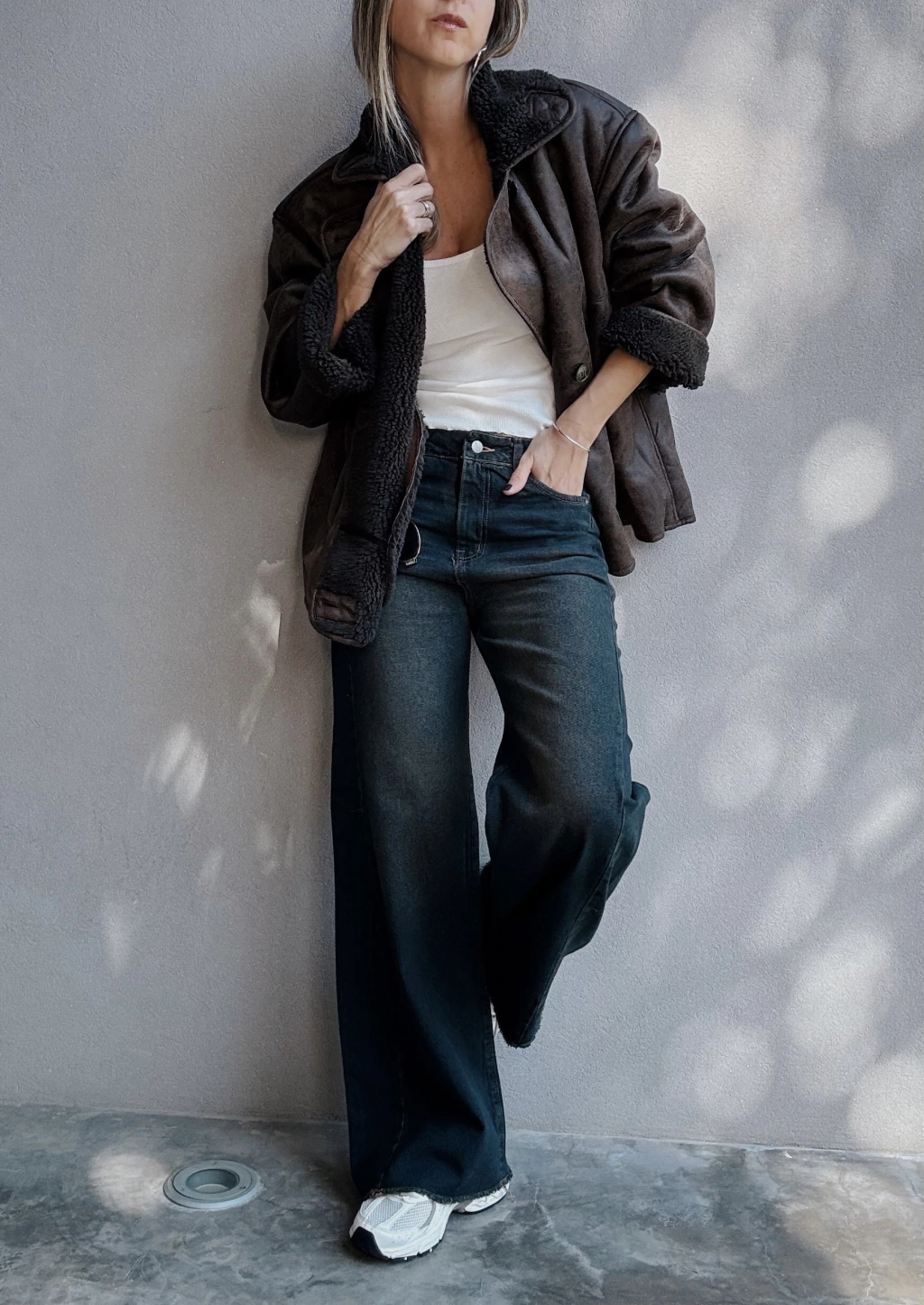 Jean rígido tiro "medio" , wide leg con recorte en lateral ampliando la pierna, blandito, súper cómodo. Ruedo desflecado. Con costuras en óxido.