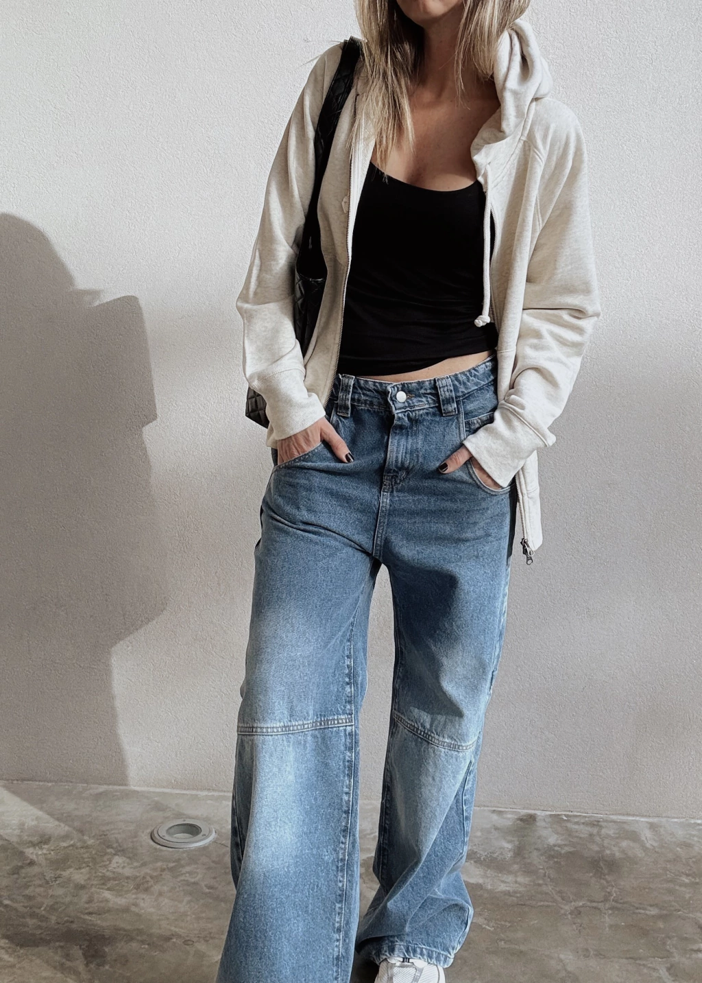 Jean recto con costuras horizontales en la zona de la rodilla y bolsillos traseros tipo parches con costuras en óxido hasta la parte la media pierna. Varios bolsillos frontales, súper canchero.