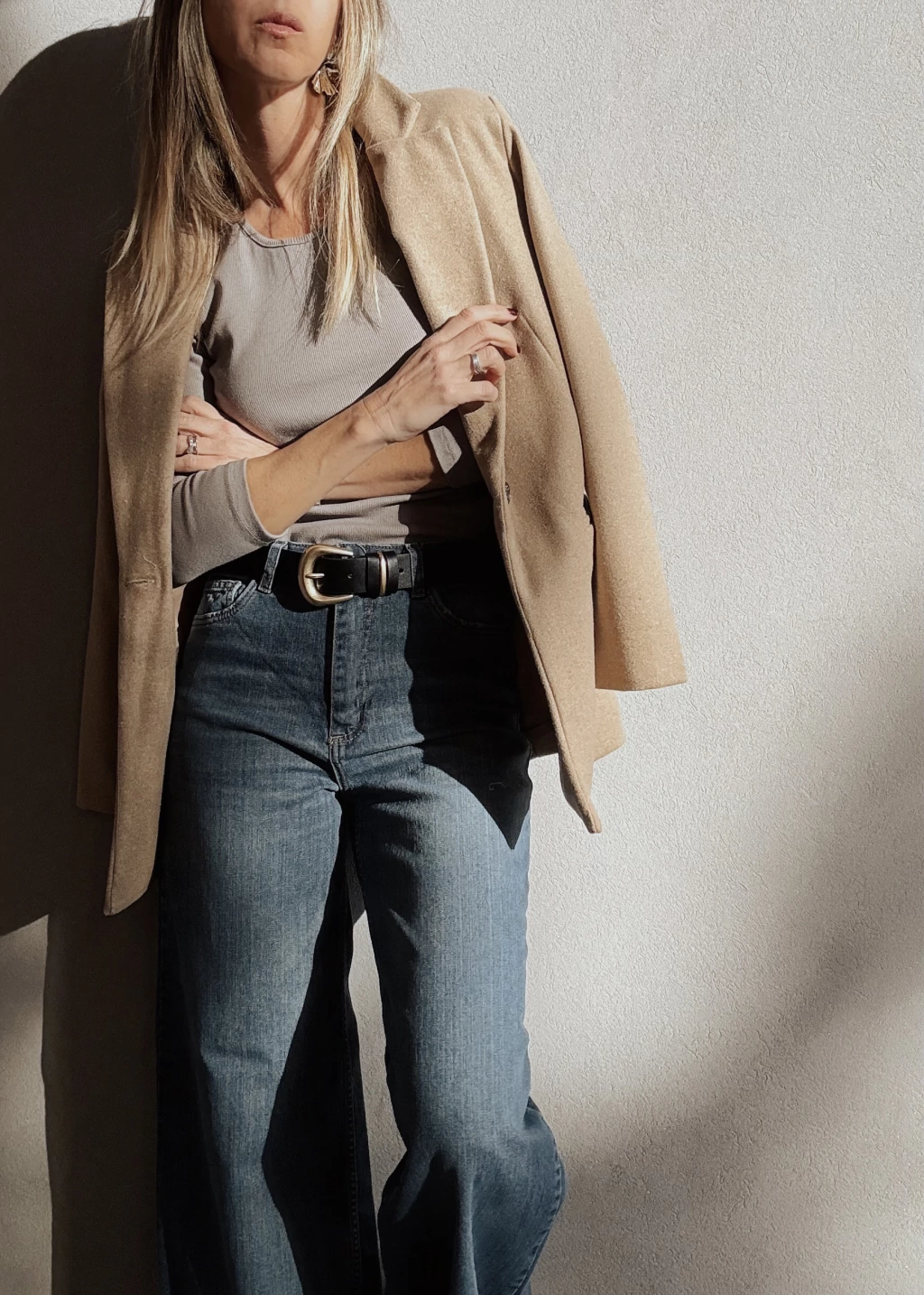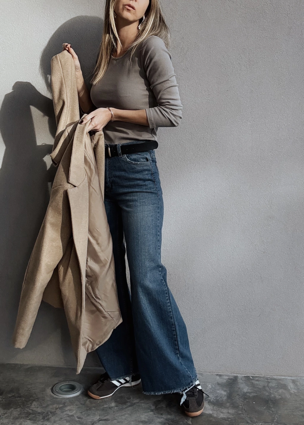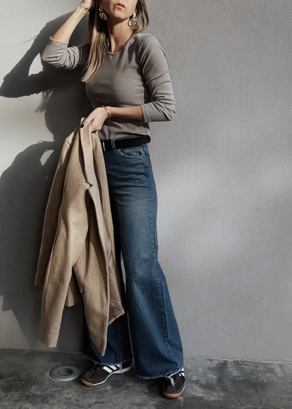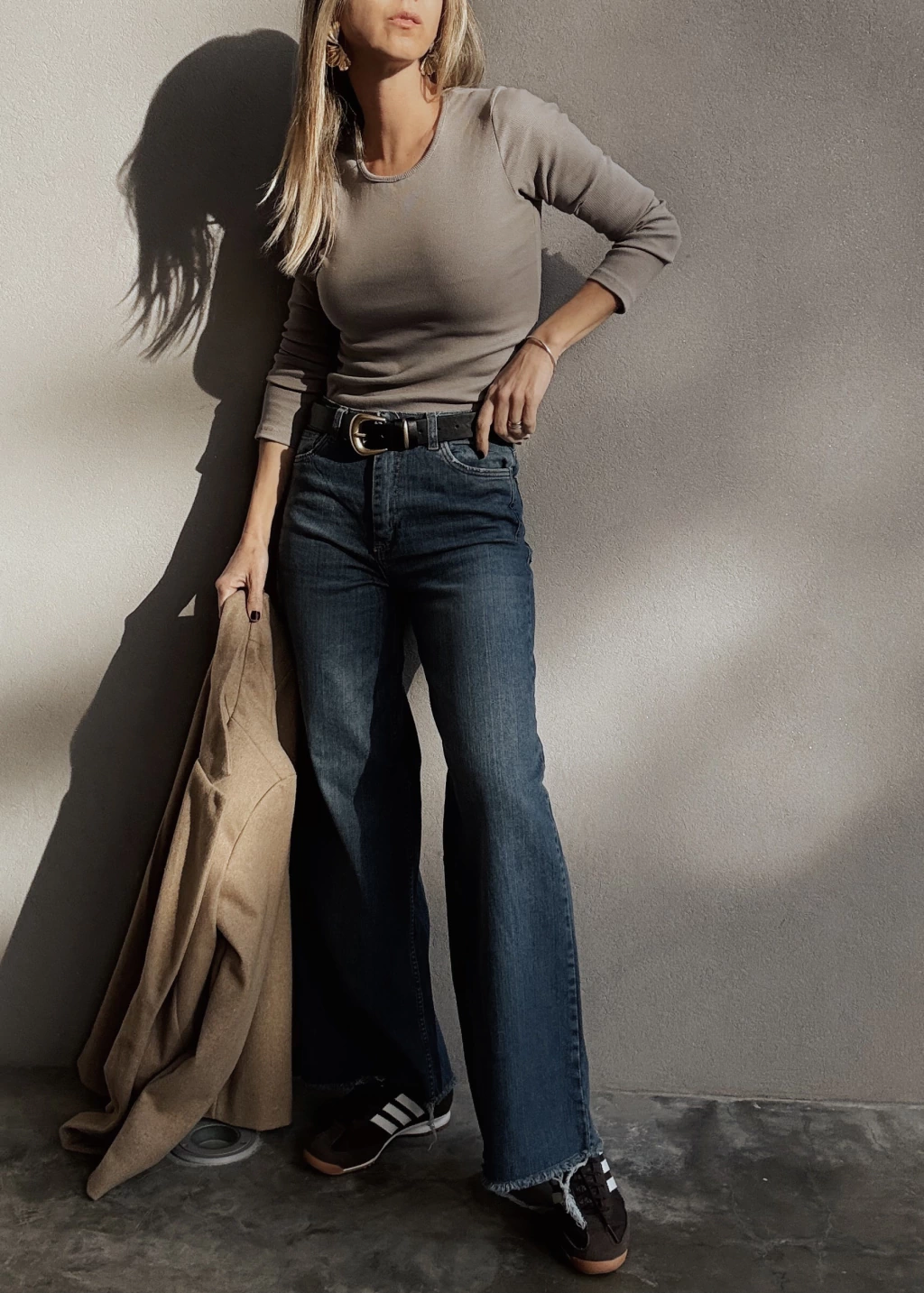 Jean desgastado wide leg, tiro alto, 5 bolsillos y ruedo al corte.