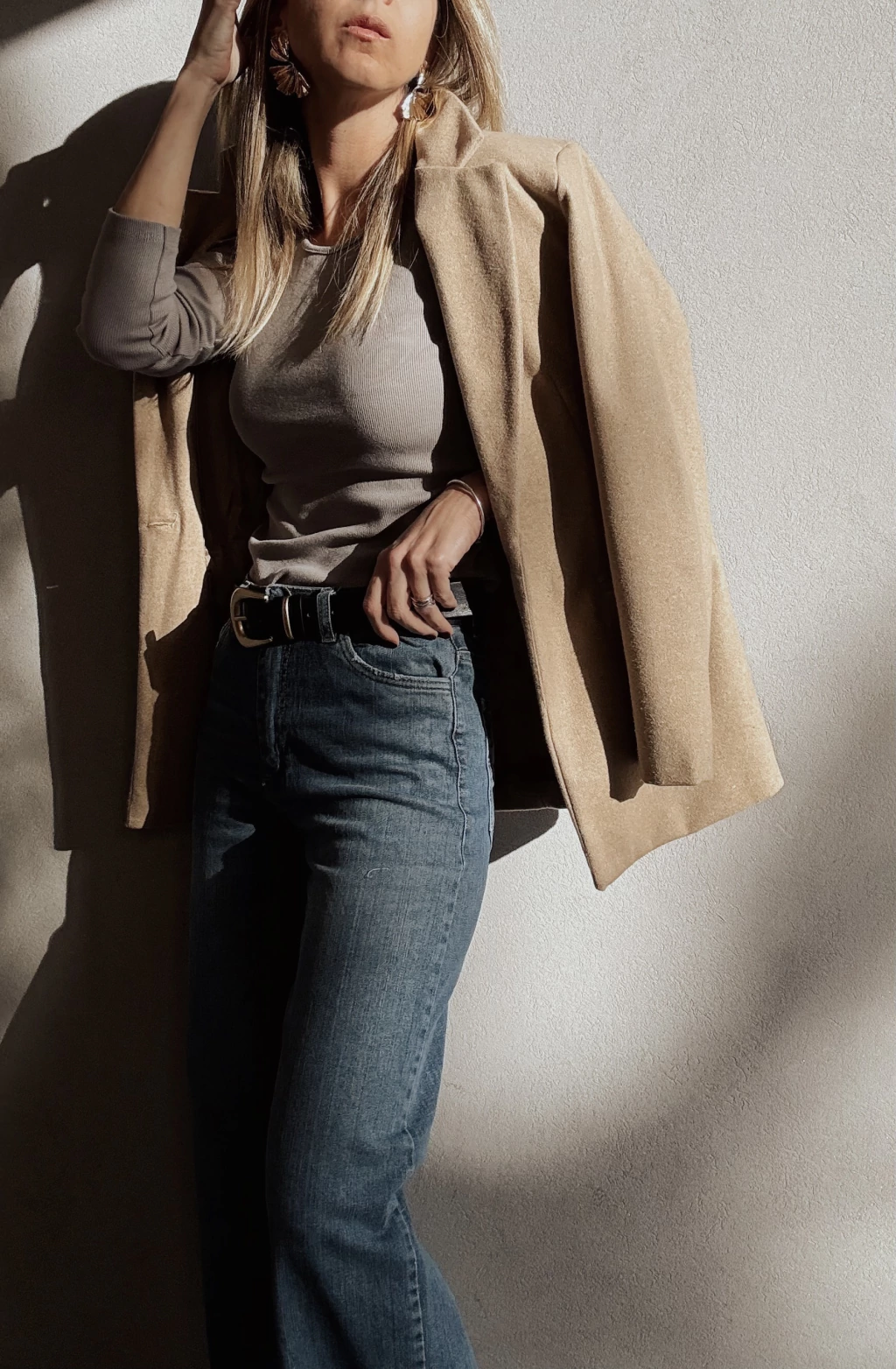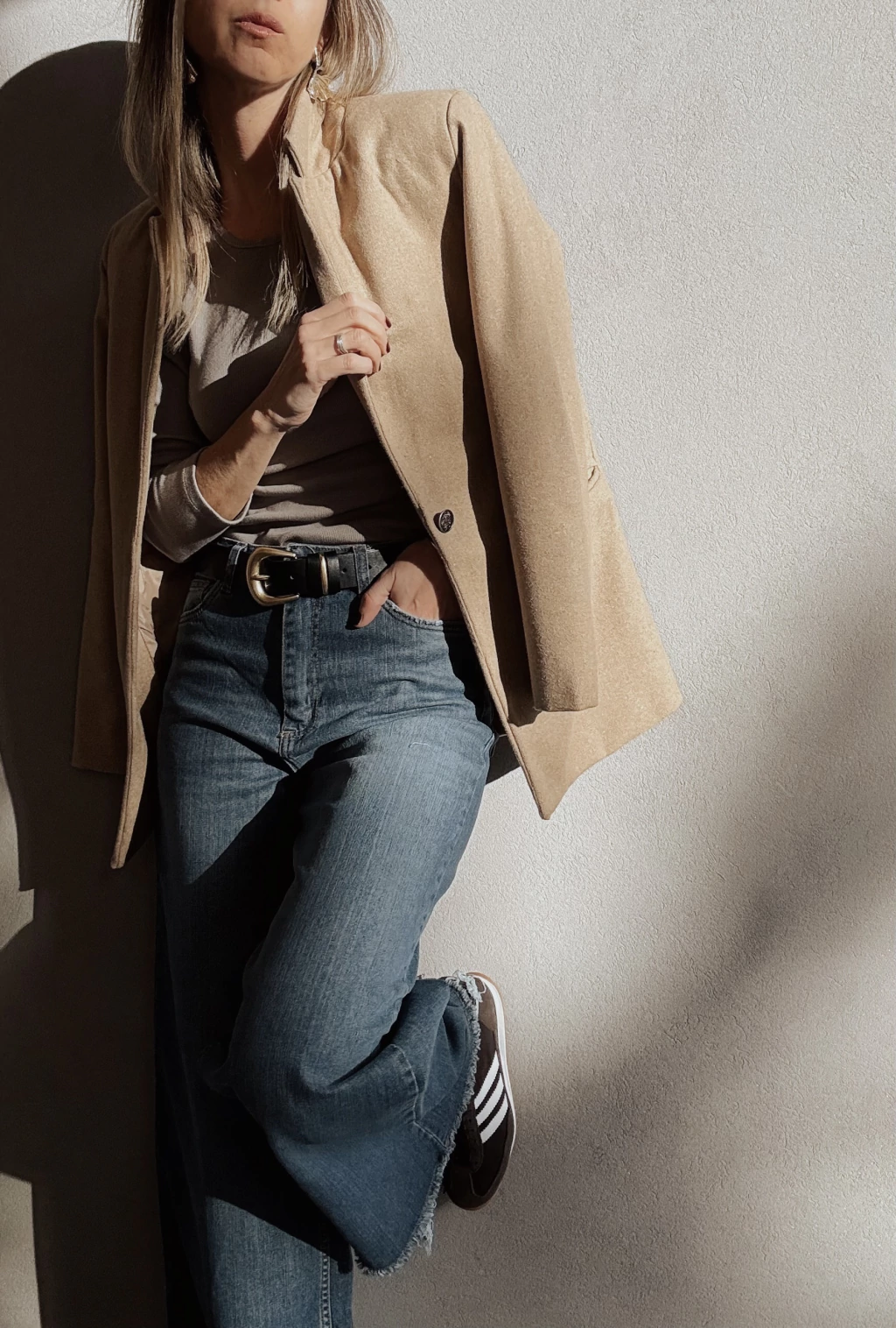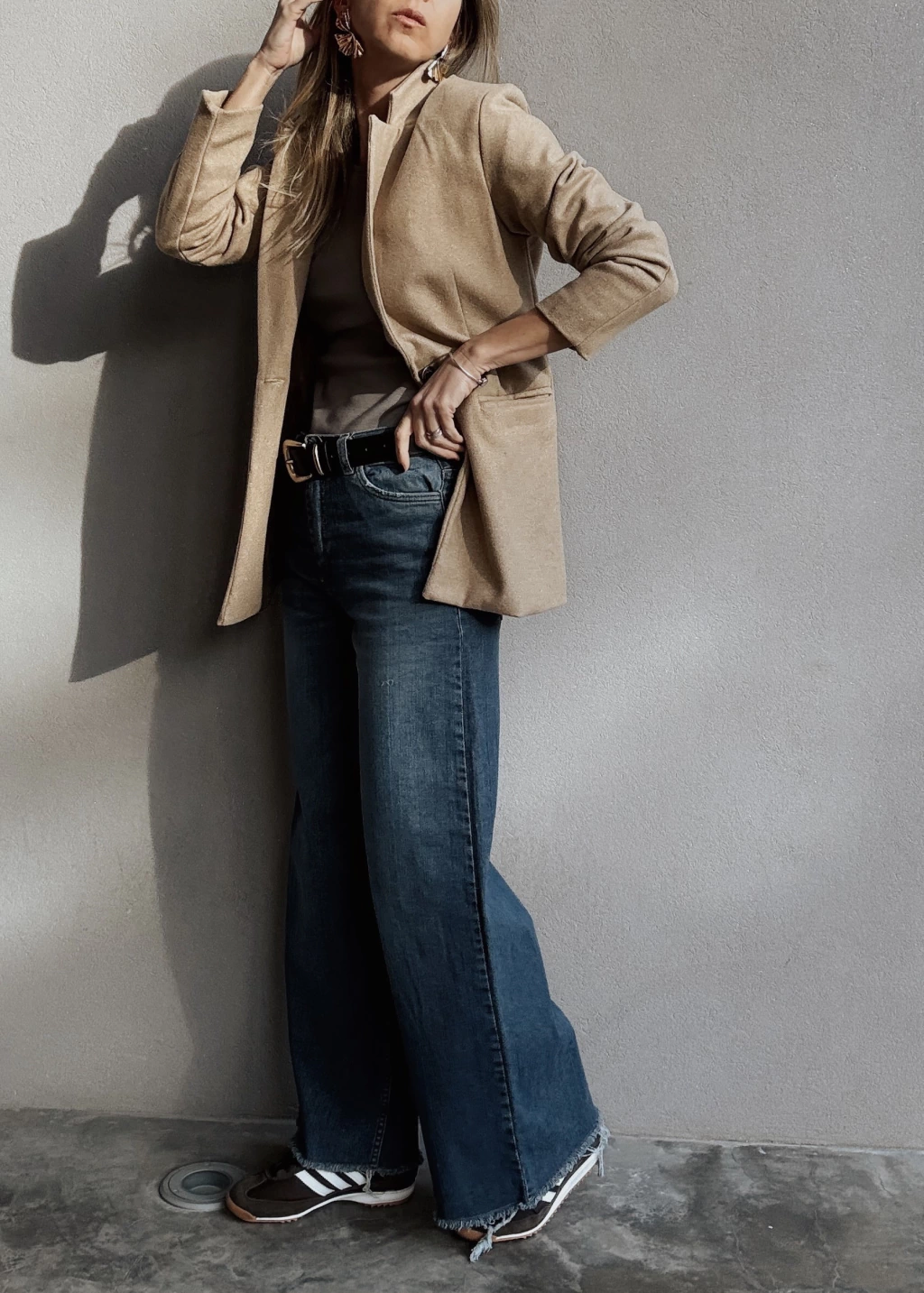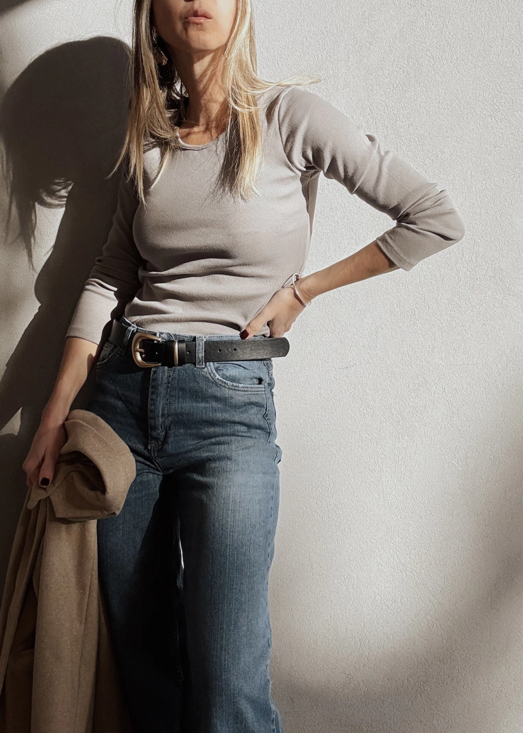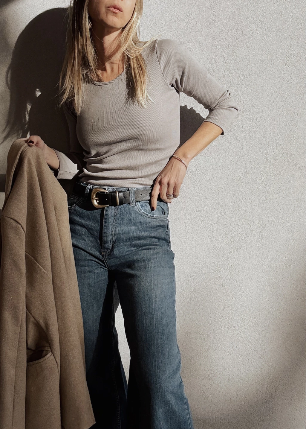 Jean desgastado wide leg, tiro alto, 5 bolsillos y ruedo al corte.