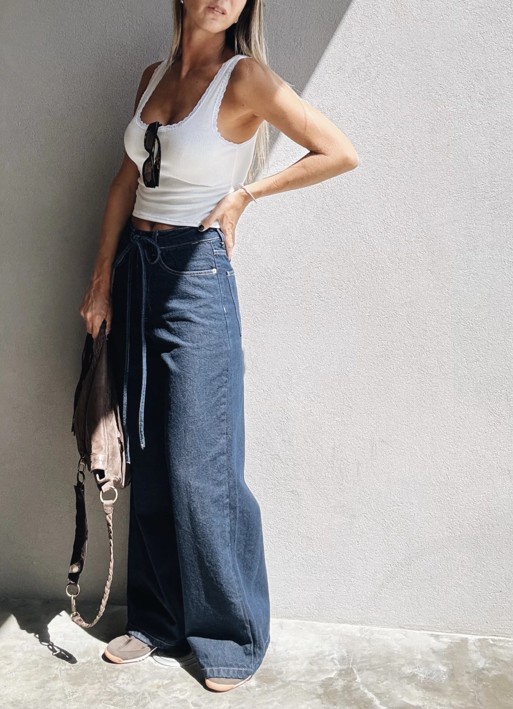 Jean rígido tiro LARGO alto, wide leg, con lazo regulable, al tono, en la cintura.