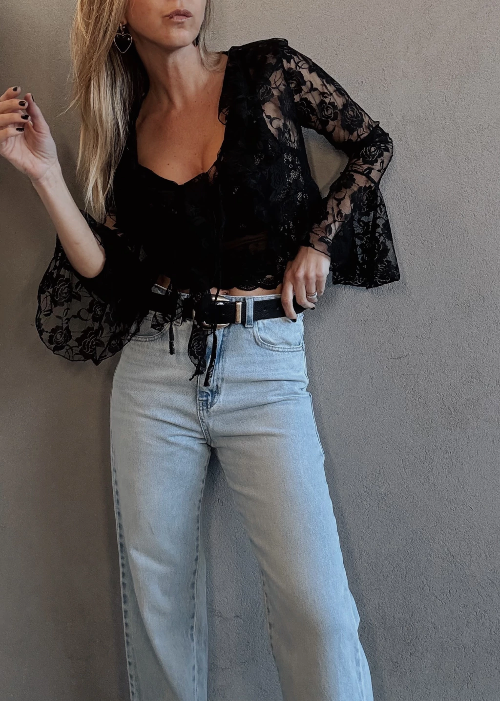 Jean rígido tiro alto, straight, cinco bolsillos con presillas.
