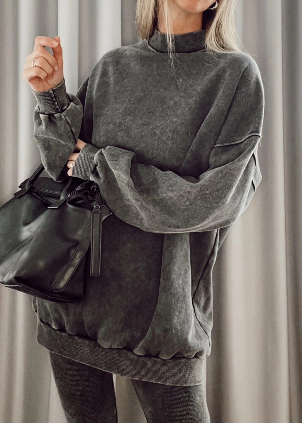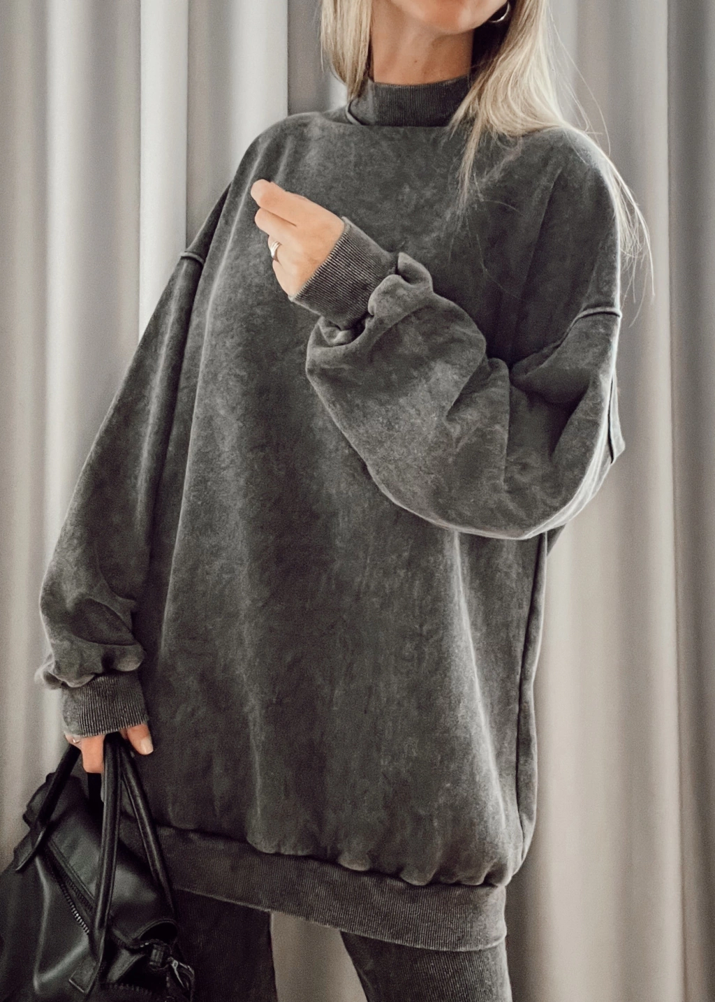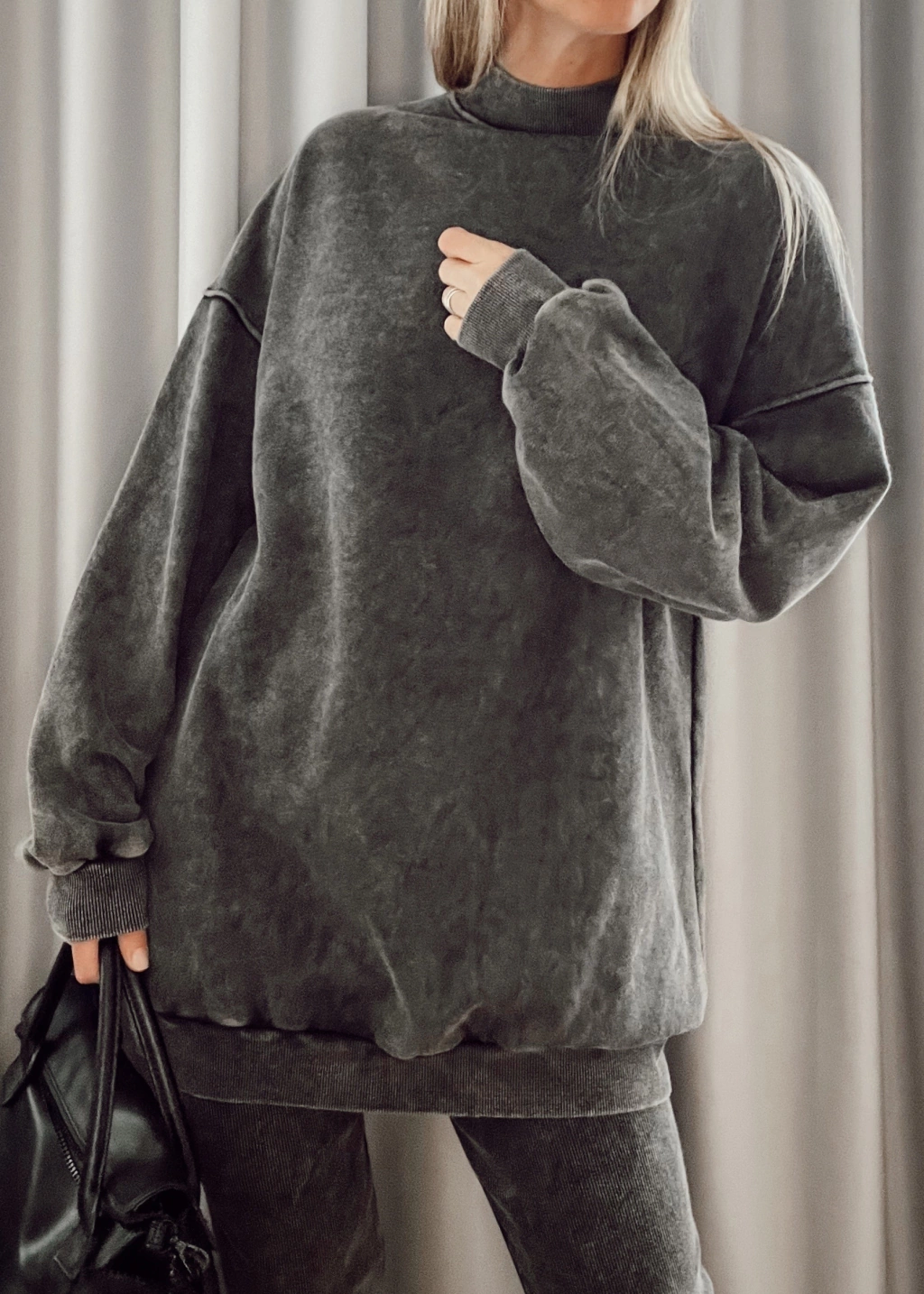 Mazi buzo, largo, cuello alto tipo media polera manga larga con puños en mangas y en cintura.