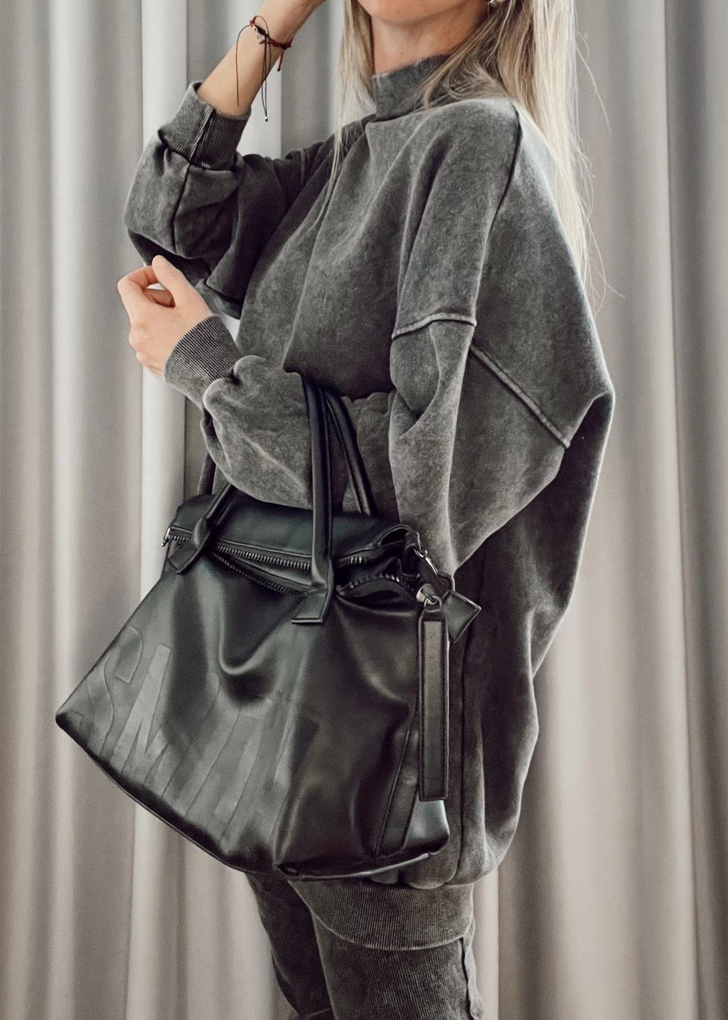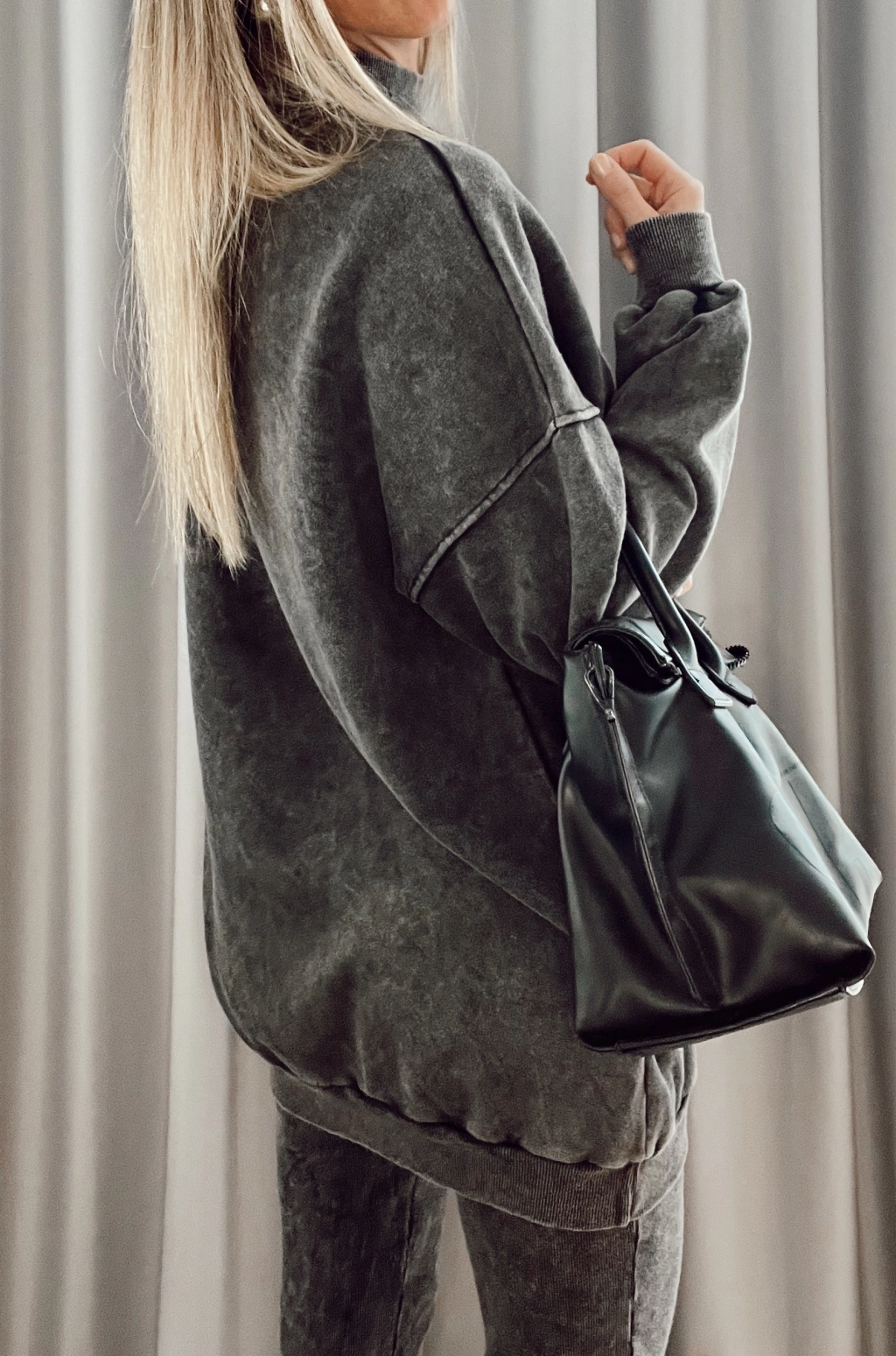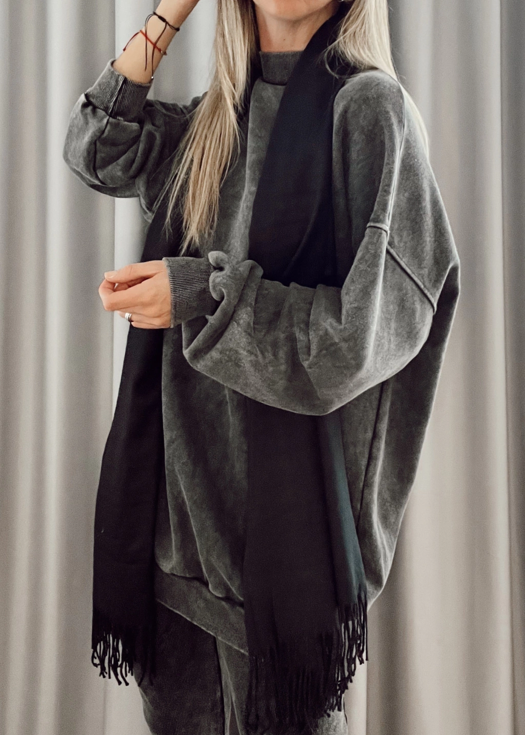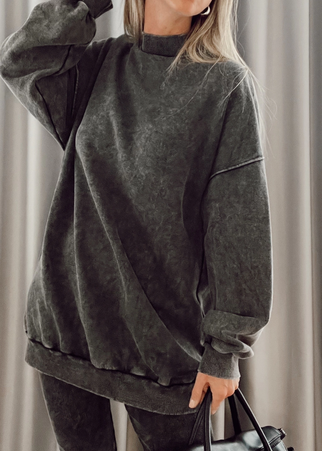 Mazi buzo, largo, cuello alto tipo media polera manga larga con puños en mangas y en cintura.