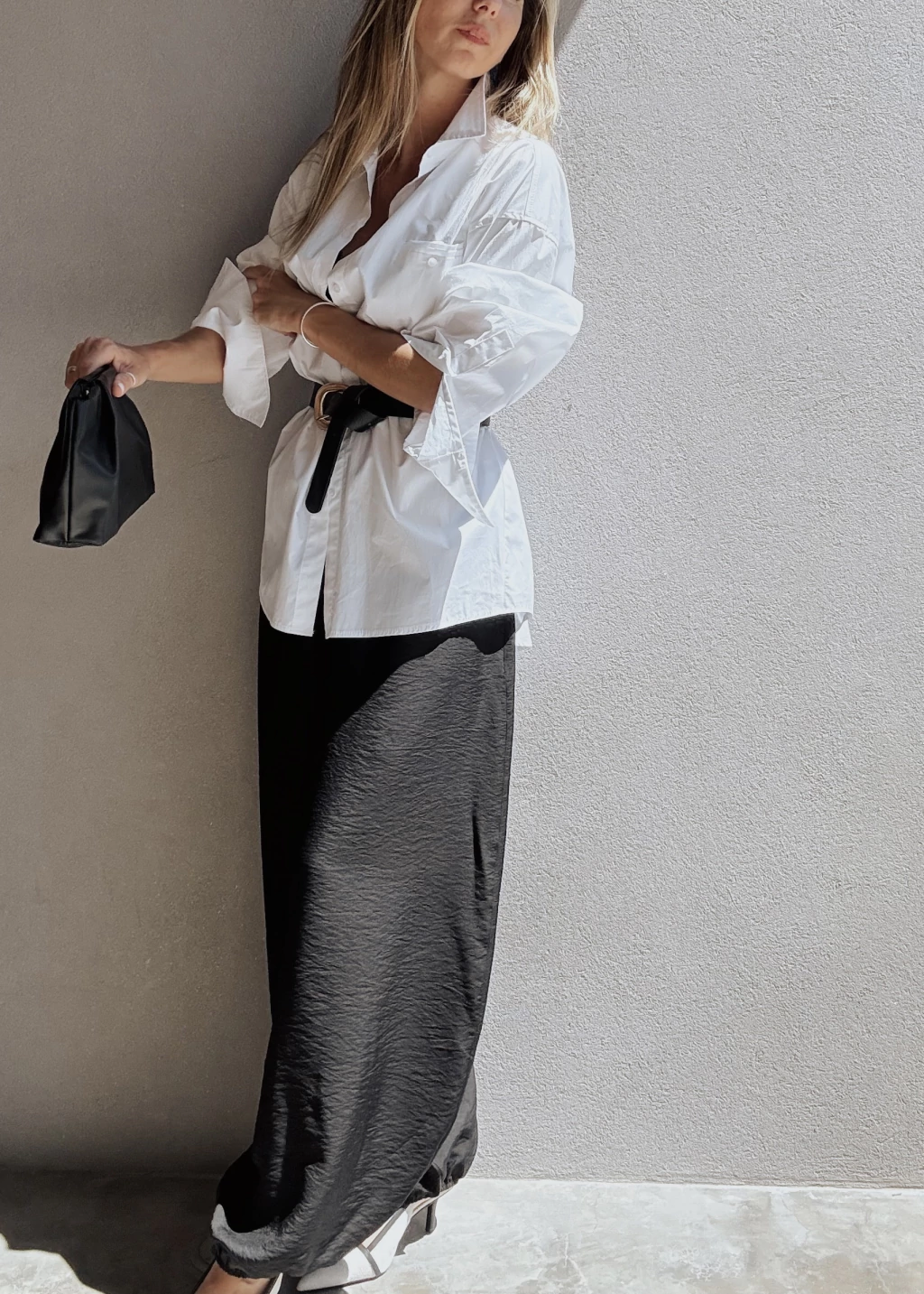 Maxi camisa, larga, de poplin, con puños anchos y botones simil nacar. Más larga atrás que adelante, con terminación redondeada. Posee bolsillo ojal con botón y alforzas.