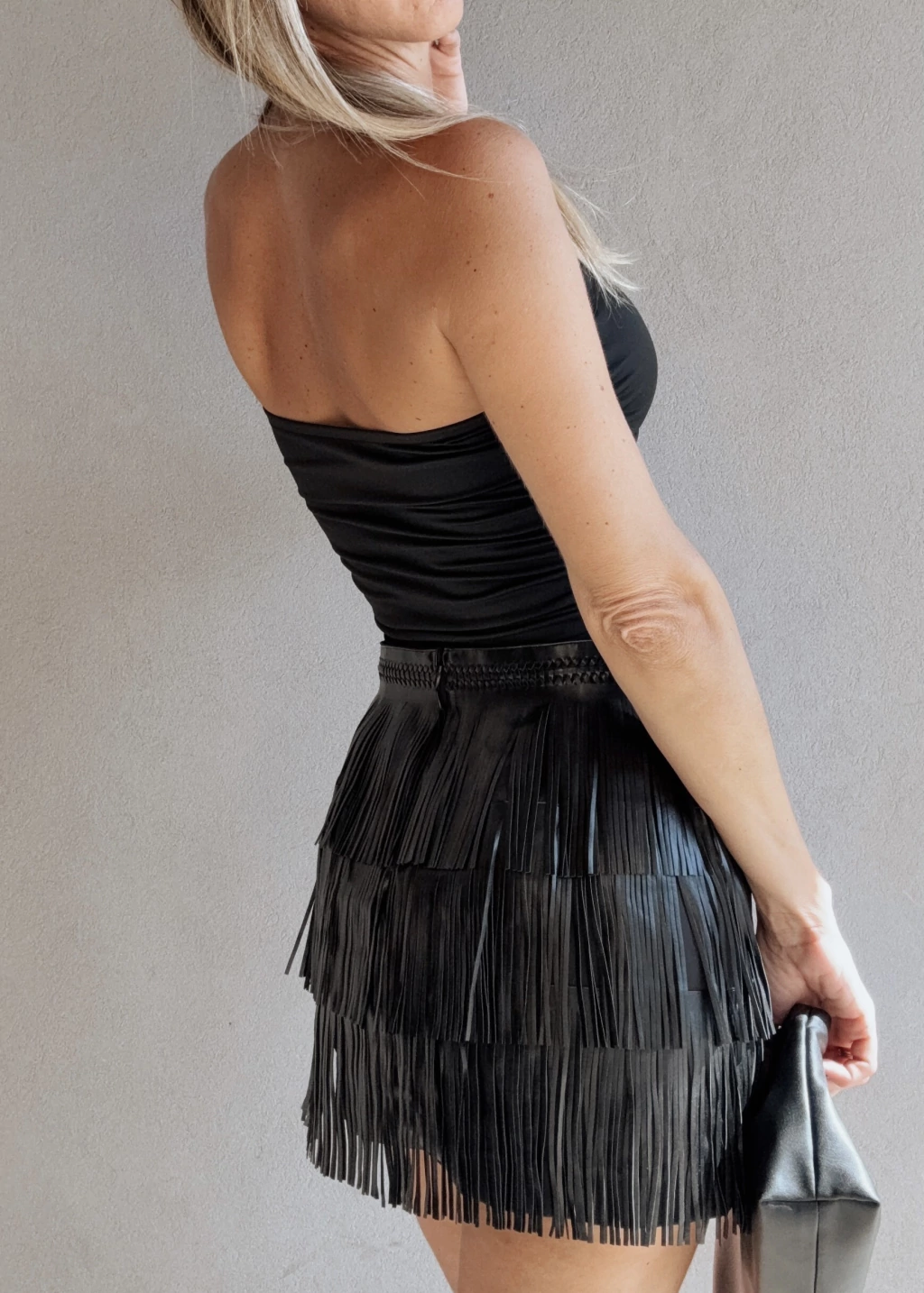 Mini confeccionada en cuero Pu con capas de flecos largos y móviles que generan caída, movimiento y efecto visual texturado. Cintura con detalle trenzado artesanal al tono, cierre invisible posterior y interior forrado para mayor comodidad. Corte al cuerpo sin ser rígido. Ideal para looks nocturnos, fiestas y outfits con power.