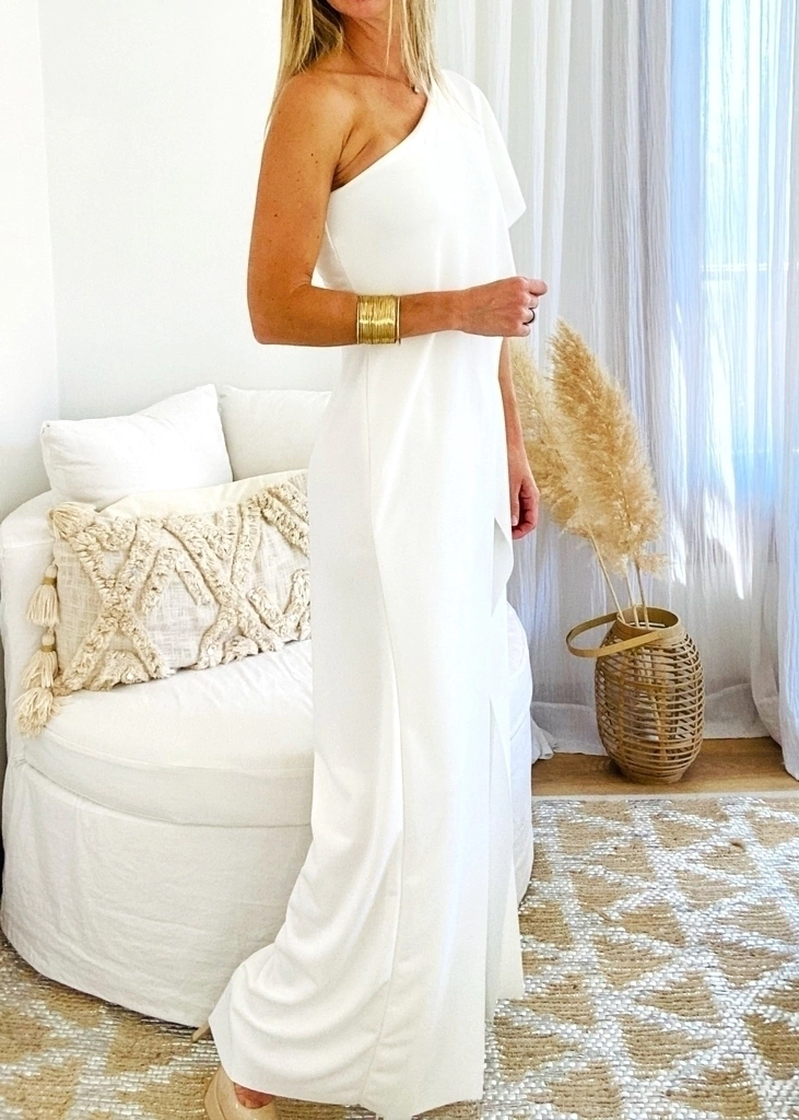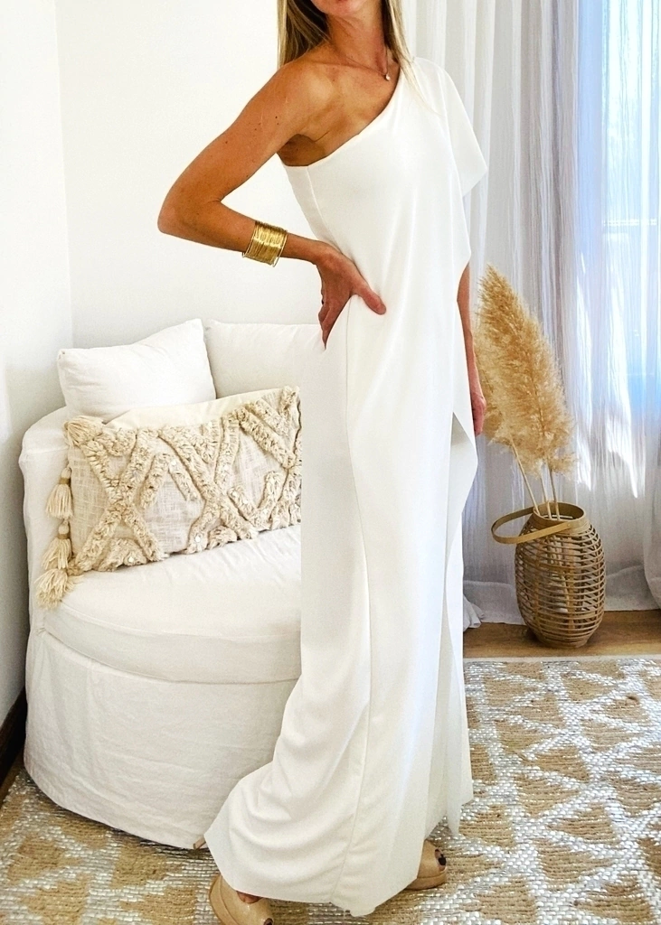 Mono de un hombro con faldón, tipo palazo con tajos superpuestos. Al ser elastizado, se adapta a todo tipo de cuerpos. Ruedo al corte.