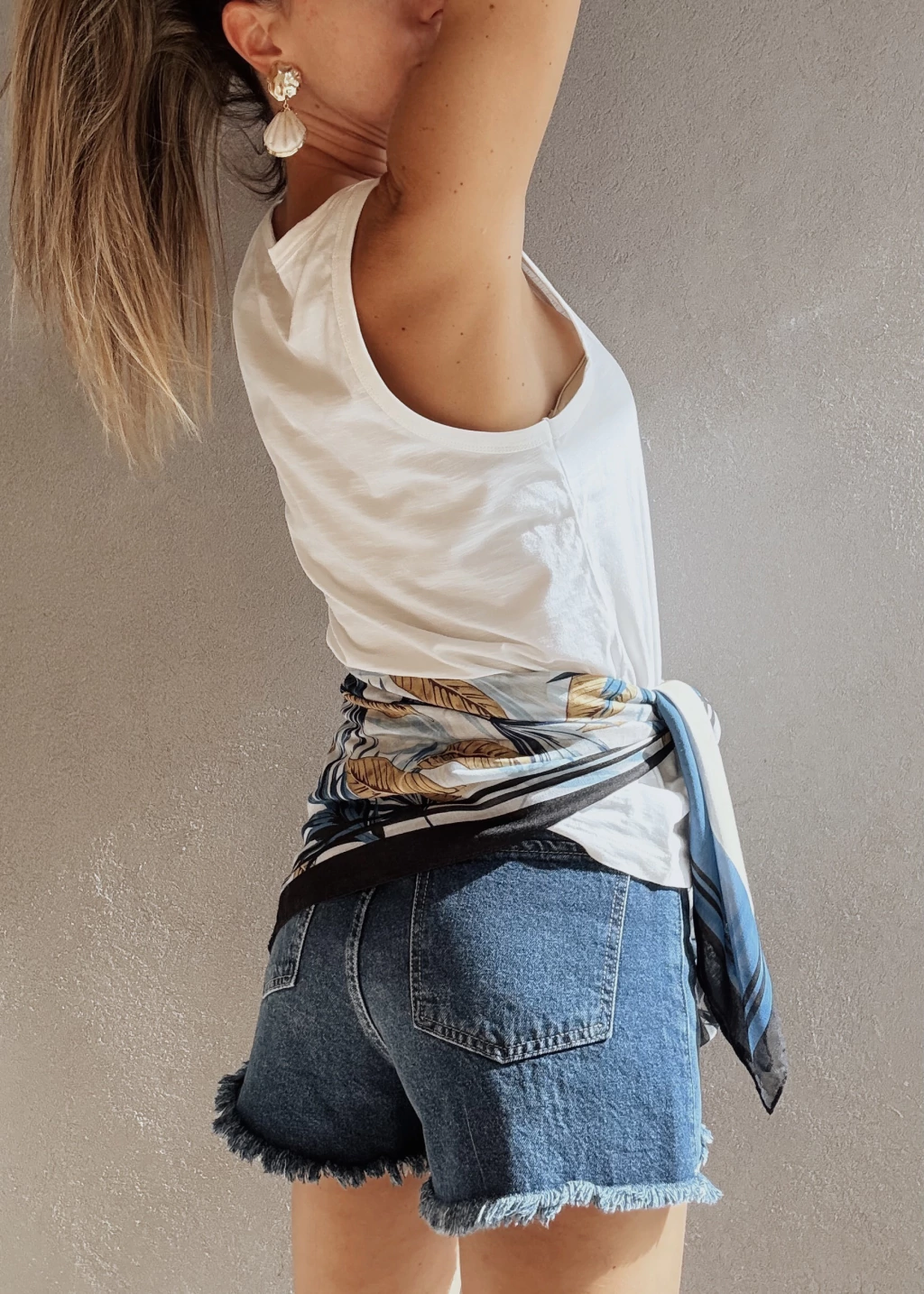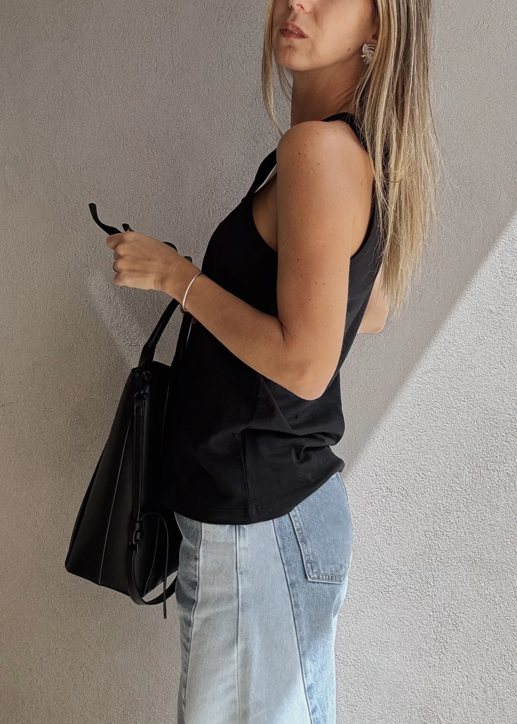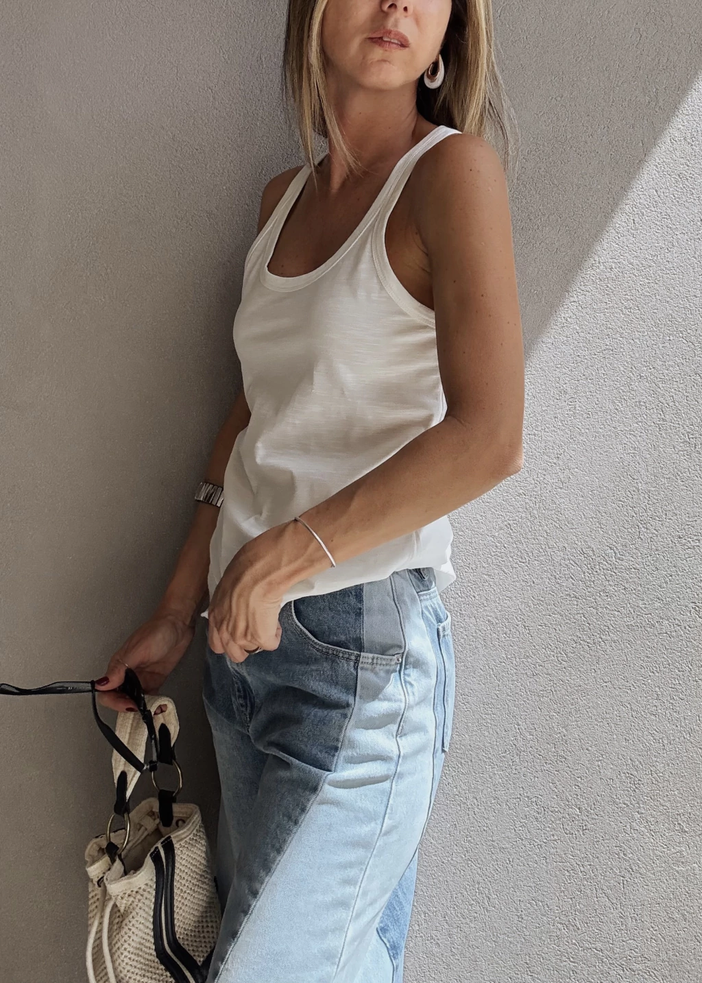 Musculosa escotada con escote profundo redondo, espalda tipo nadadora y sisa cavada. Corte evase. Envivado ancho en sisas y escote.