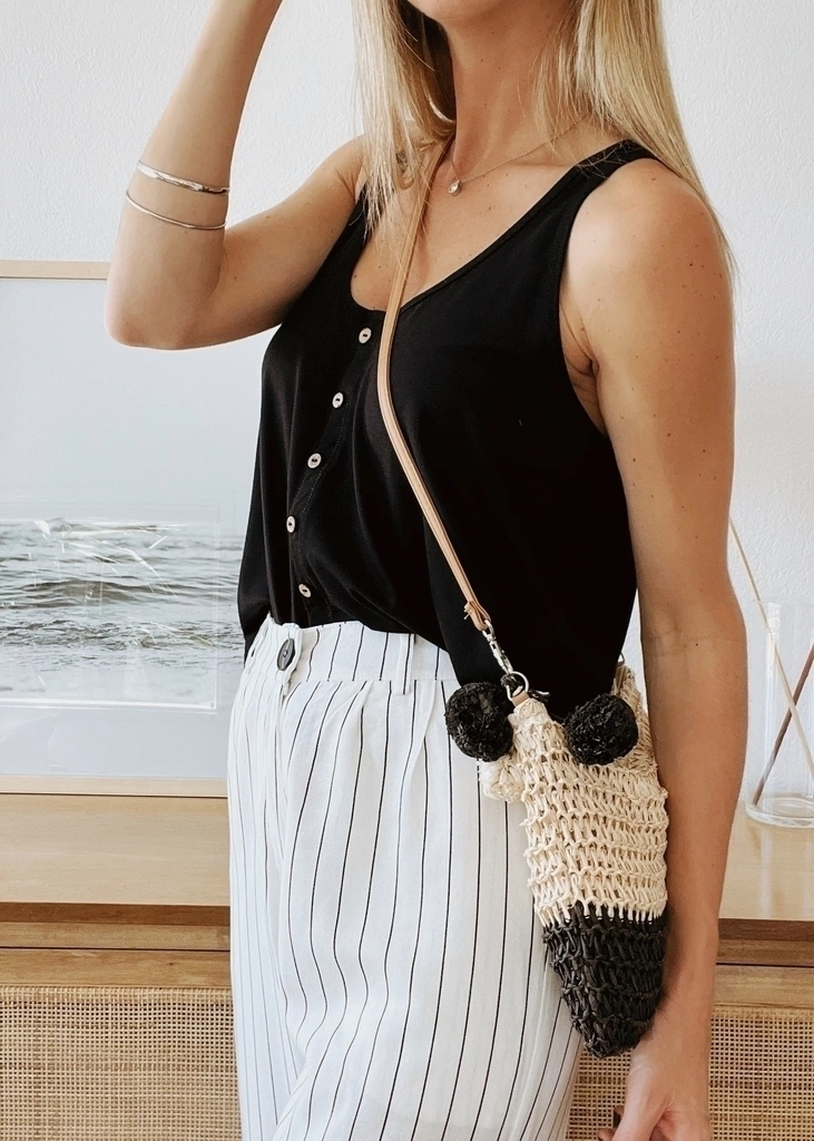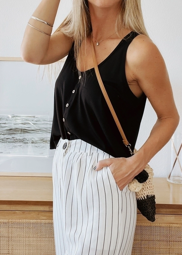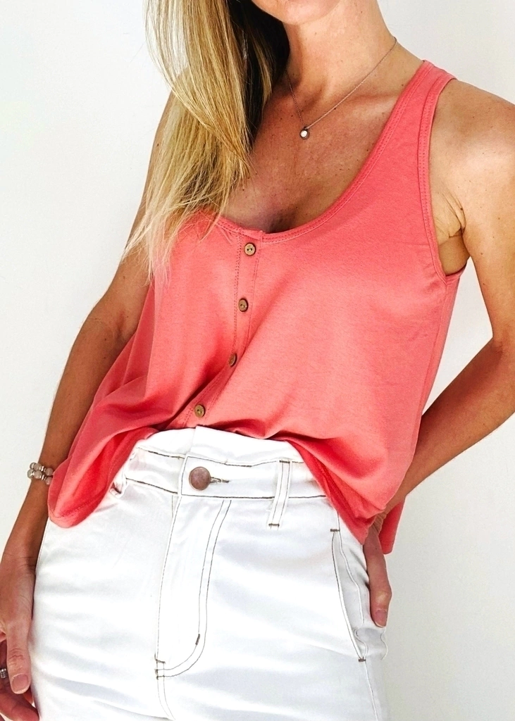 Amplia musculosa cortita con escote redondo con botones falsos al frente. Levemente más larga atrás.