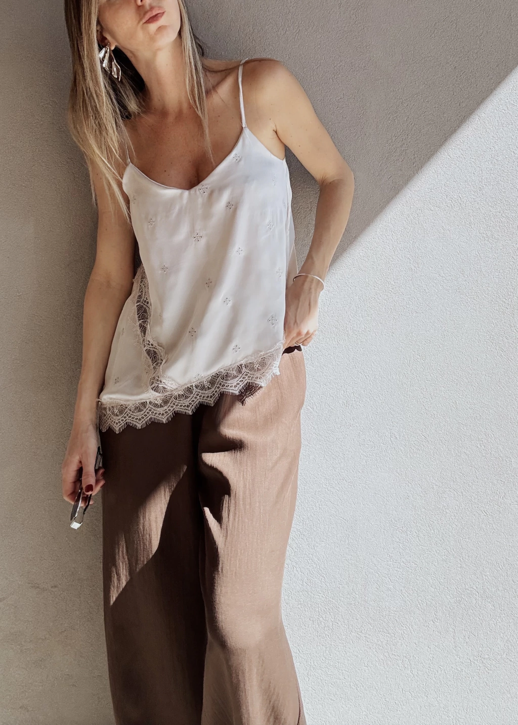 Musculosa lencera con breteles finos no regulables, detalle de puntilla delicada en el ruedo y más. Posee pequeñas flores bordadas. Corte evase con caída liviana y terminación en pico.